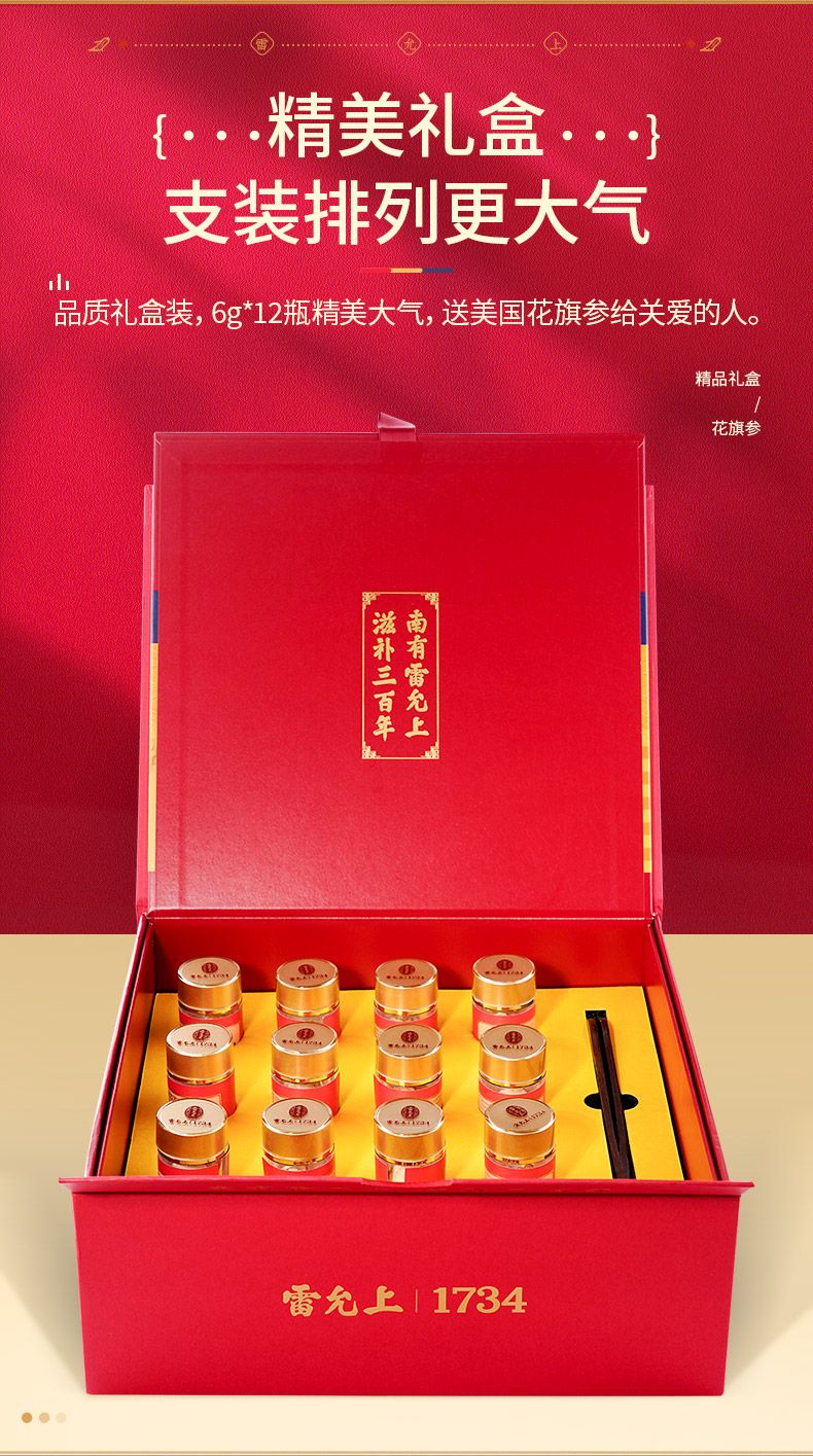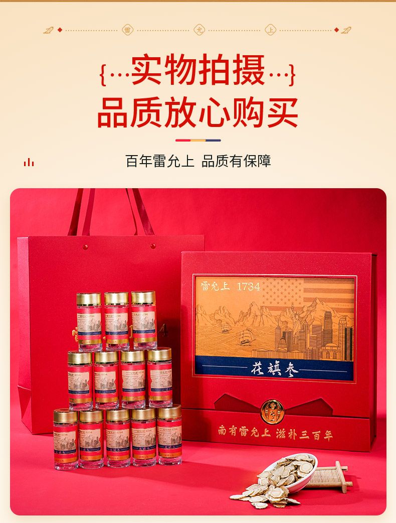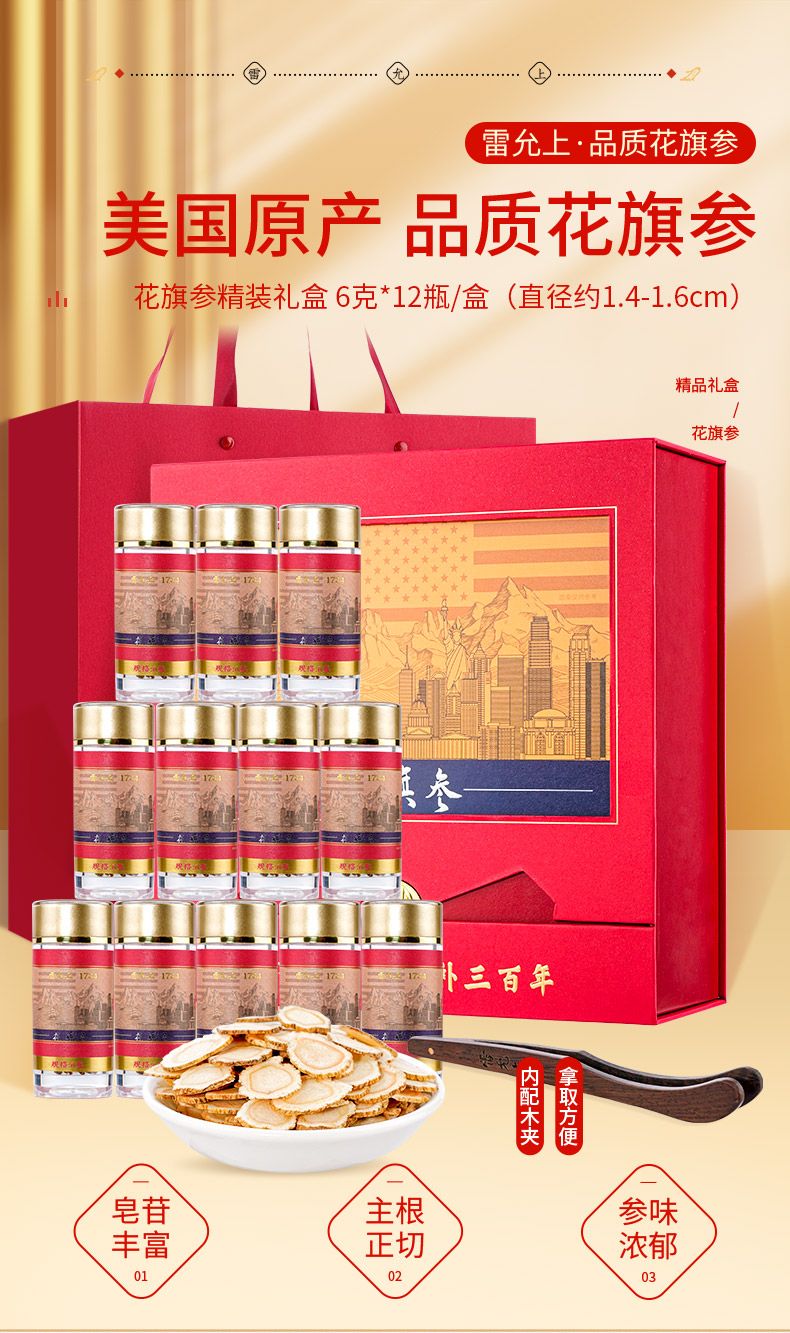 商品名称:雷允上 西洋参片72g礼盒(6克*12瓶) 美国进口花旗参切片含片约1.4-1.6cm 1盒装