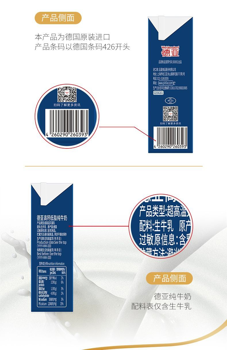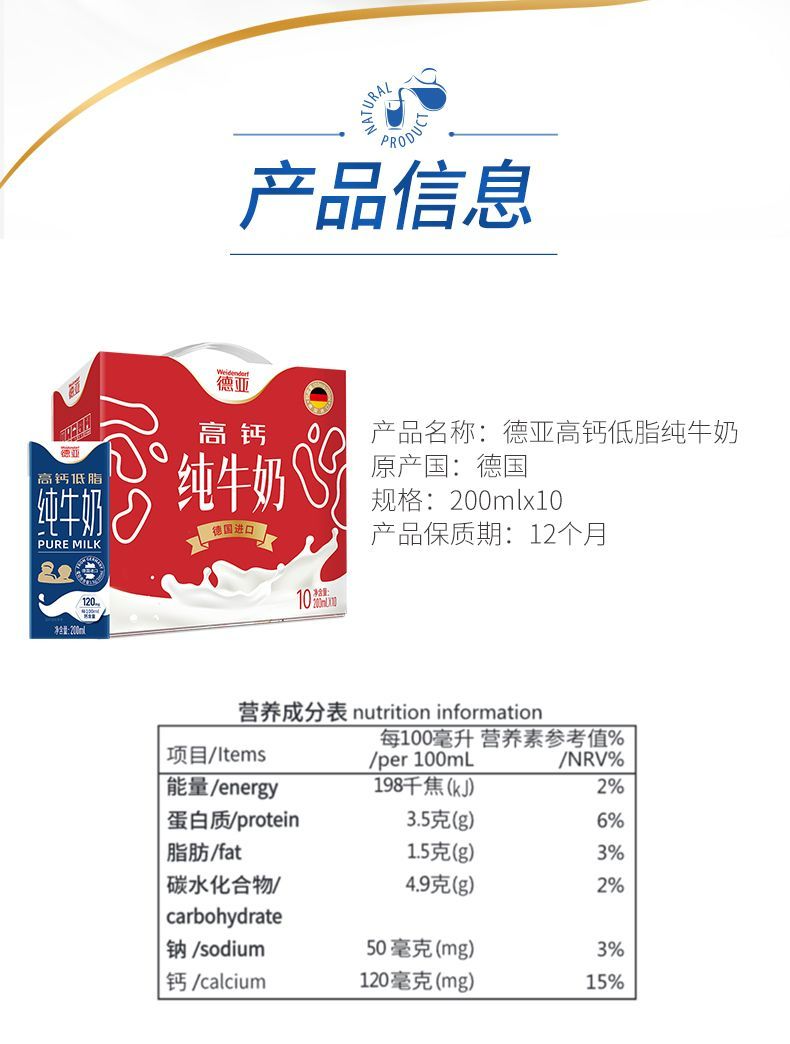商品名称:德亚 德国进口低脂高钙纯牛奶 200ml*10 礼盒