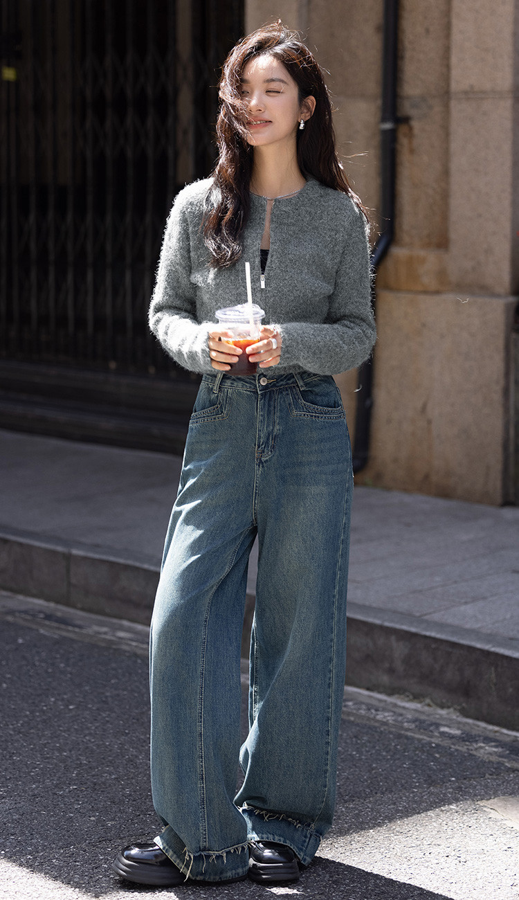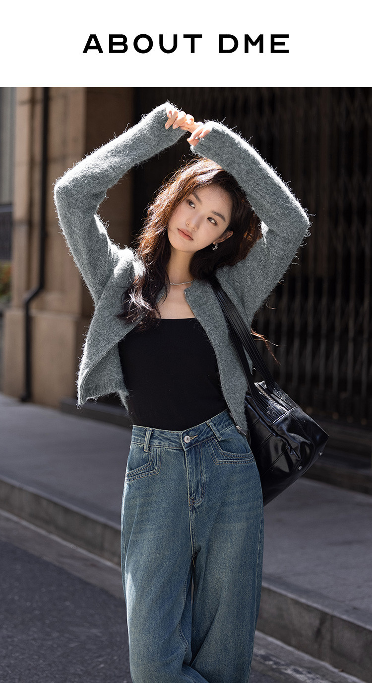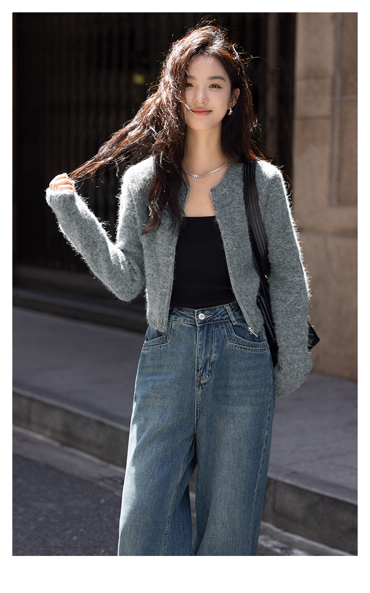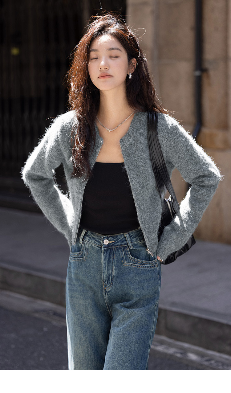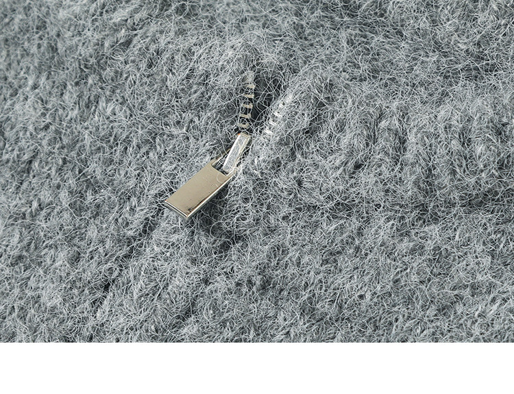 【灰色毛绒感针织外套】冬圆领开门襟拉链设计长袖针织衫 936130