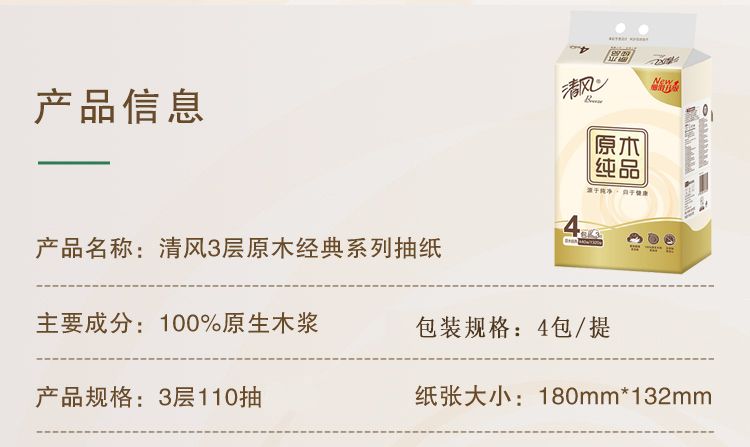 商品名称:"清风抽纸原木纯品3层 110抽1提4包 【BR43NC】"