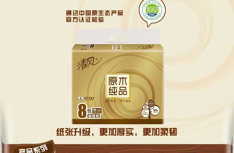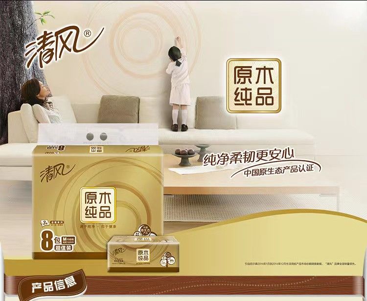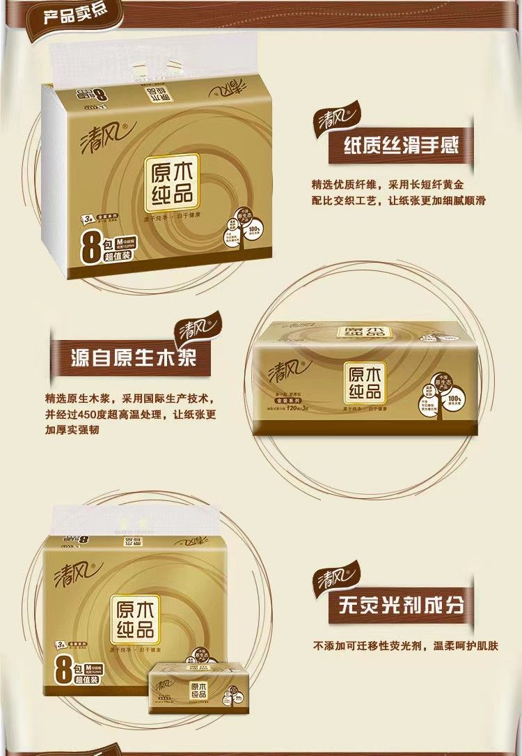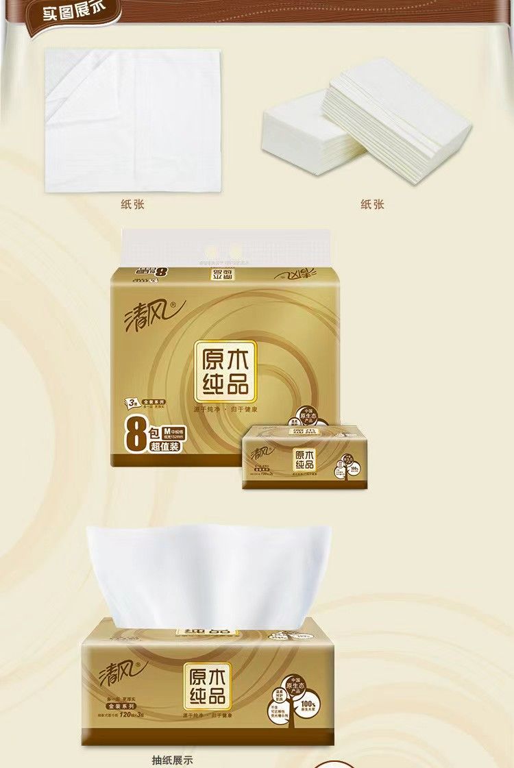"清风抽纸原木金装3层120 抽8包中规格M码抽纸 【BR484】"