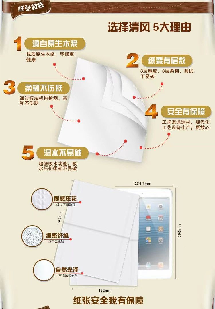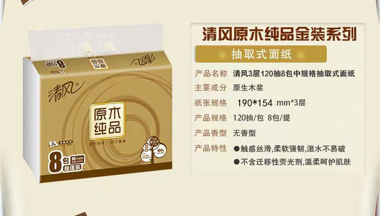 商品名称:"清风抽纸原木金装3层120 抽8包中规格M码抽纸 【BR484】"