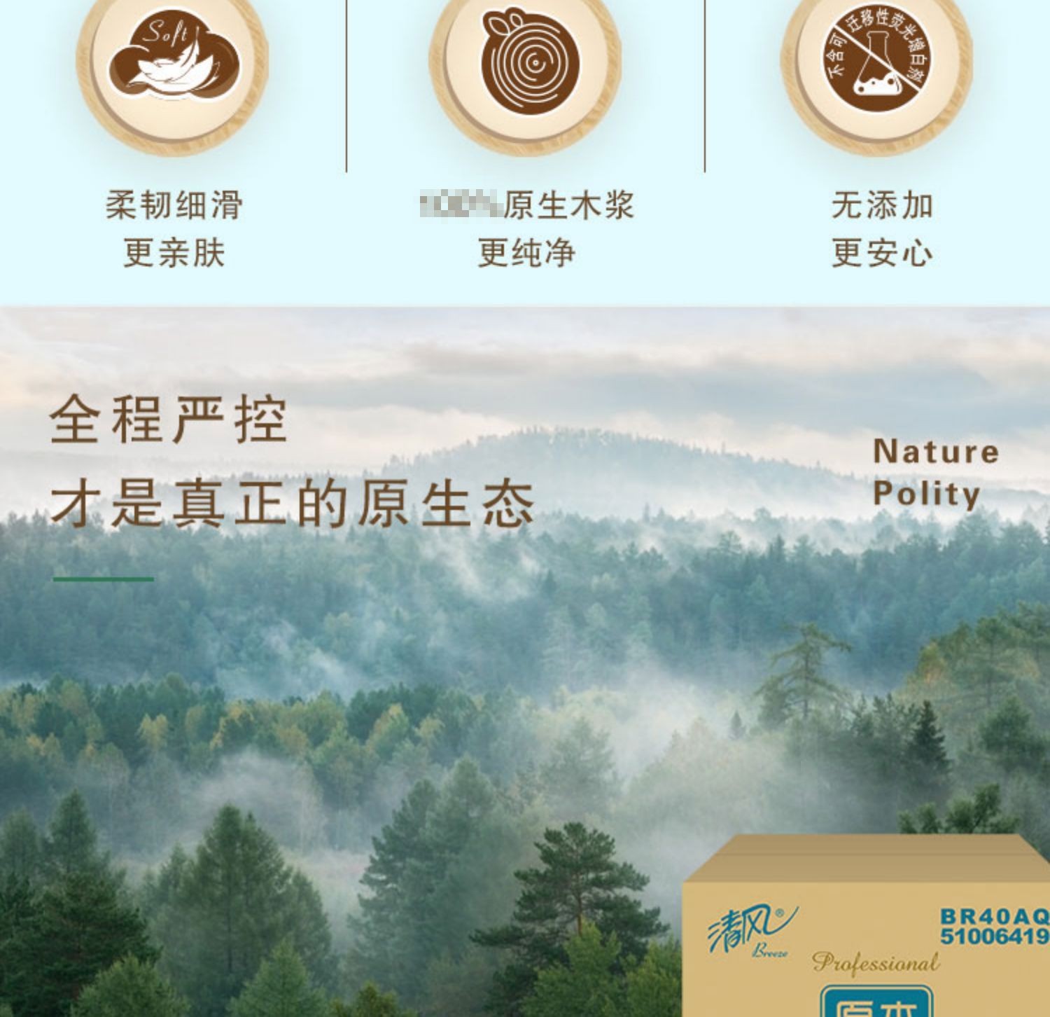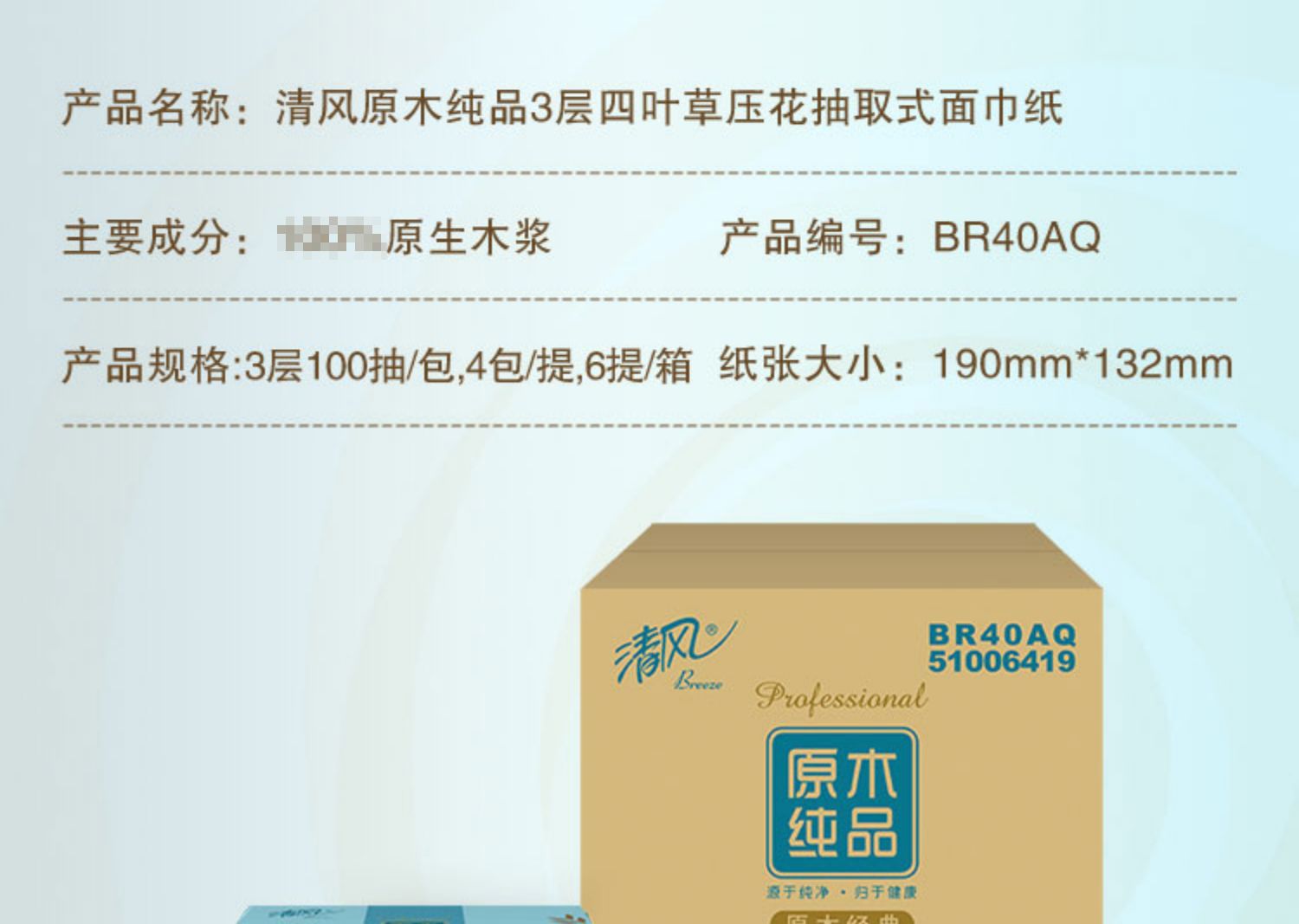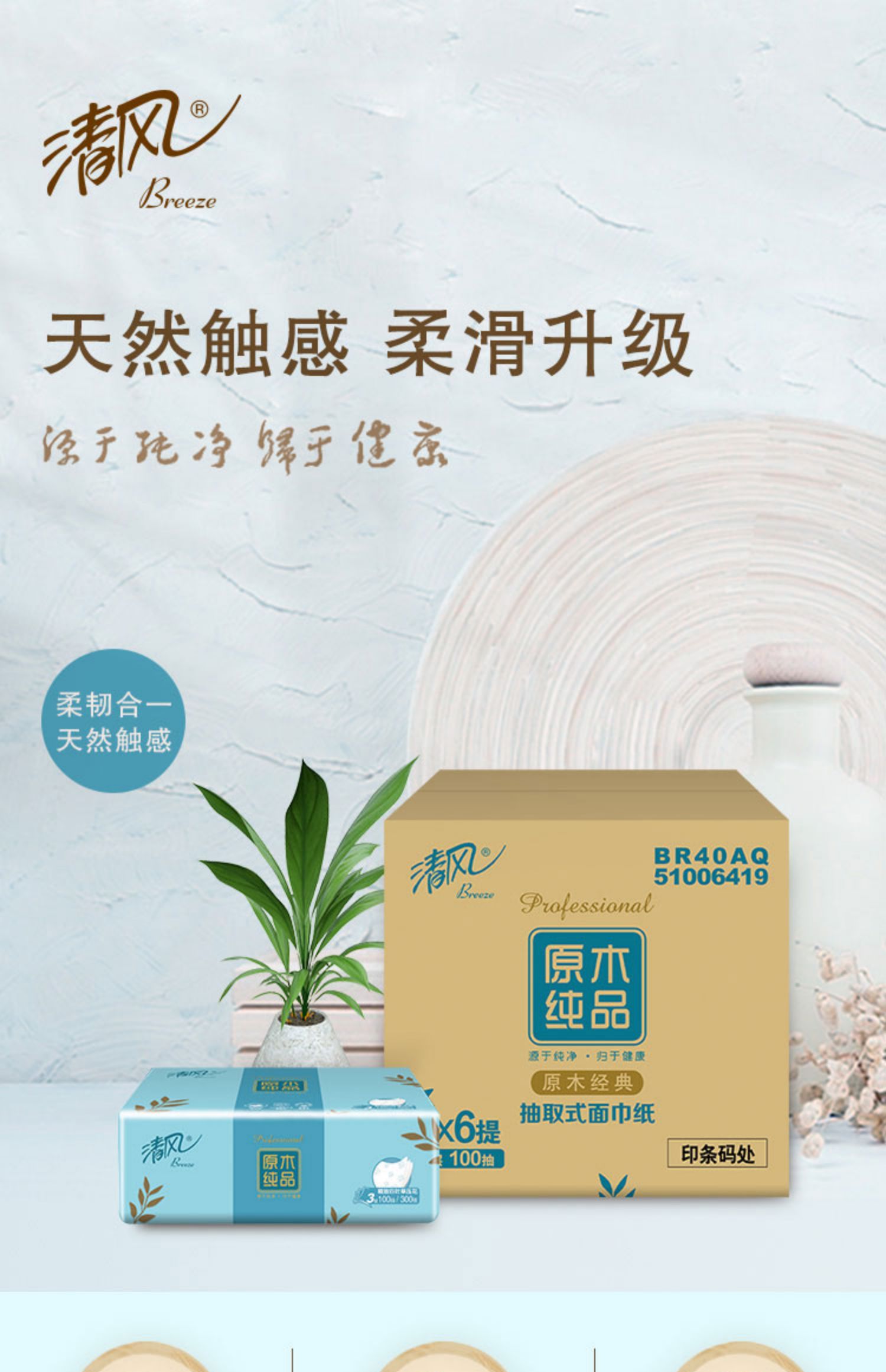商品名称:"清风抽纸原木纯品3层 100抽6提24包整箱 【BR40AQ】"