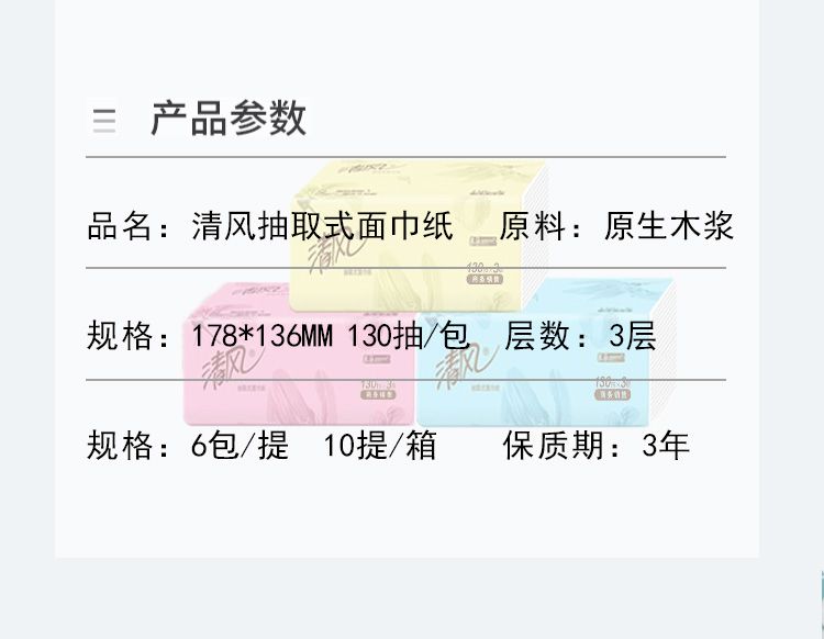 商品名称:"清风糖果色抽纸商用原木 纯品3层130抽1提6包抽取 式面纸巾【BR63AT】"
