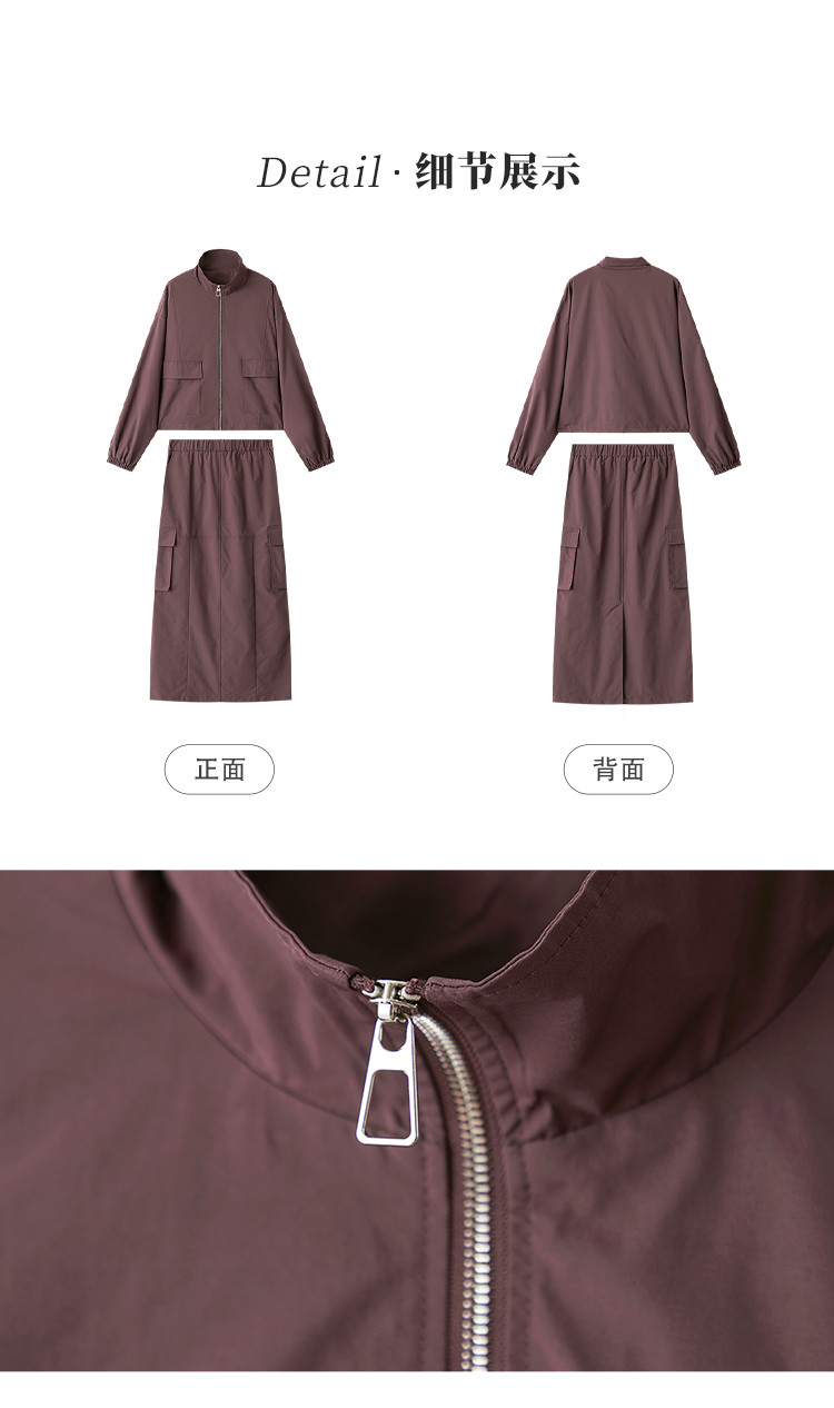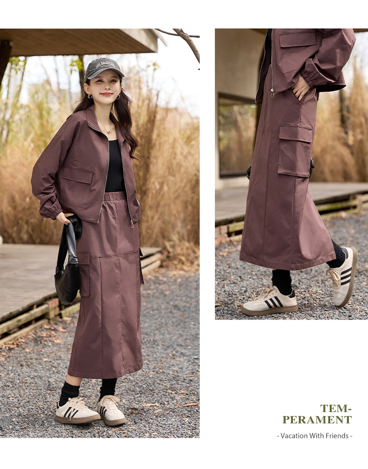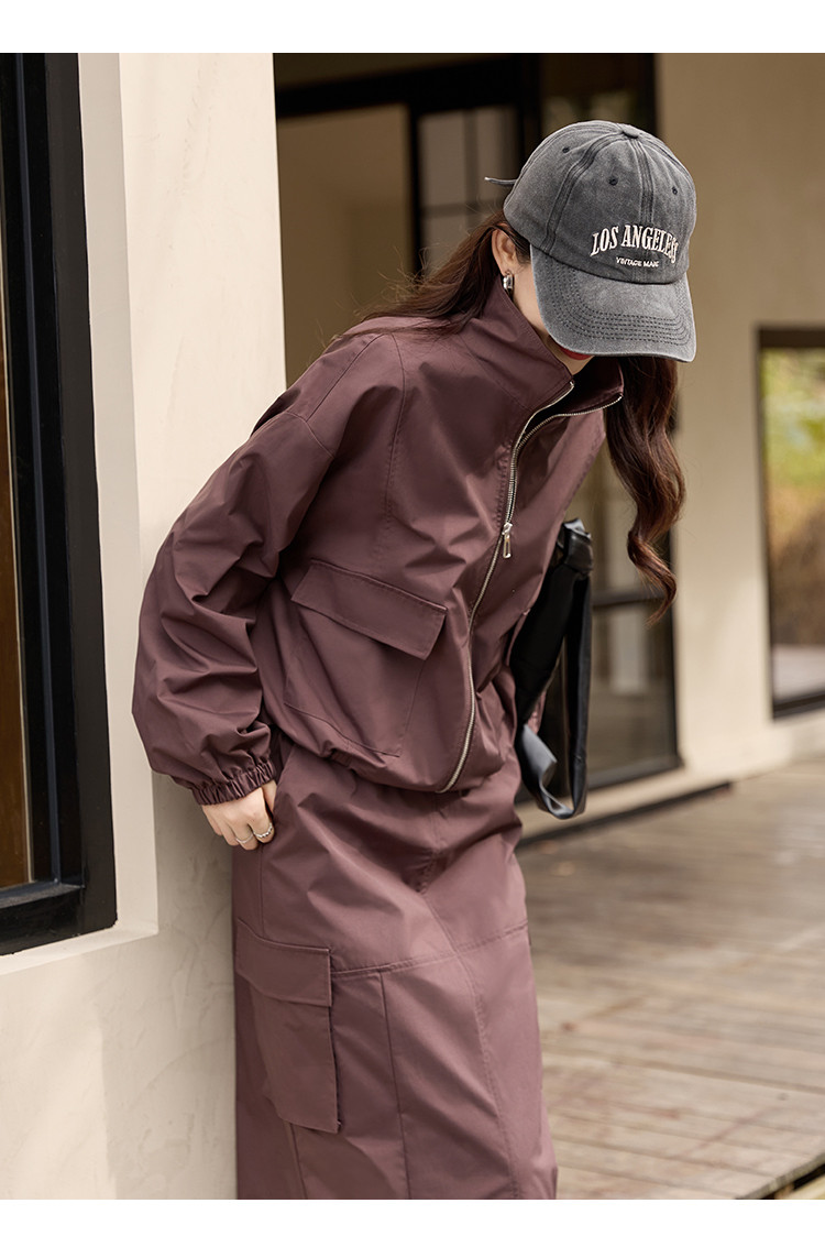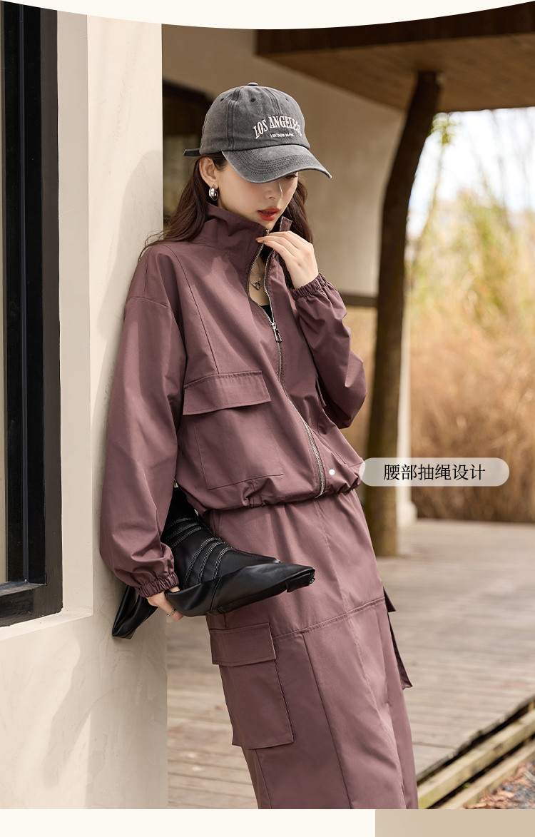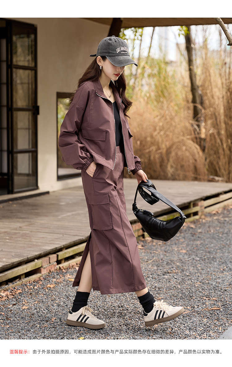 商品名称:【又A又飒】工装风立领夹克休闲半裙两件套后开叉修身女式套装 189953