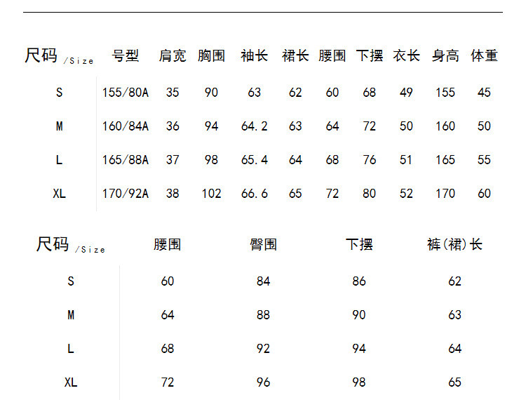 | 尺码 | 裙长(cm) | 肩宽(cm) | 袖长(cm) | 上装号型 | 下装号型 | 衣长(cm) | 腰围(cm) | 臀围(cm) | 胸围(cm) | 号型 |