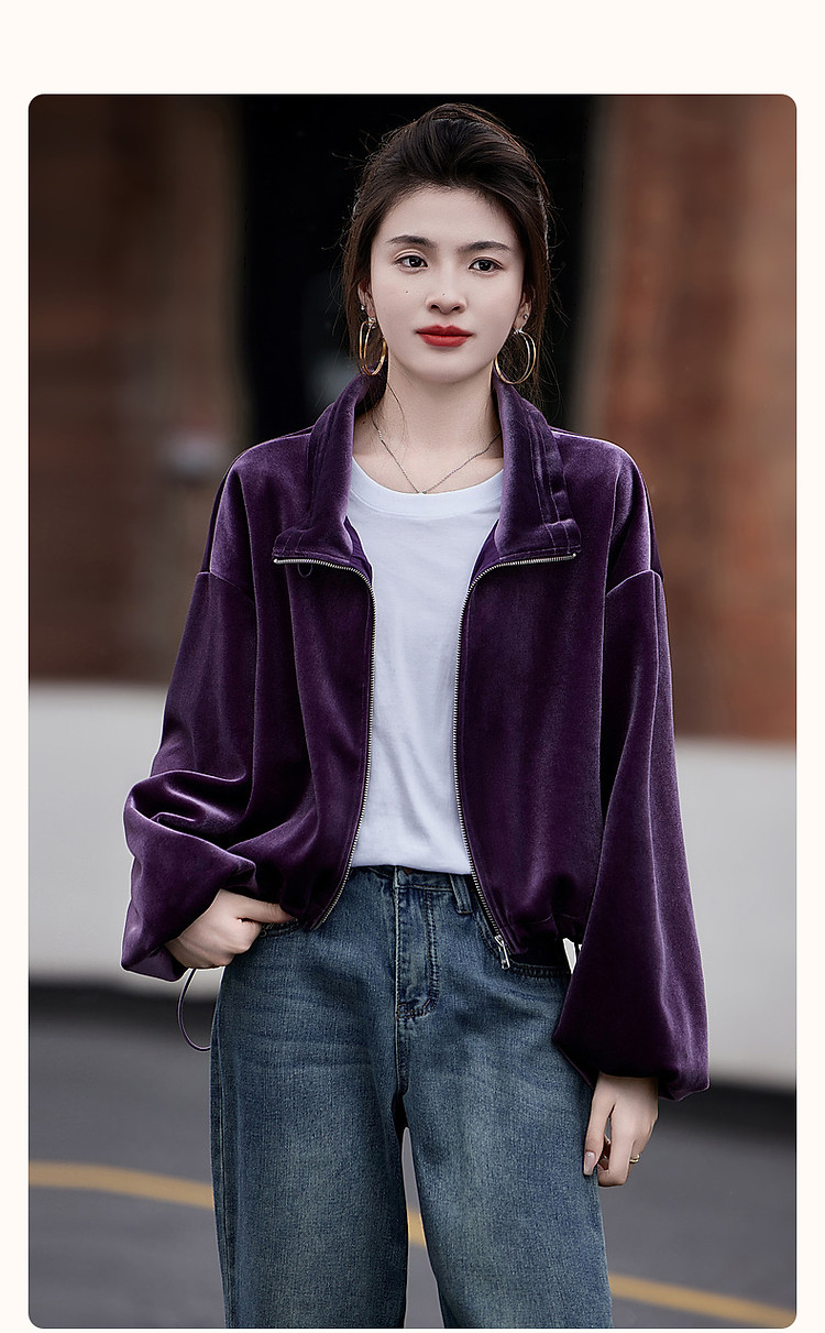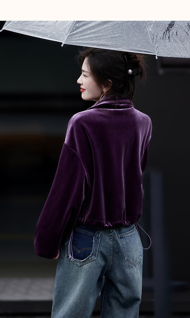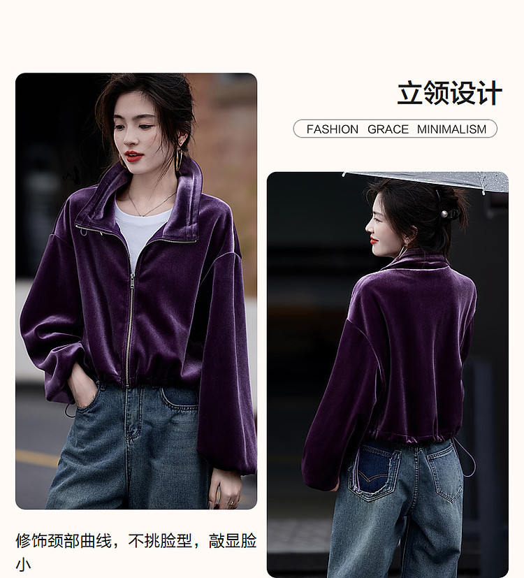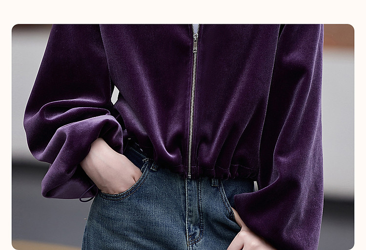 【摩登奢享】春秋光泽典雅丝绒立领灯笼袖可调节抽绳下摆外套女 694465