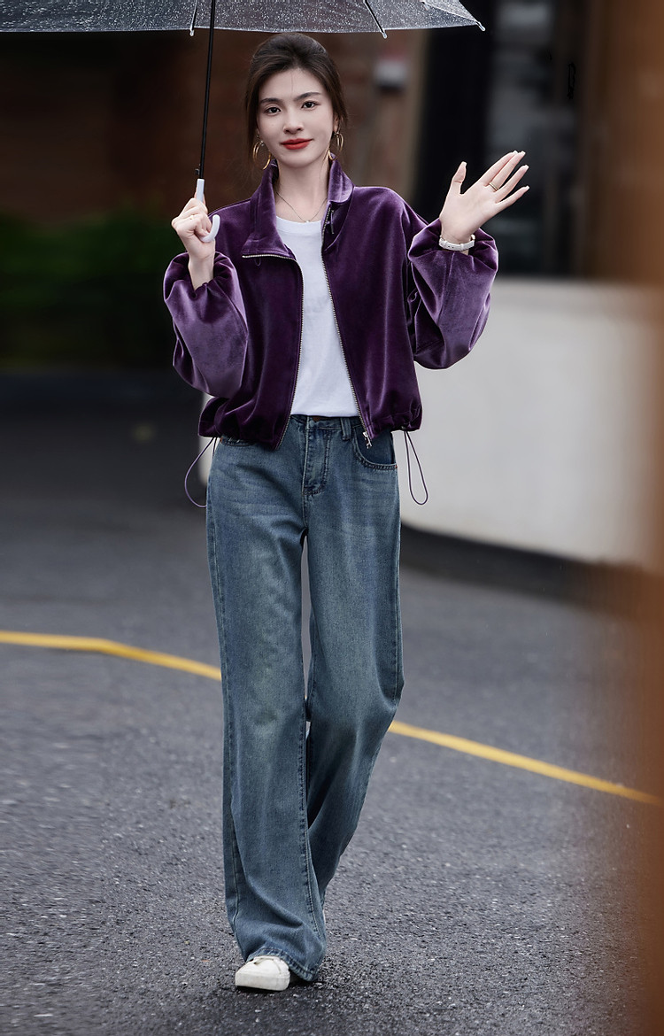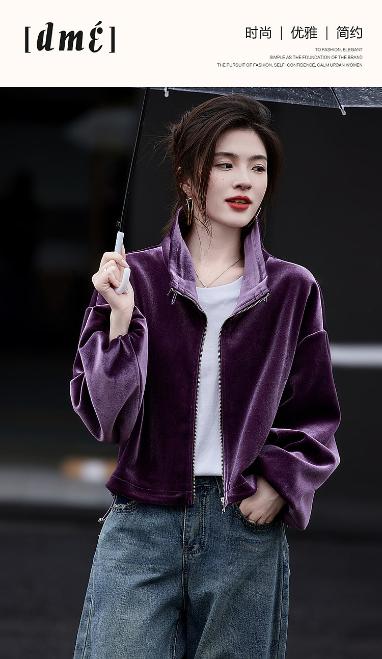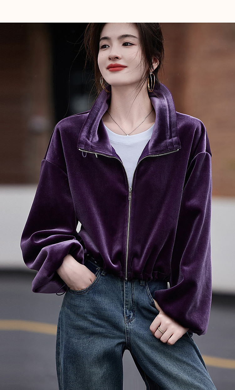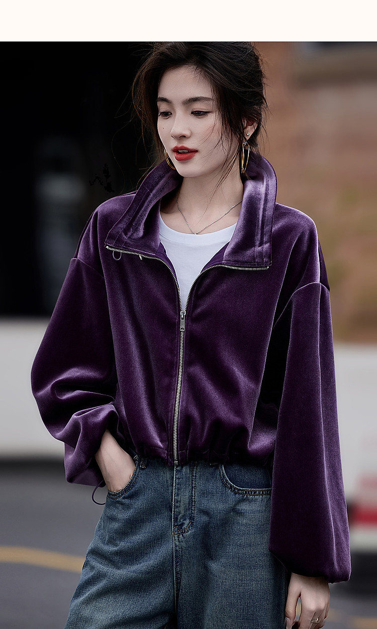 【摩登奢享】春秋光泽典雅丝绒立领灯笼袖可调节抽绳下摆外套女 694465