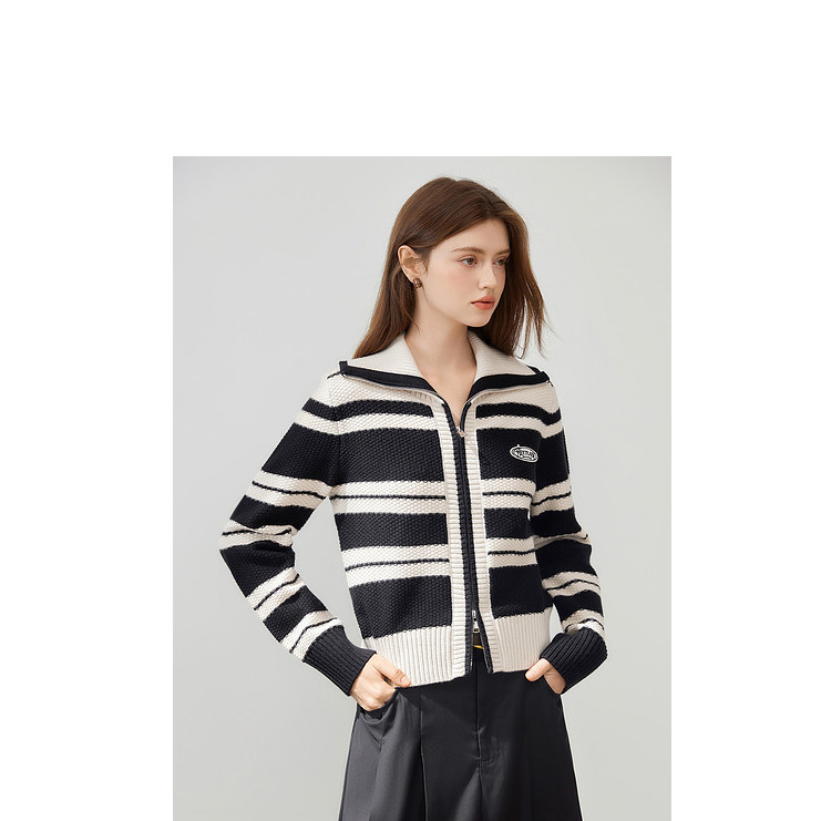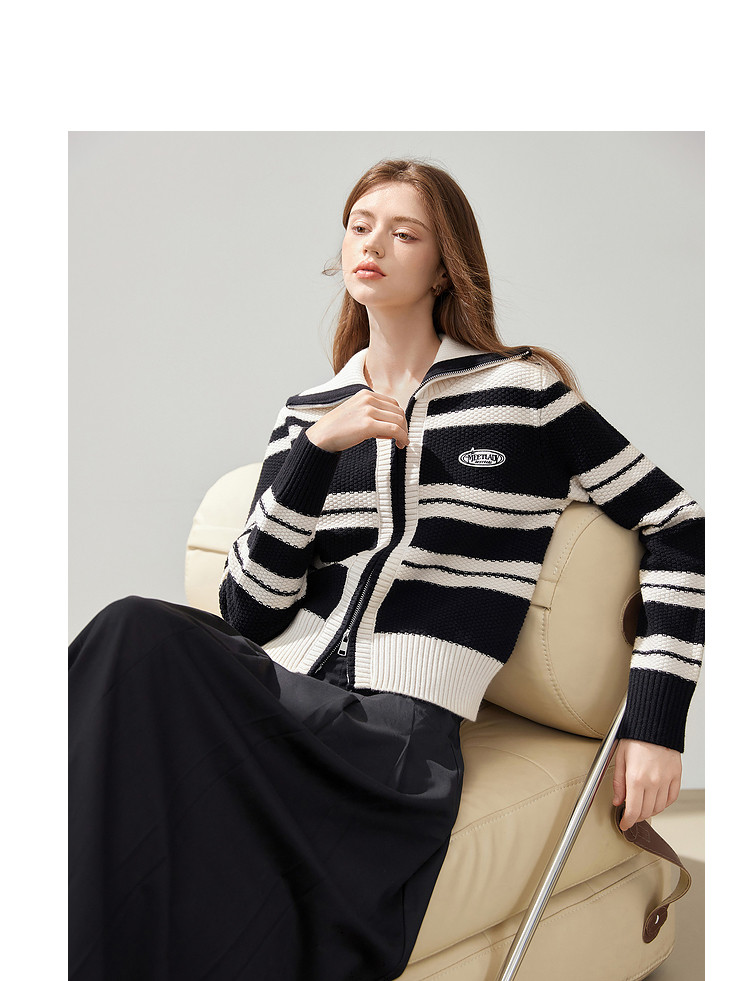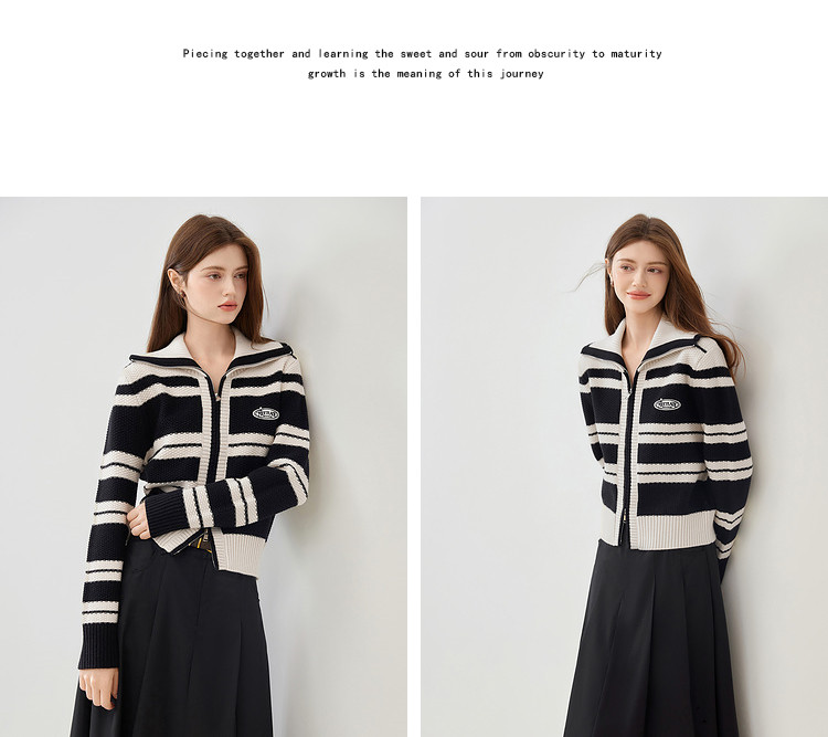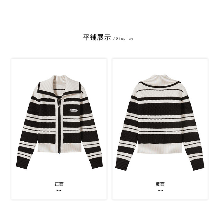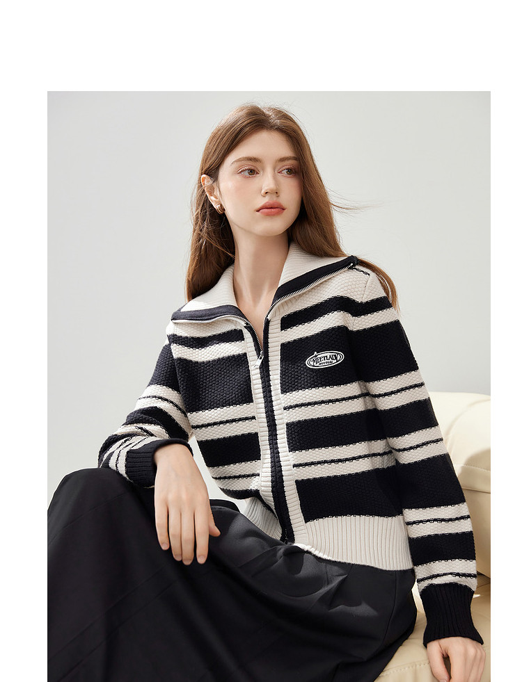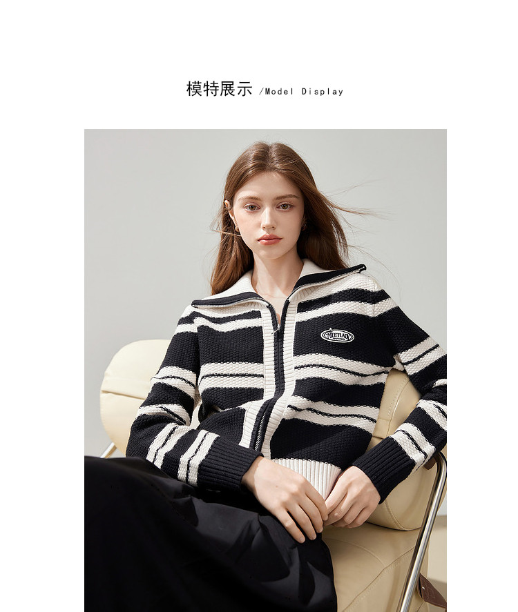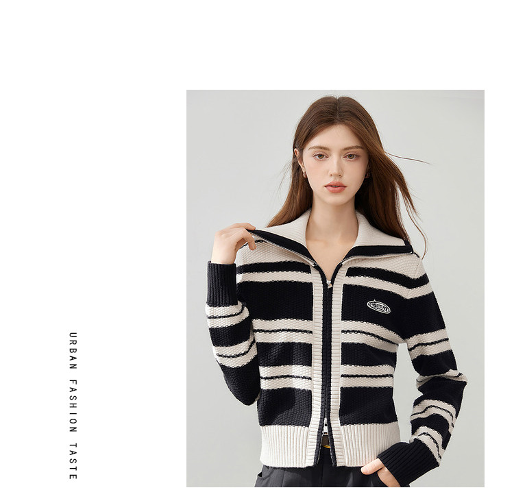 商品名称:【2024秋冬】简约百搭翻领条纹针织开衫女时尚休闲毛衣外套 383060