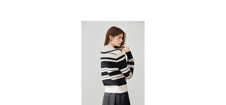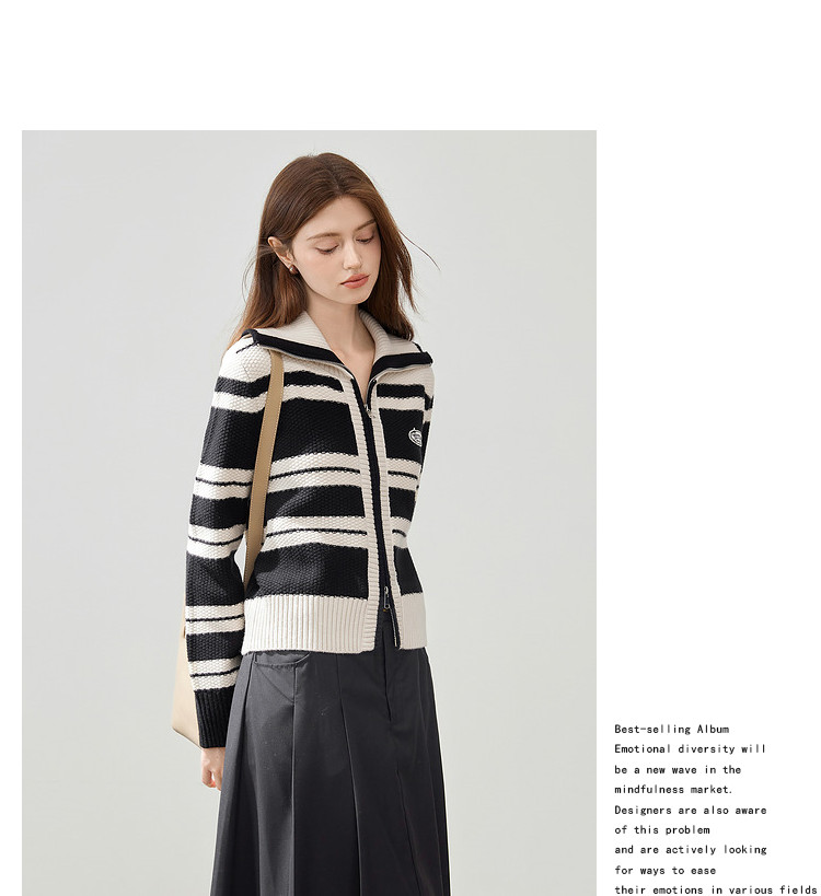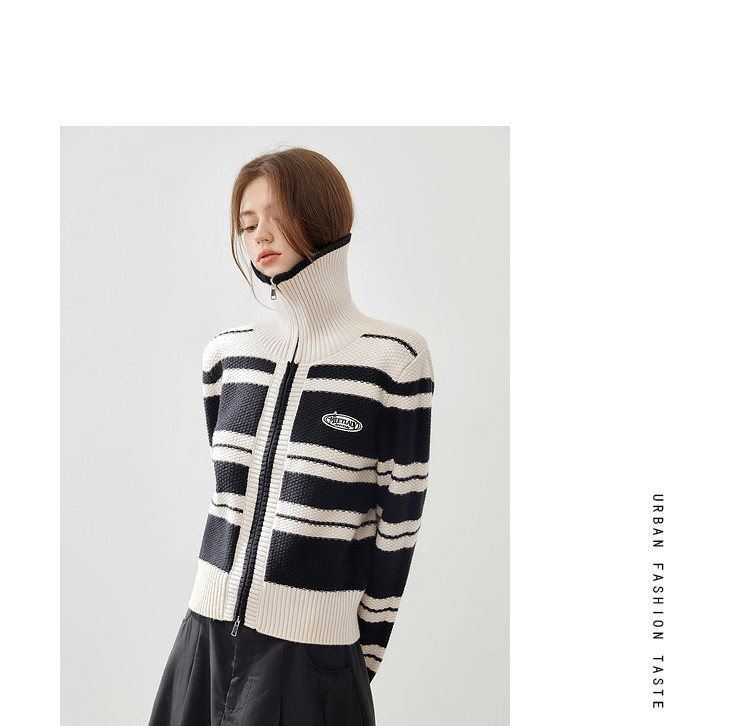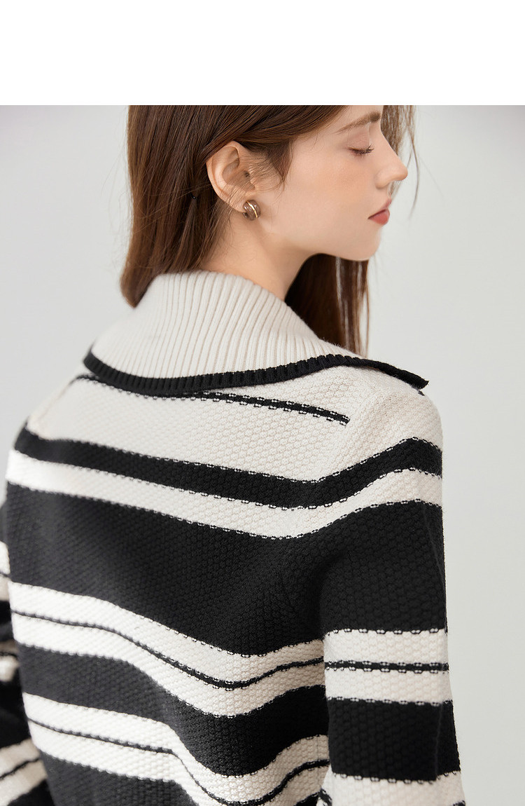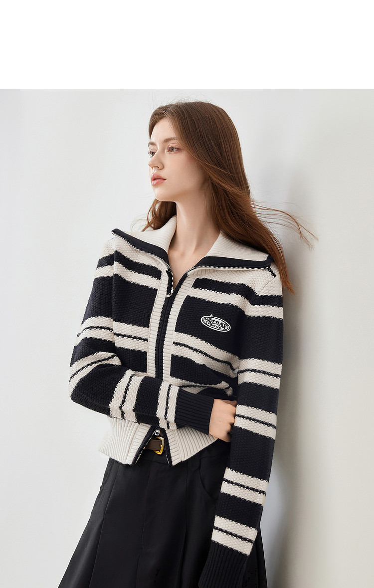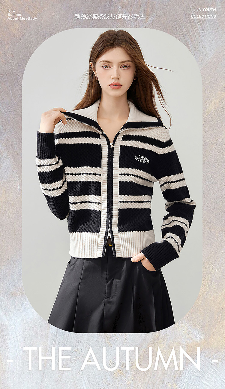 商品名称:【2024秋冬】简约百搭翻领条纹针织开衫女时尚休闲毛衣外套 383060