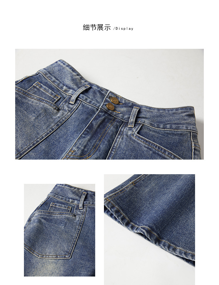 撞色毛边阔腿牛仔裤女春秋高腰显瘦单排扣水洗长裤 607123
