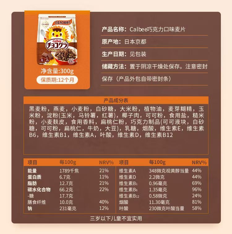 商品名称:日本进口Calbee卡乐比麦片巧克力口味300g谷物即食免煮代早餐