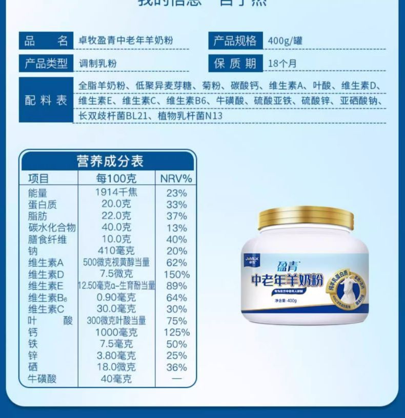 卓牧(JOMILK)盈青中老年羊奶粉 富含益生菌 400g/罐