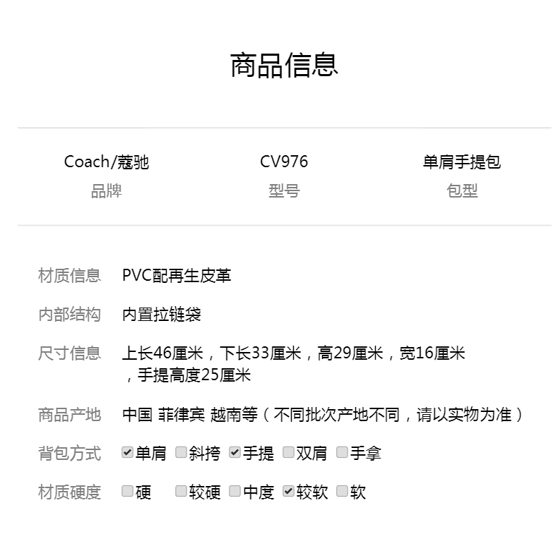 商品名称:COACH 奥莱款女士PVC单肩手提包 CV976IMXAQ