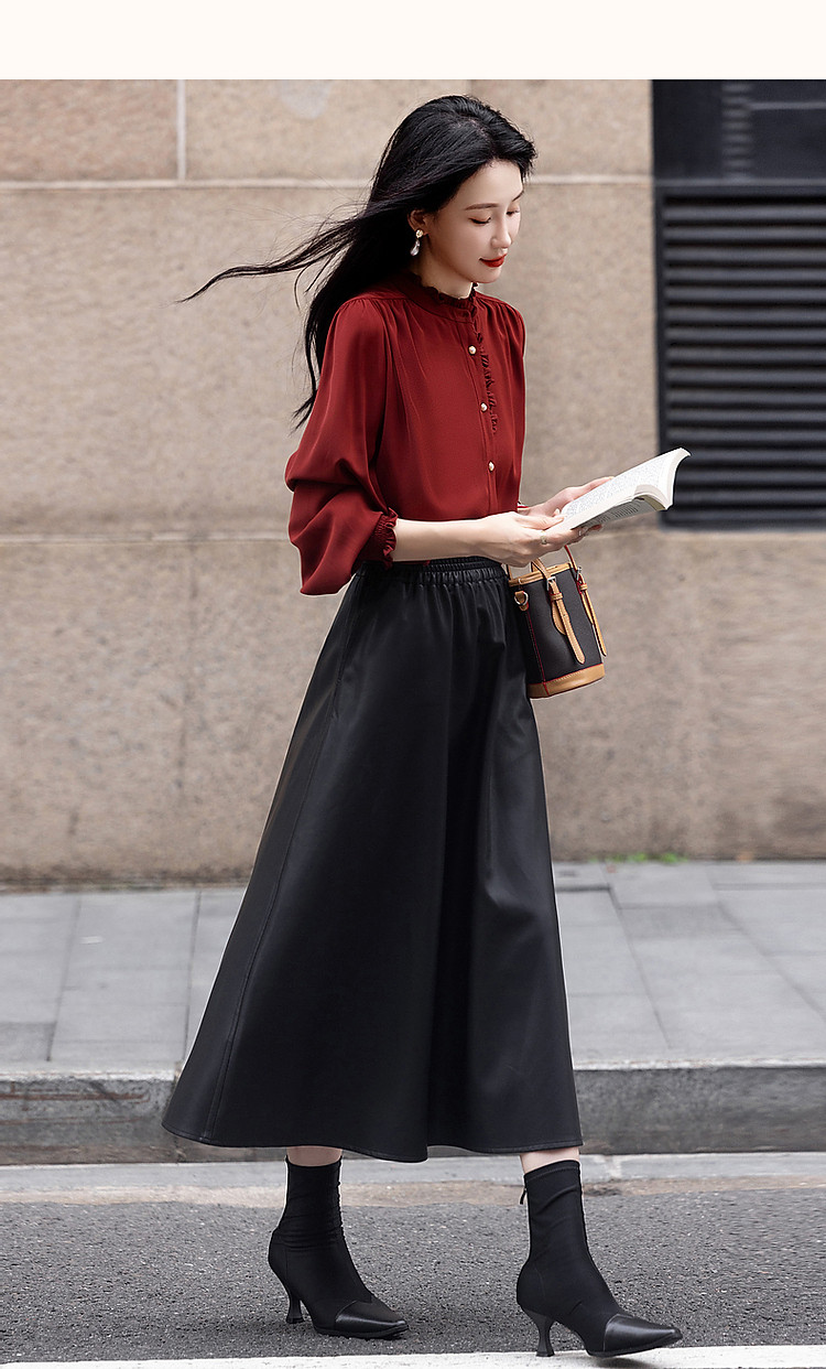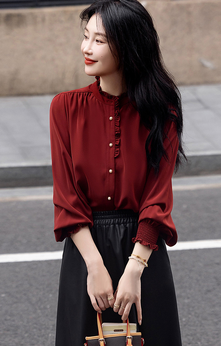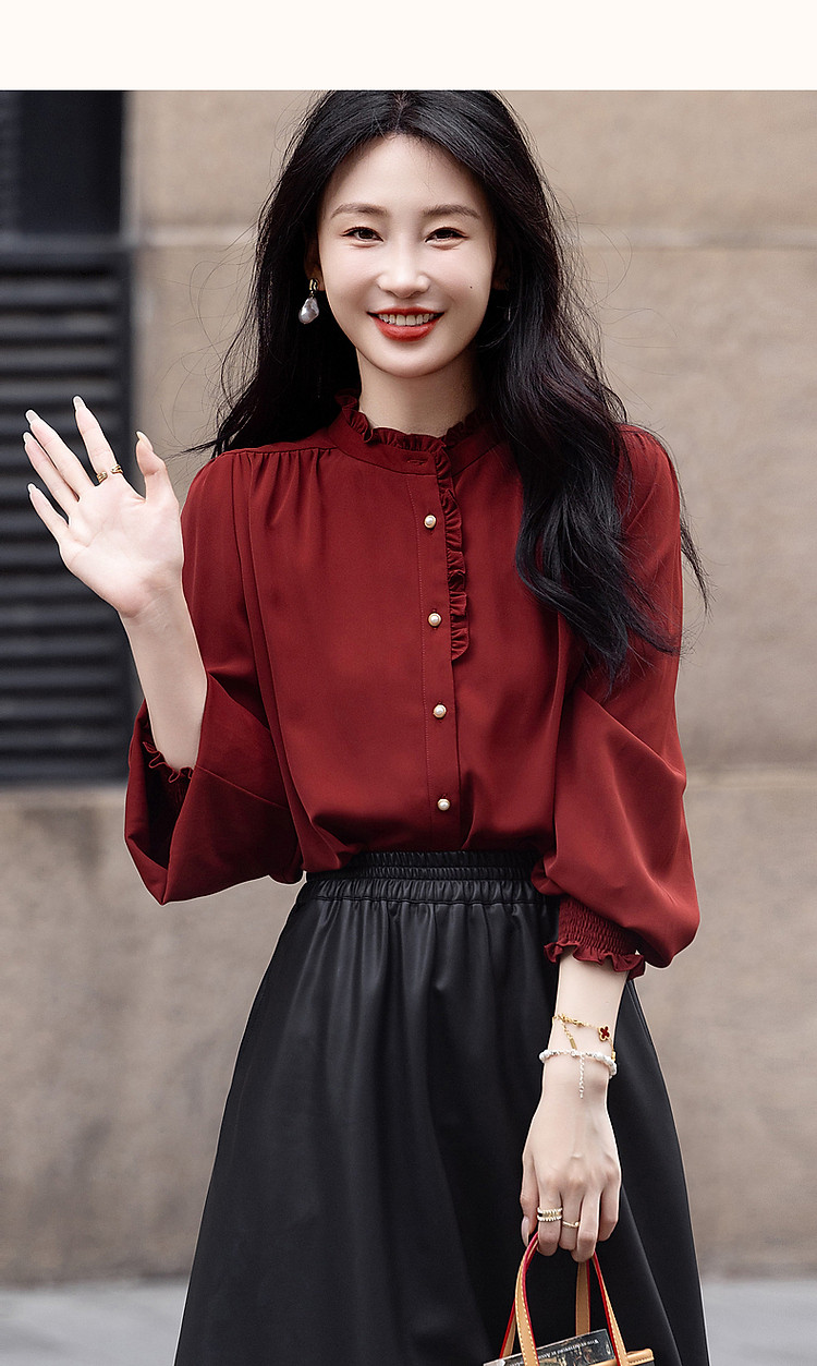 【抓皱亮感衬衫】春秋法式女人味荷叶边立领抽褶气质衬衣女装上衣 127297