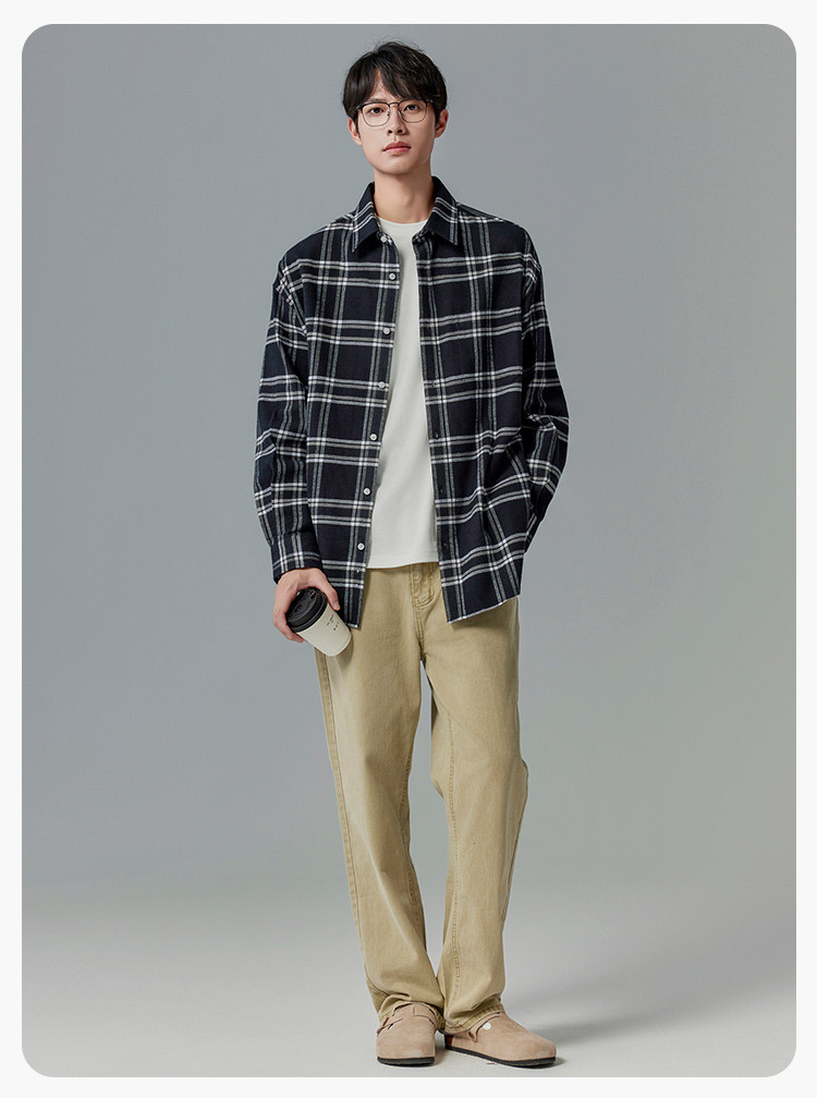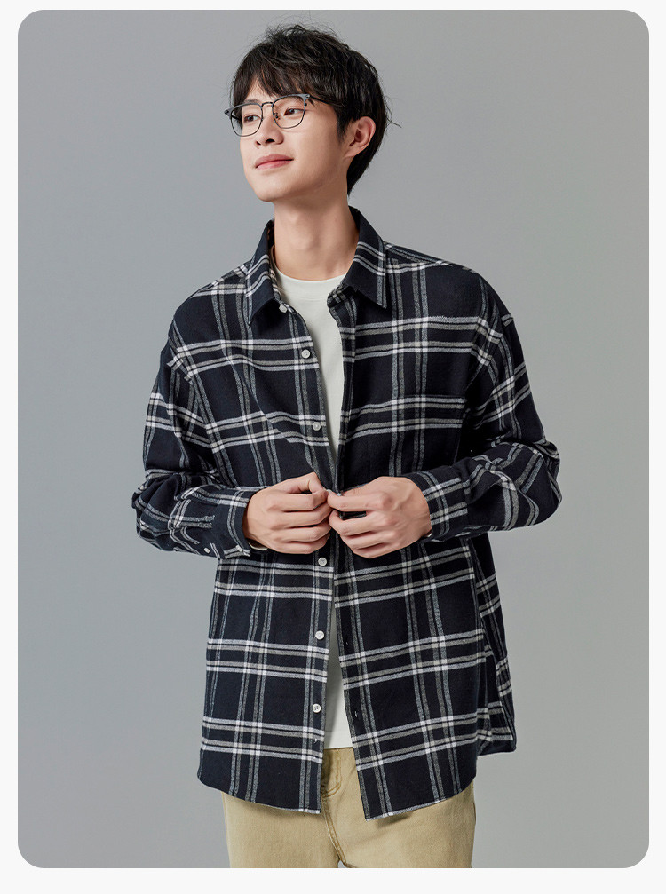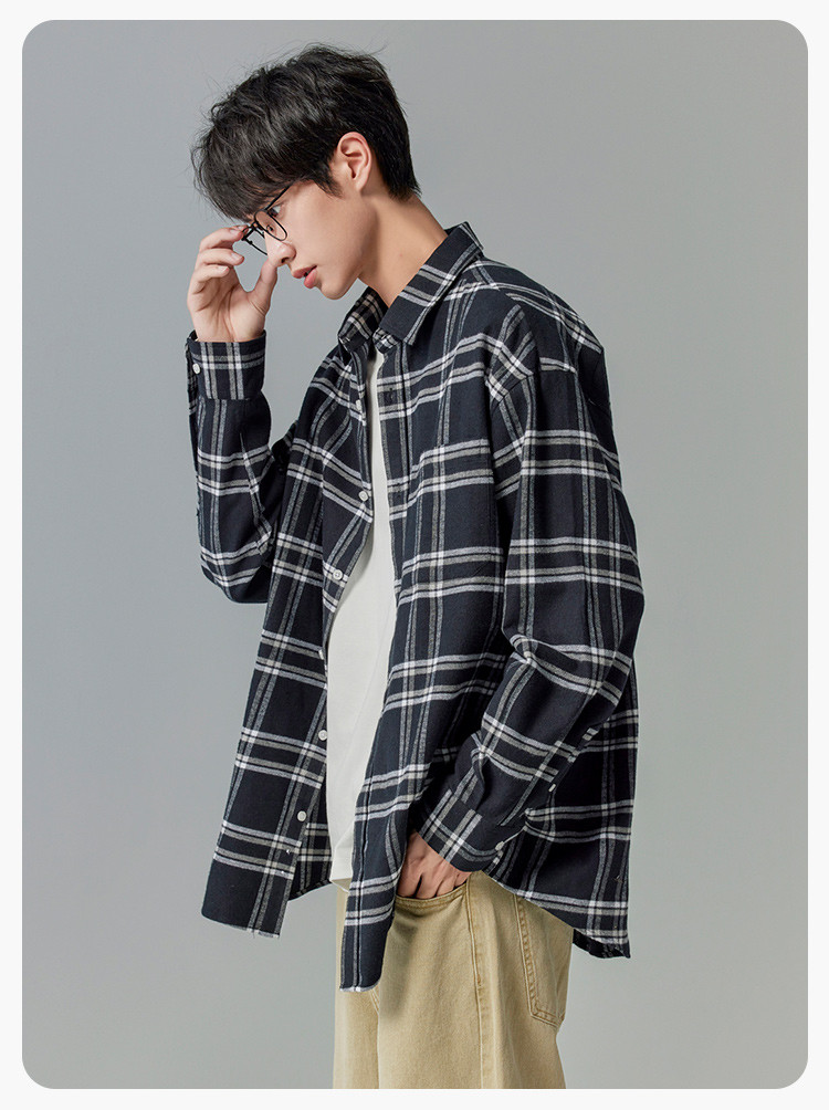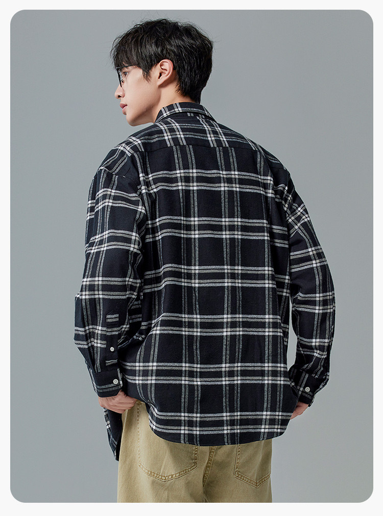 【100%棉】复古学院风黑白格子衬衫男宽松文艺少年感男士衬衣 046529