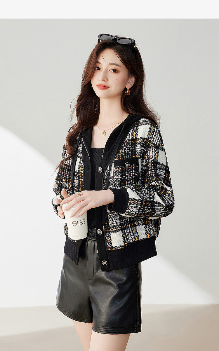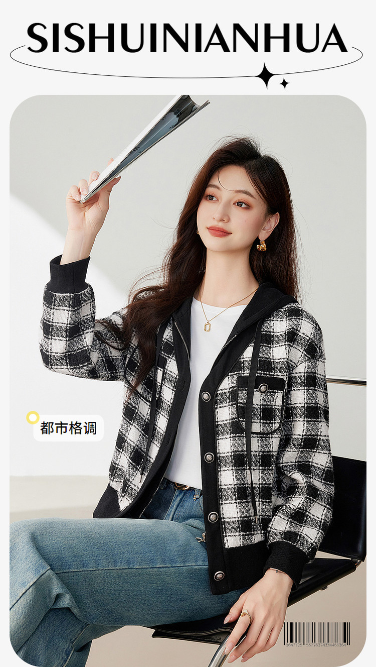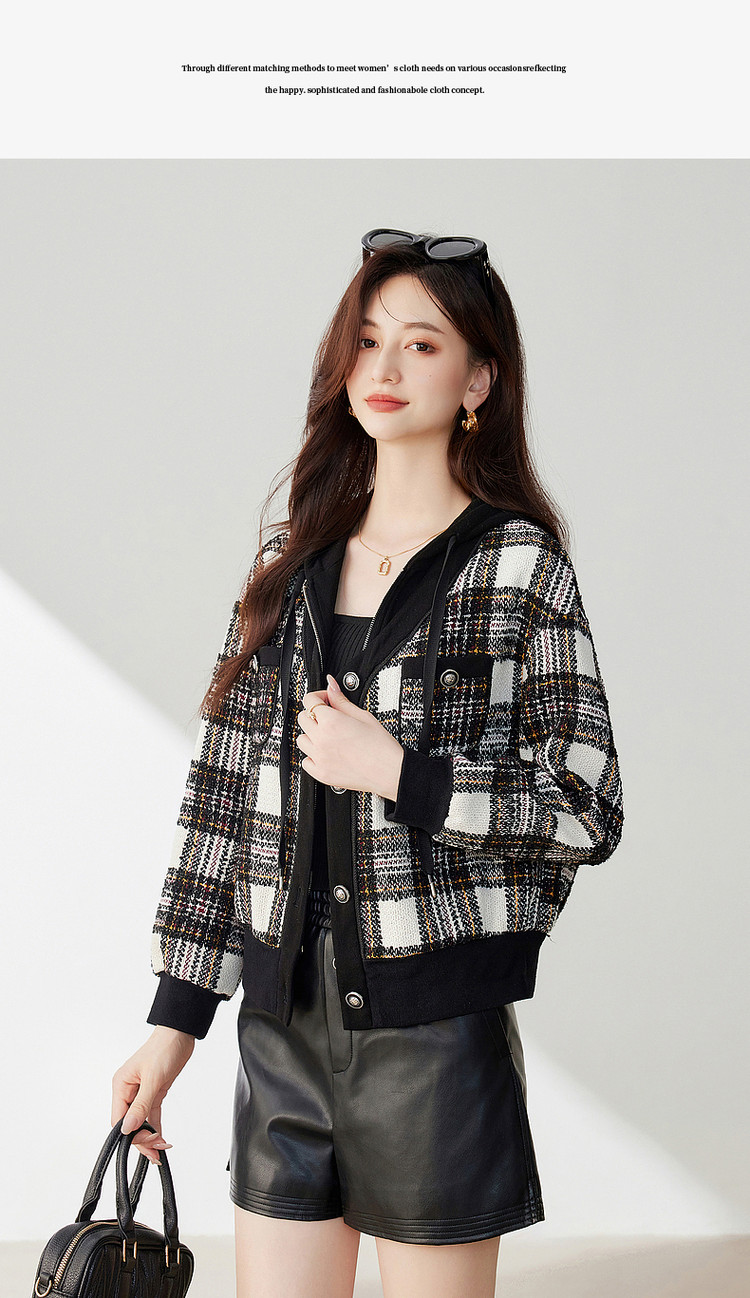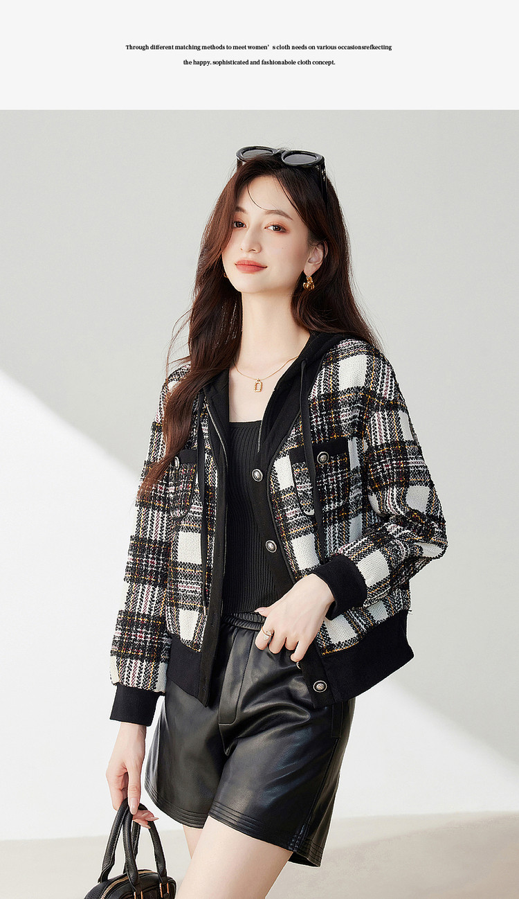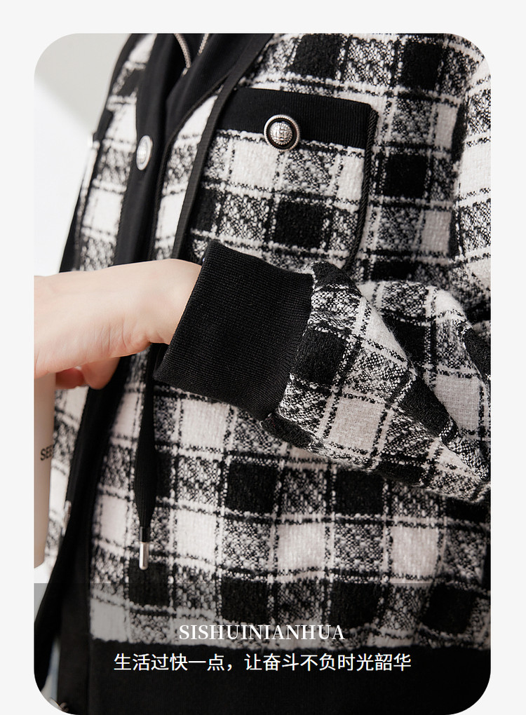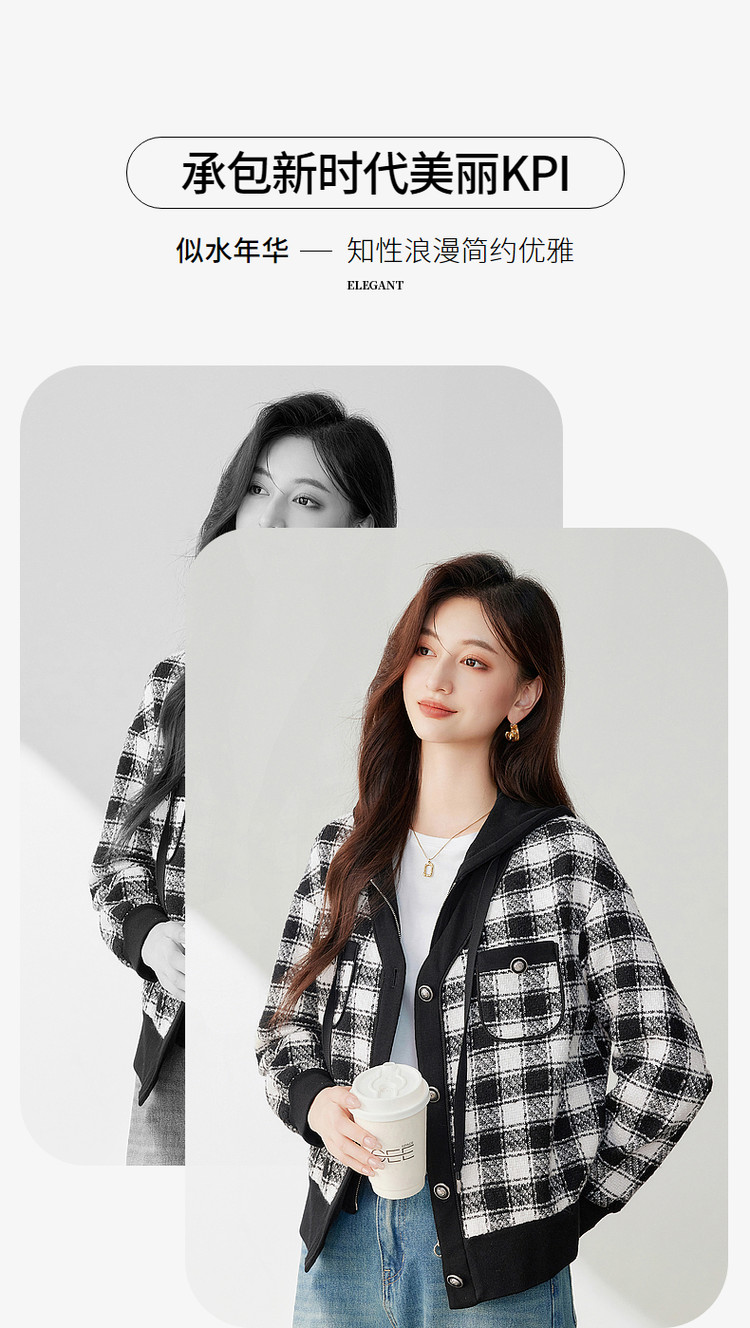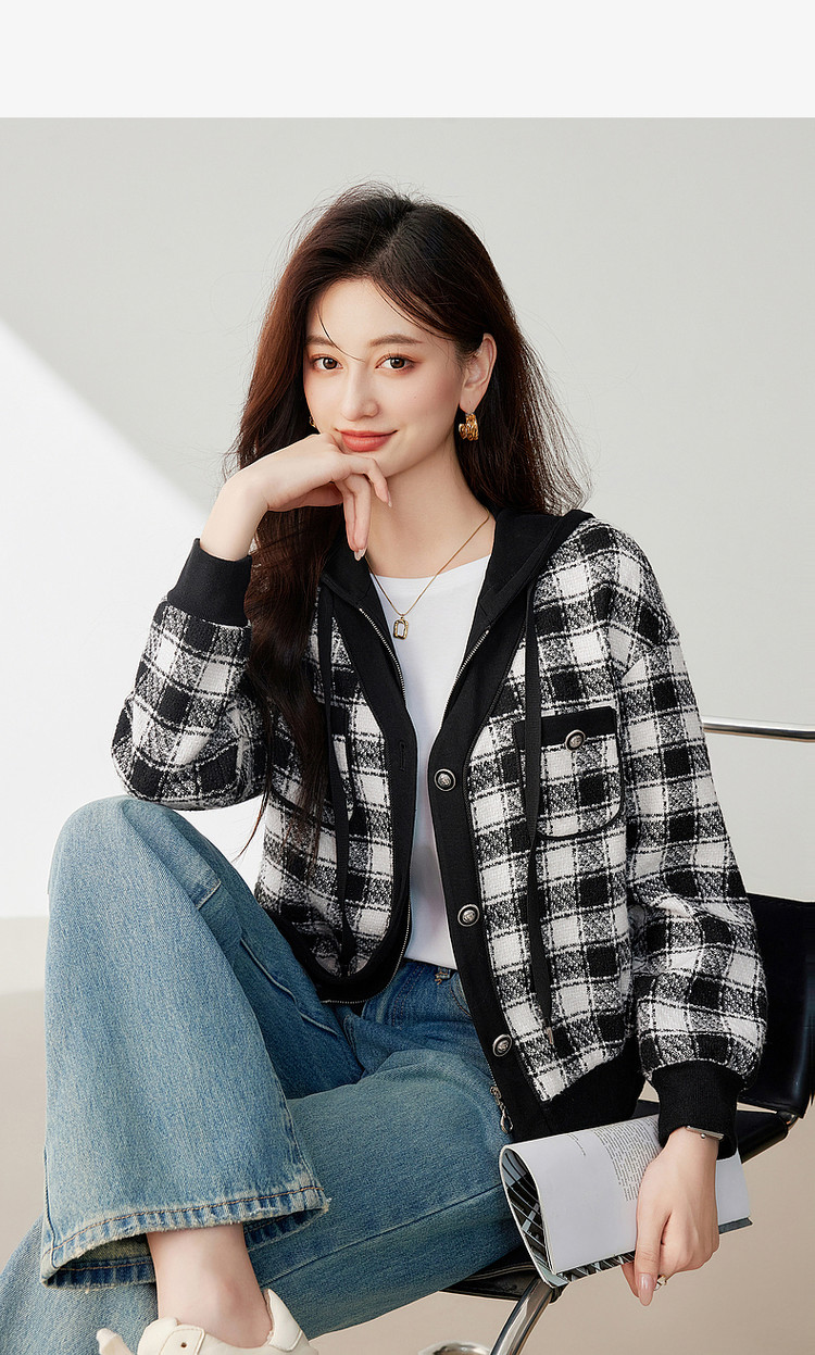 商品名称:双面毛呢格子假两件外套女时尚小个子短款上衣 590680