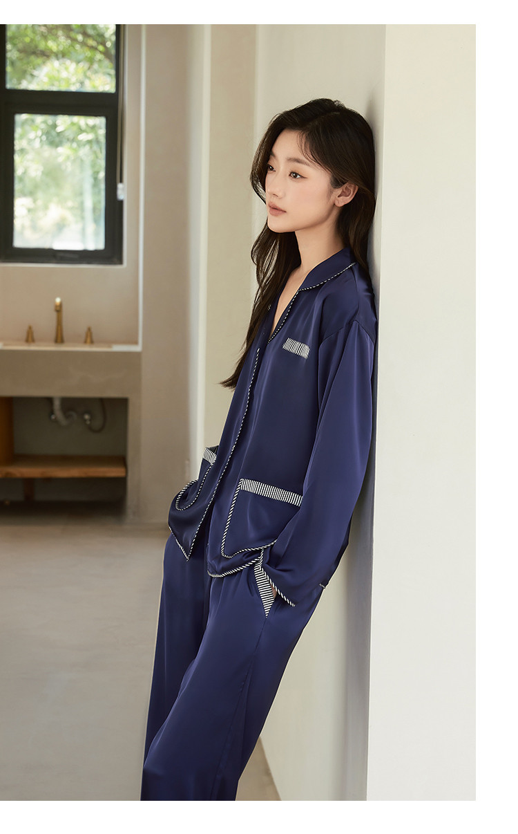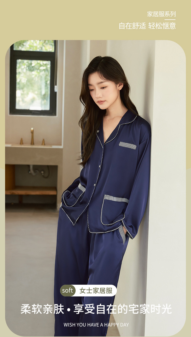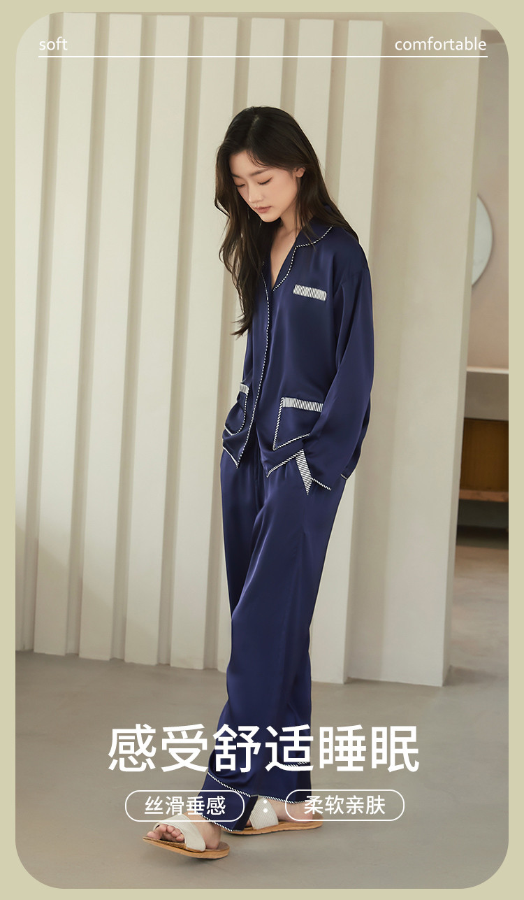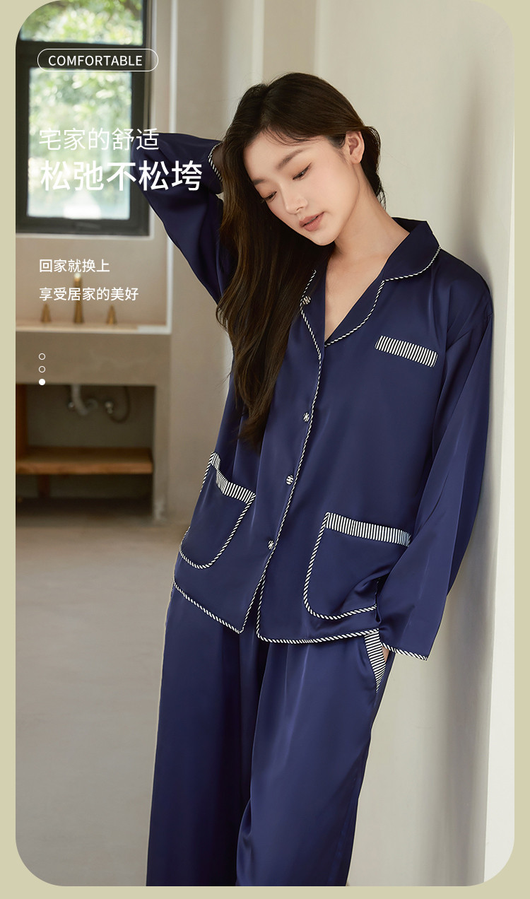 商品名称:【撞色条纹冰雪丝】亲肤舒适居家女式家居服春秋长袖翻领睡衣套装 831371