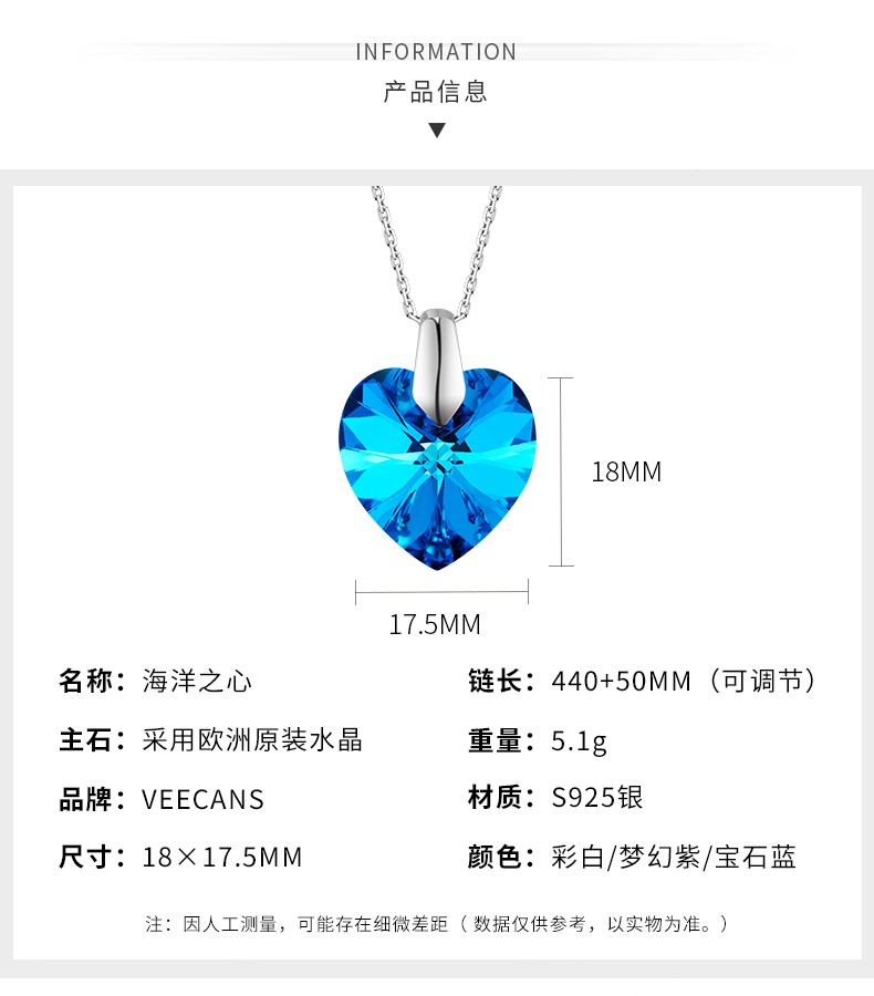 商品名称:veecans海洋之心2023年新款项链女蓝色桃心水晶高级设计感小众