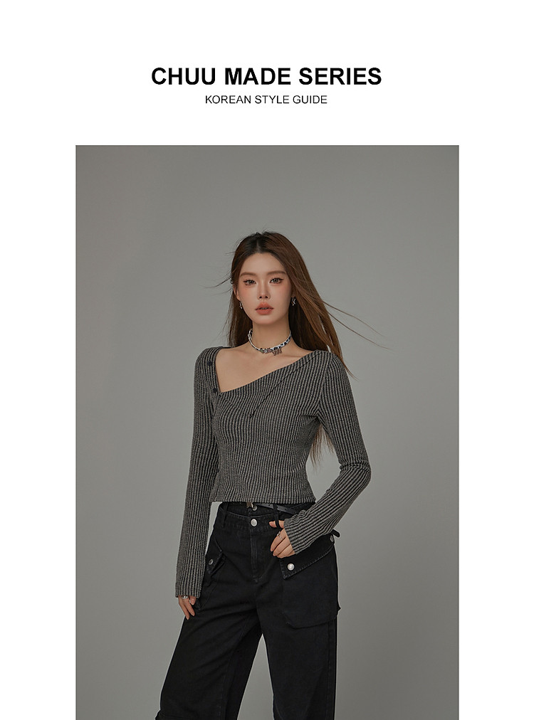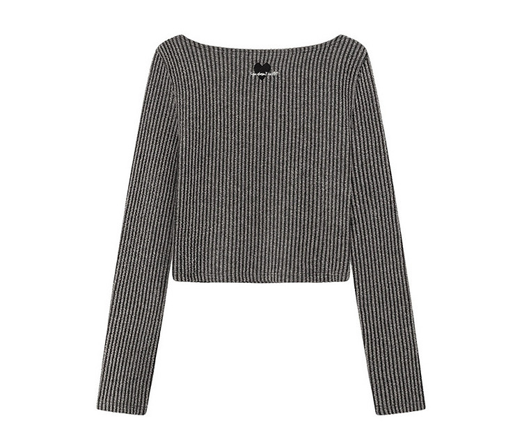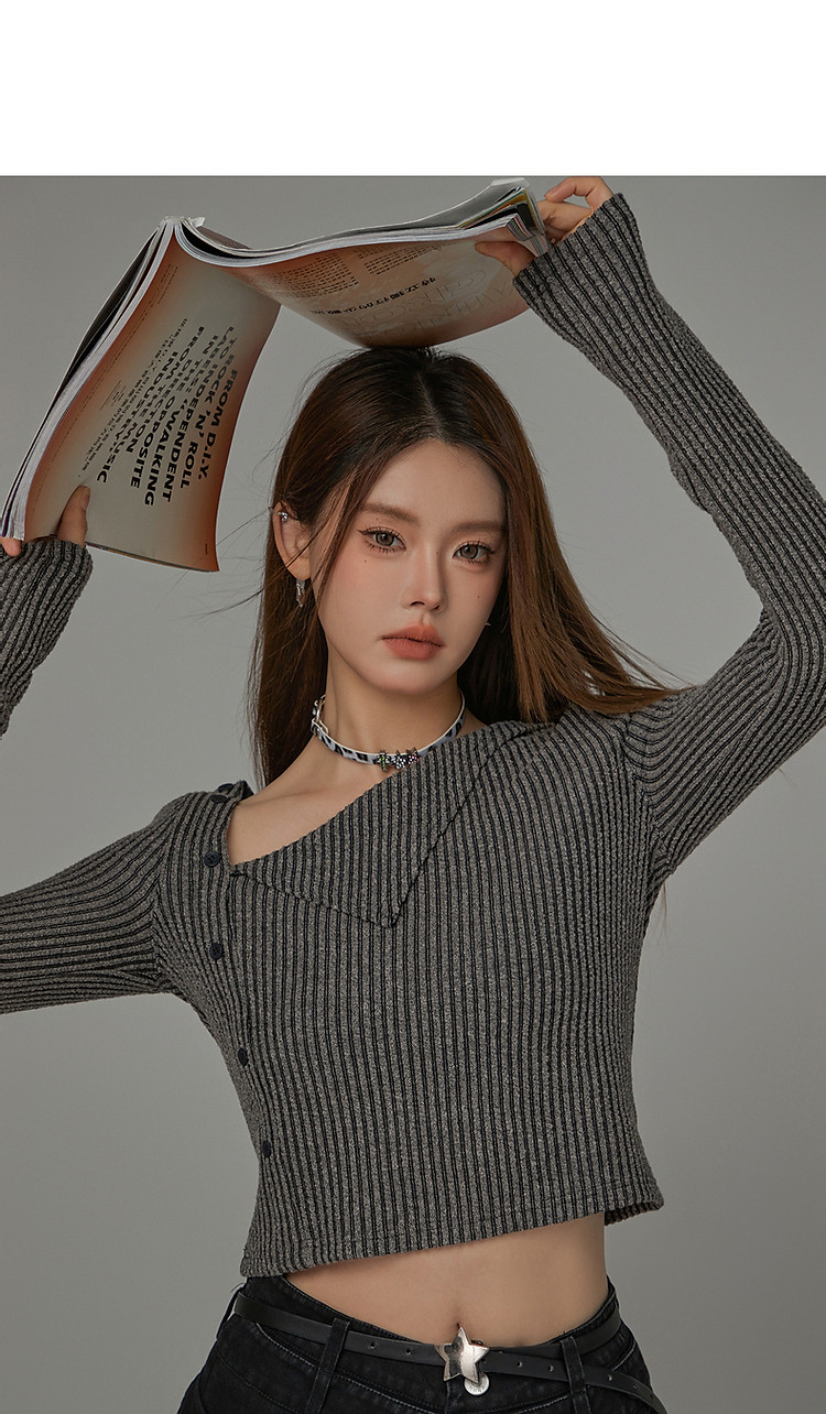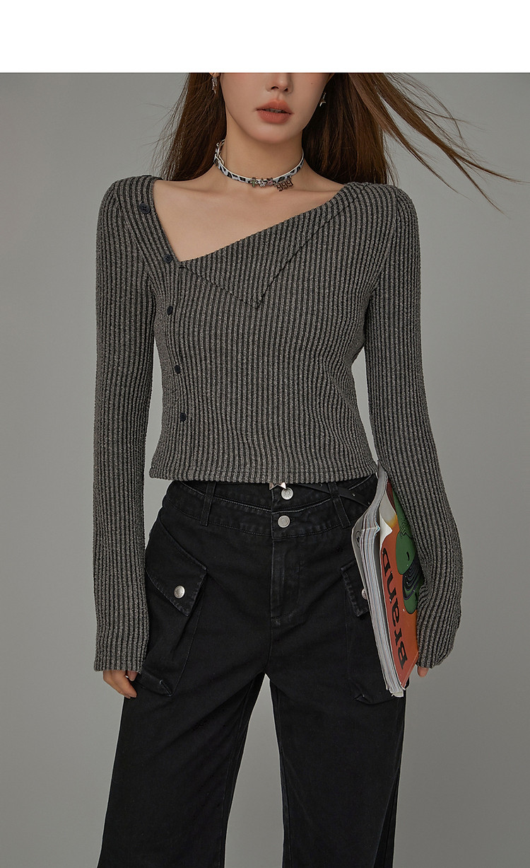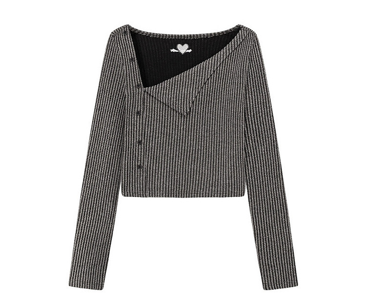 纽扣坑条爱心刺绣T恤女春秋季不规则斜领修身长袖上衣 889363