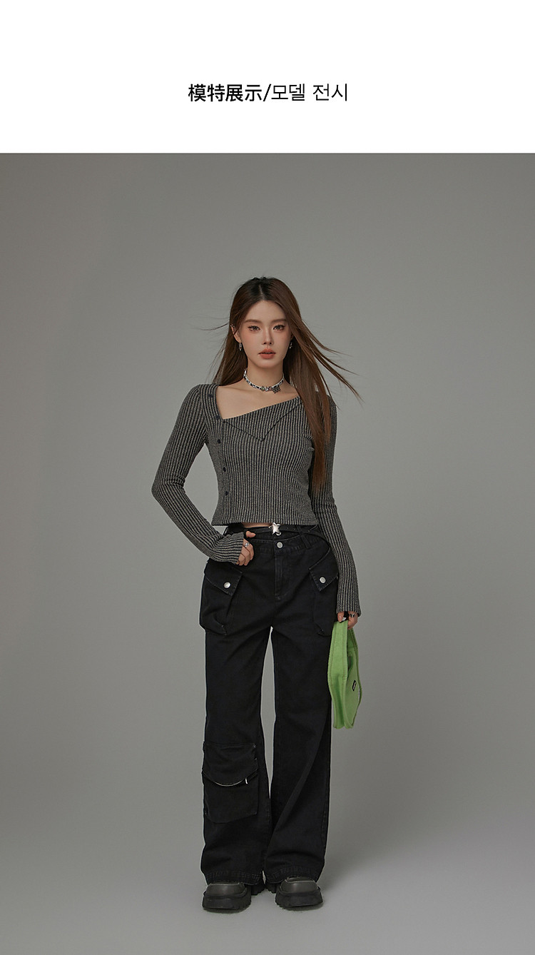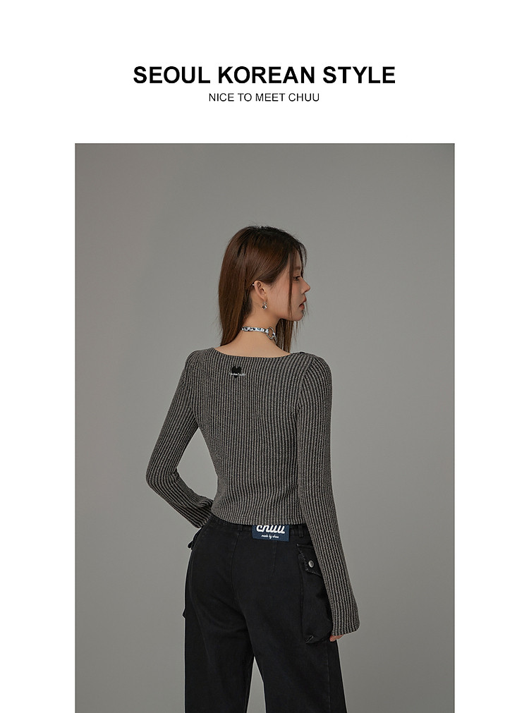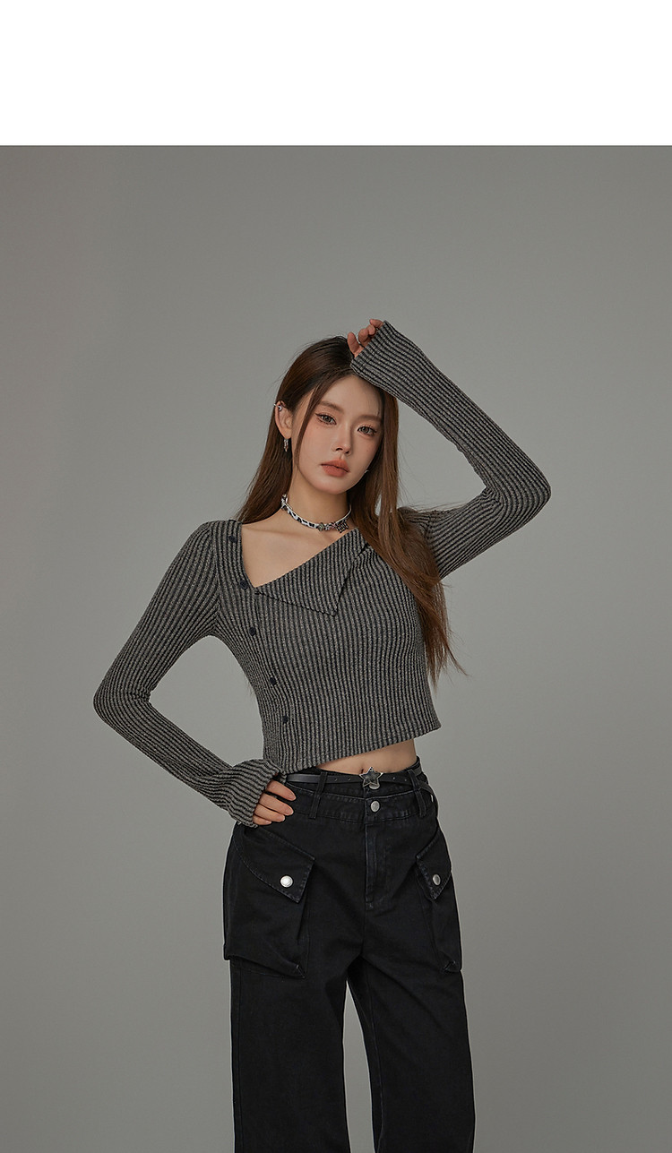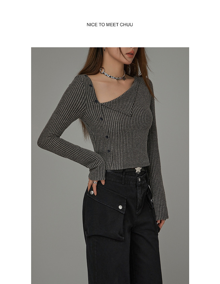 纽扣坑条爱心刺绣T恤女春秋季不规则斜领修身长袖上衣 889363