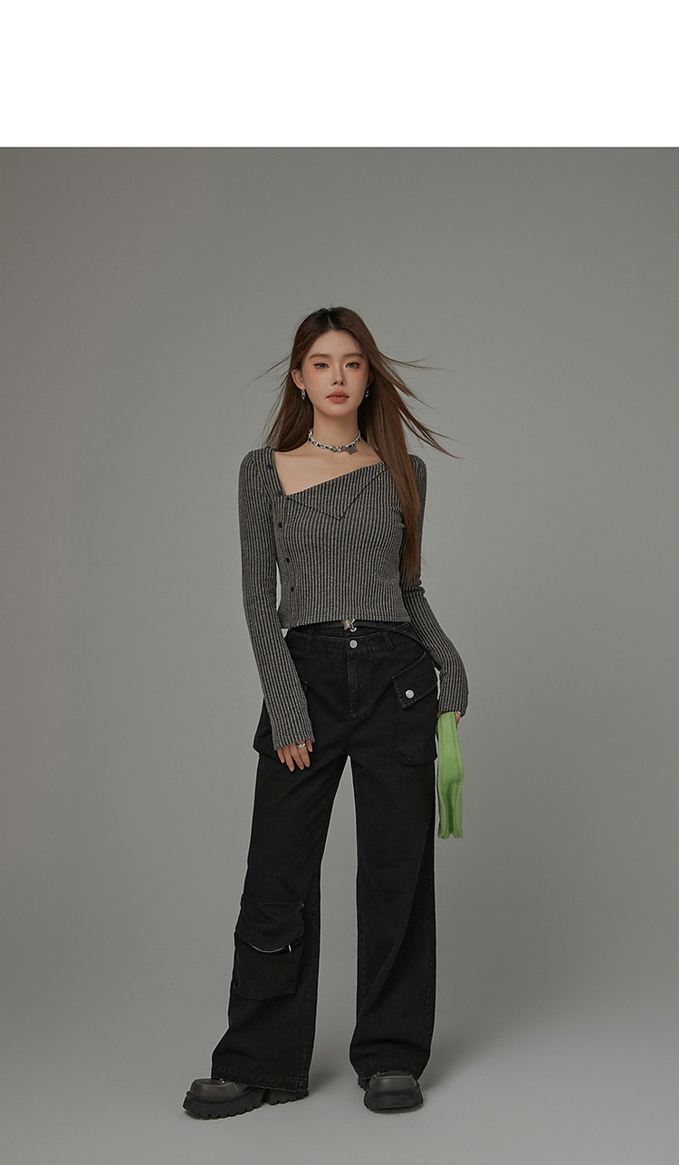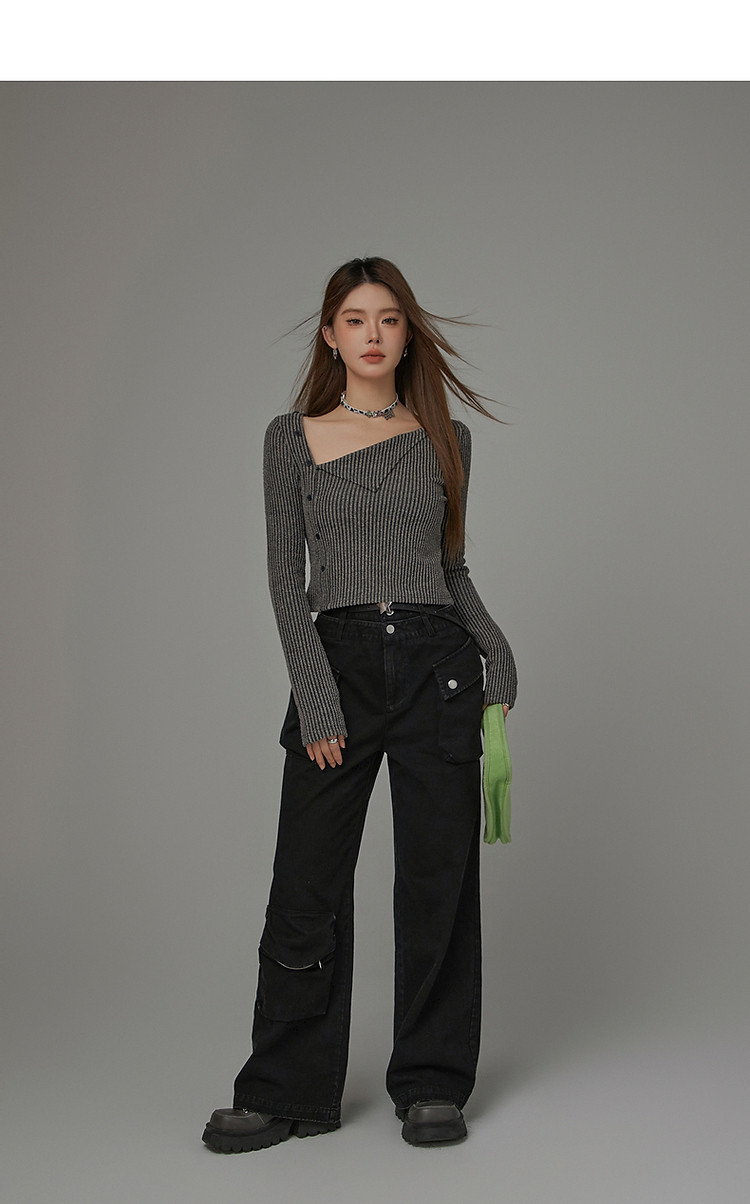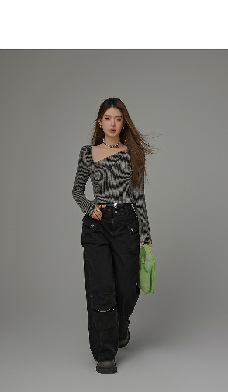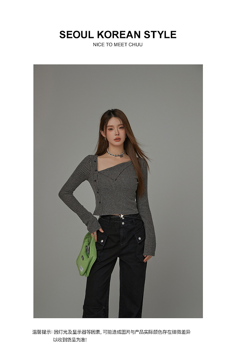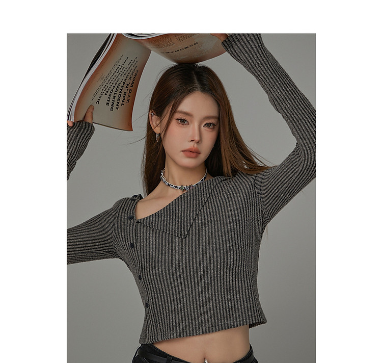商品名称:纽扣坑条爱心刺绣T恤女春秋季不规则斜领修身长袖上衣 889363