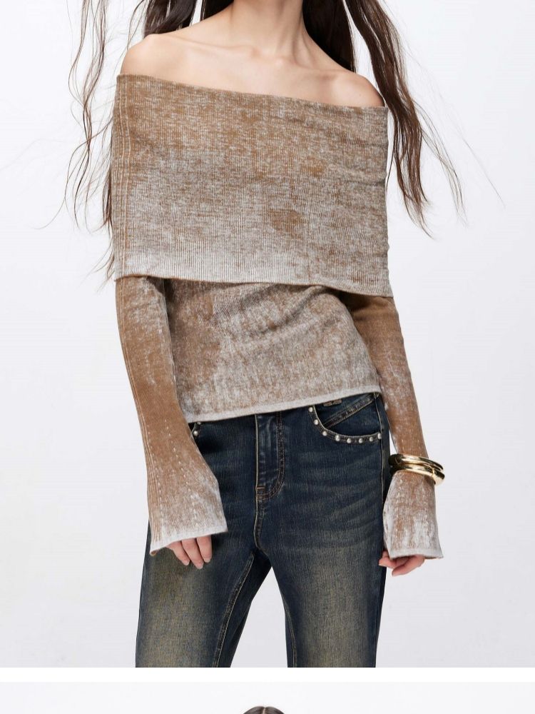 【一字肩】春季时尚优雅做旧纯棉修身一字肩针织衫女 904282