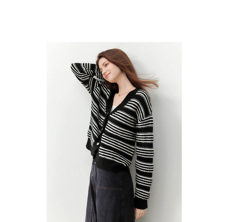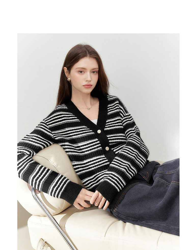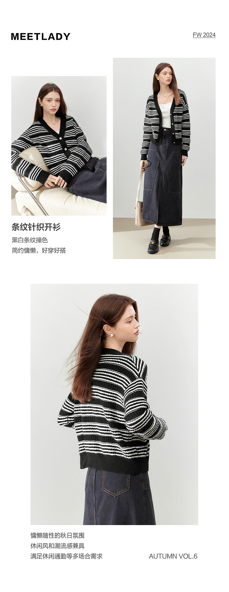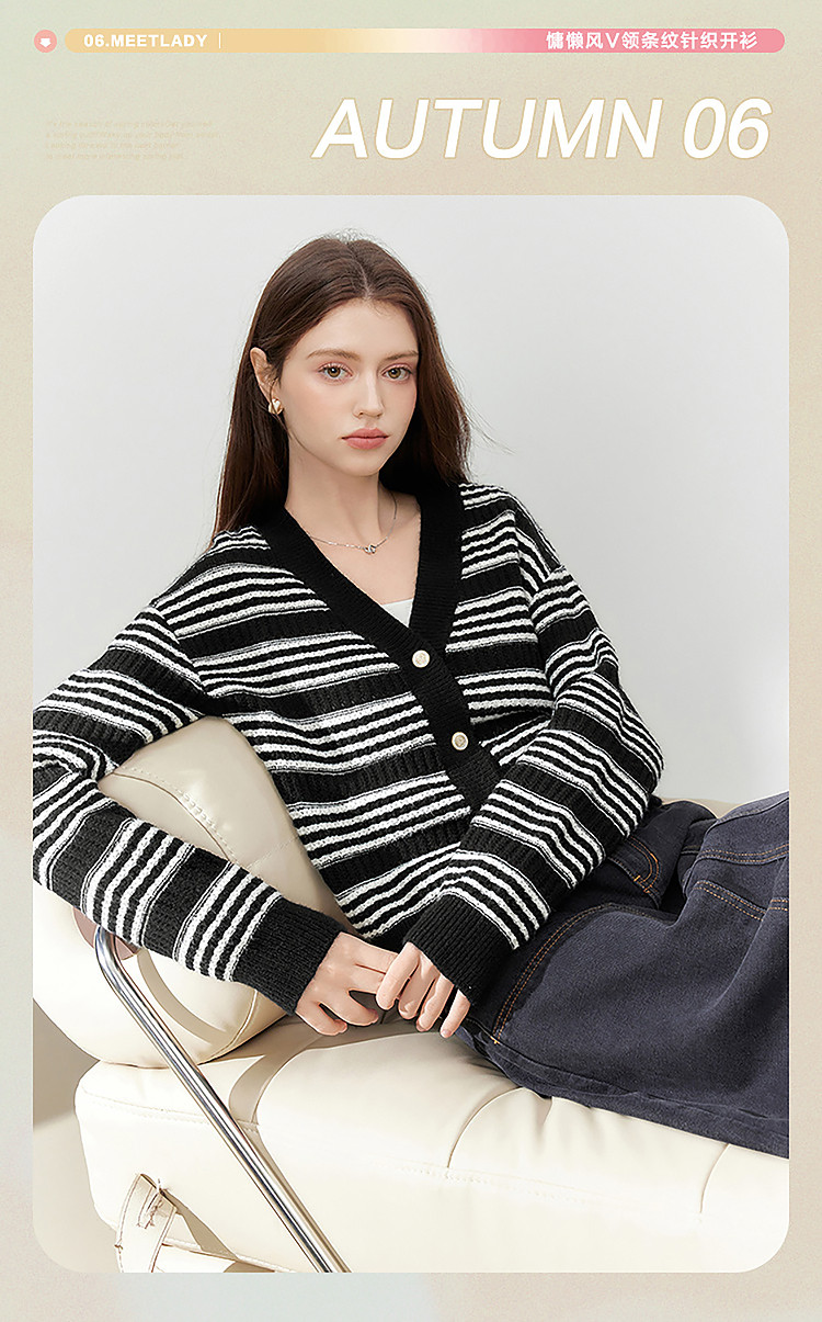 【2024秋季】简约气质粗条纹V领针织开衫毛衣慵懒风外套女 865748