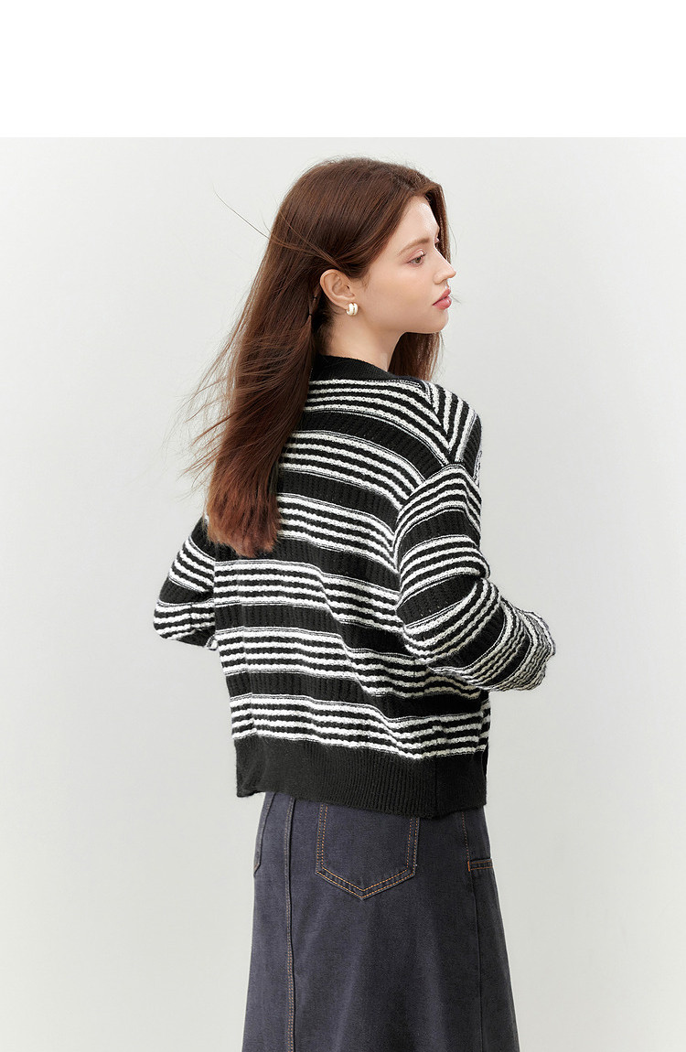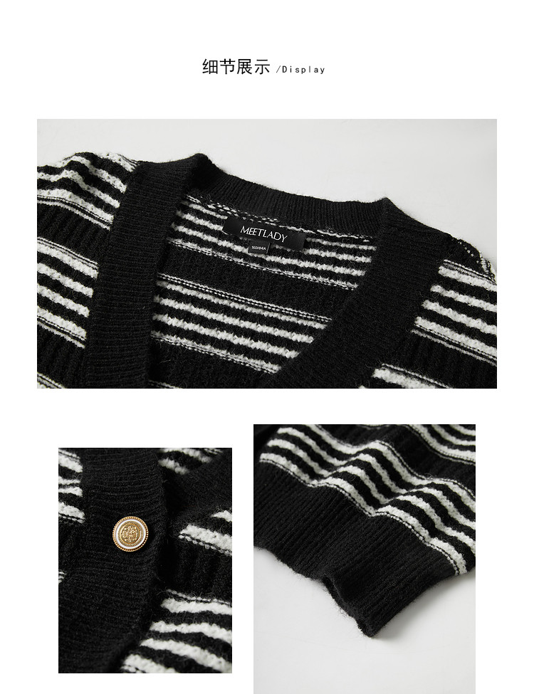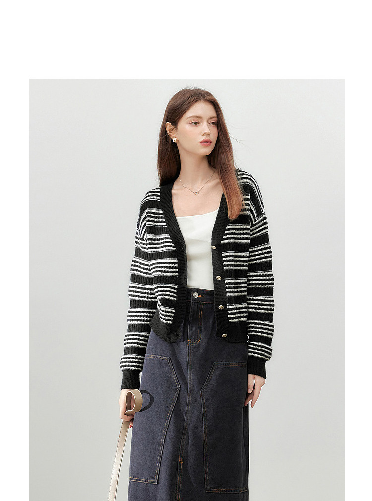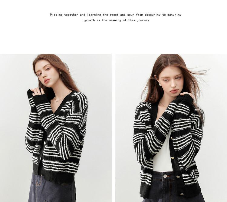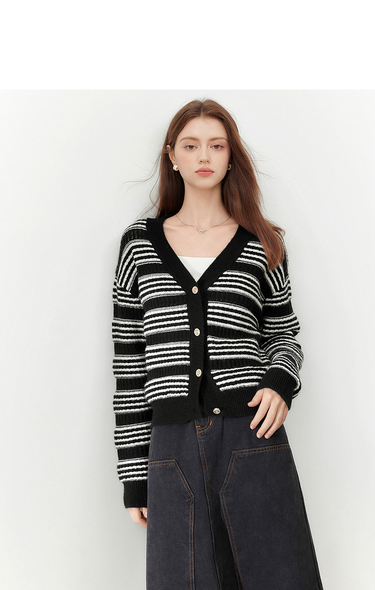 【2024秋季】简约气质粗条纹V领针织开衫毛衣慵懒风外套女 865748