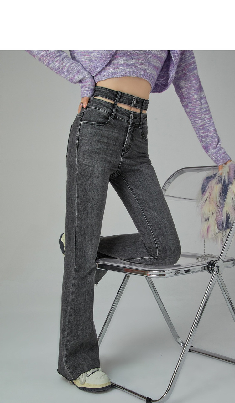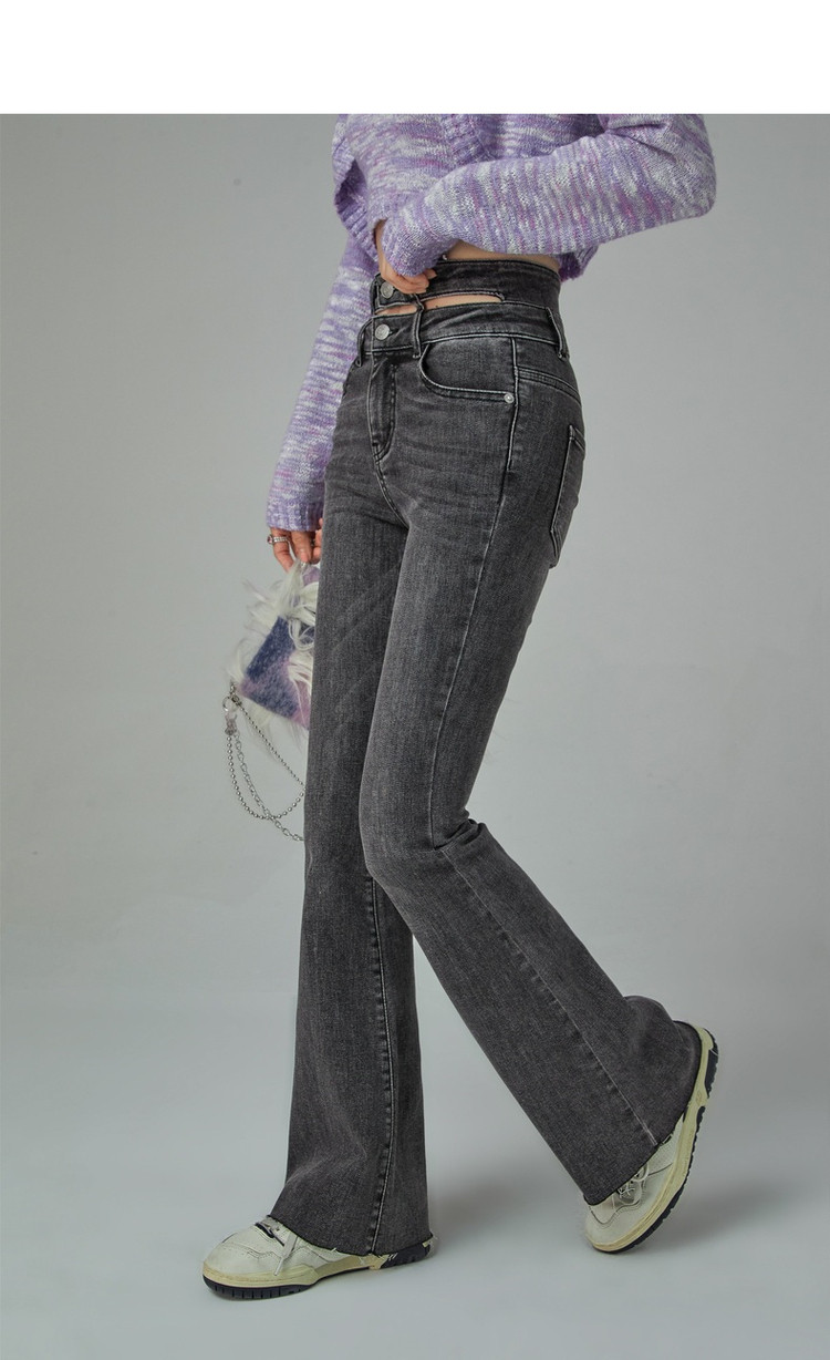 高腰镂空微喇牛仔裤女春季修身显瘦长裤子 403539
