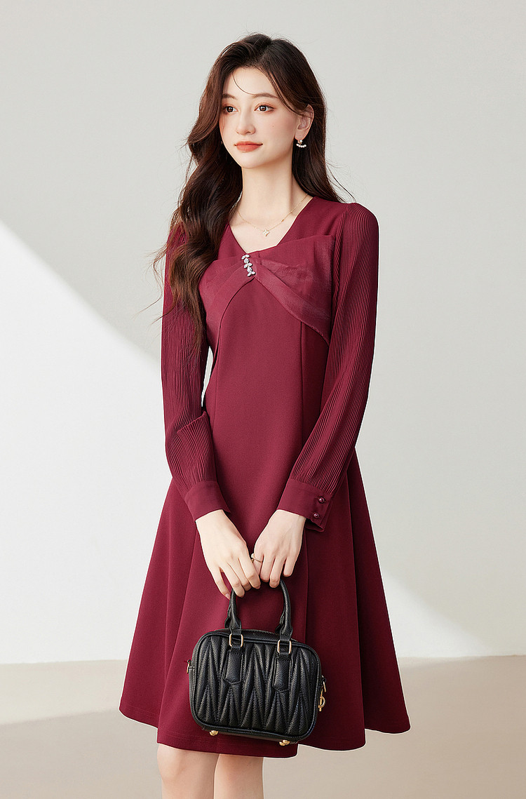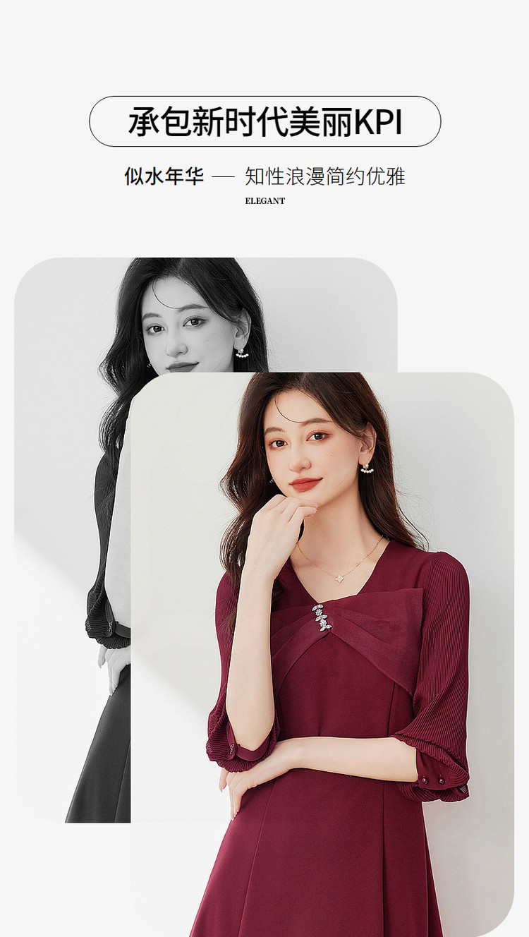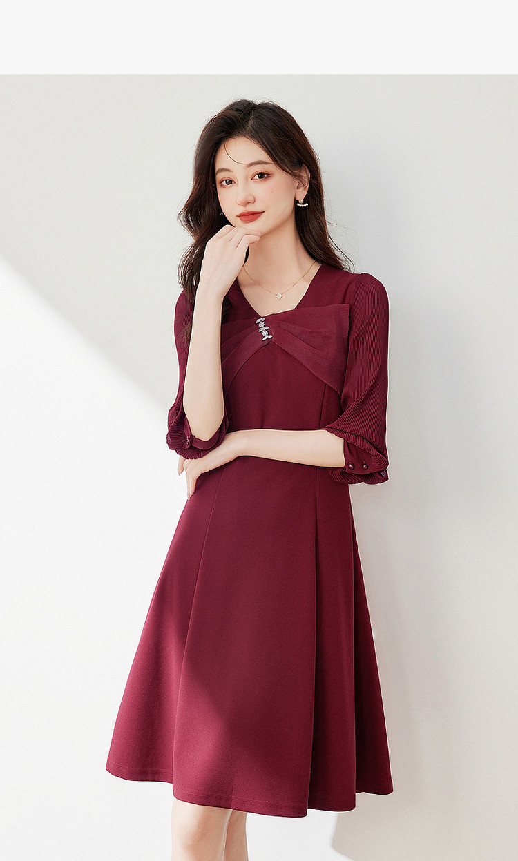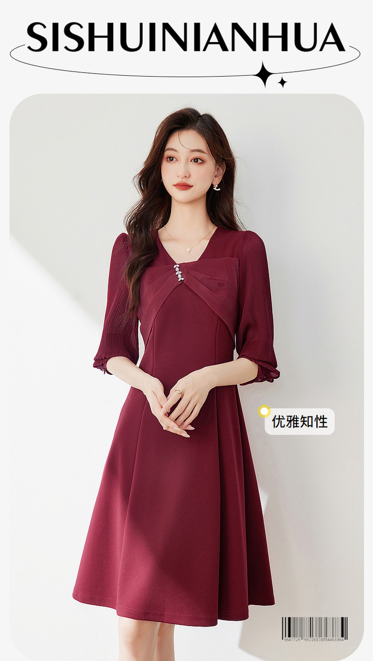商品名称:法式复古连衣裙气质名媛高级感修身显瘦蝴蝶结V领裙 071896