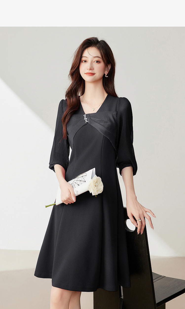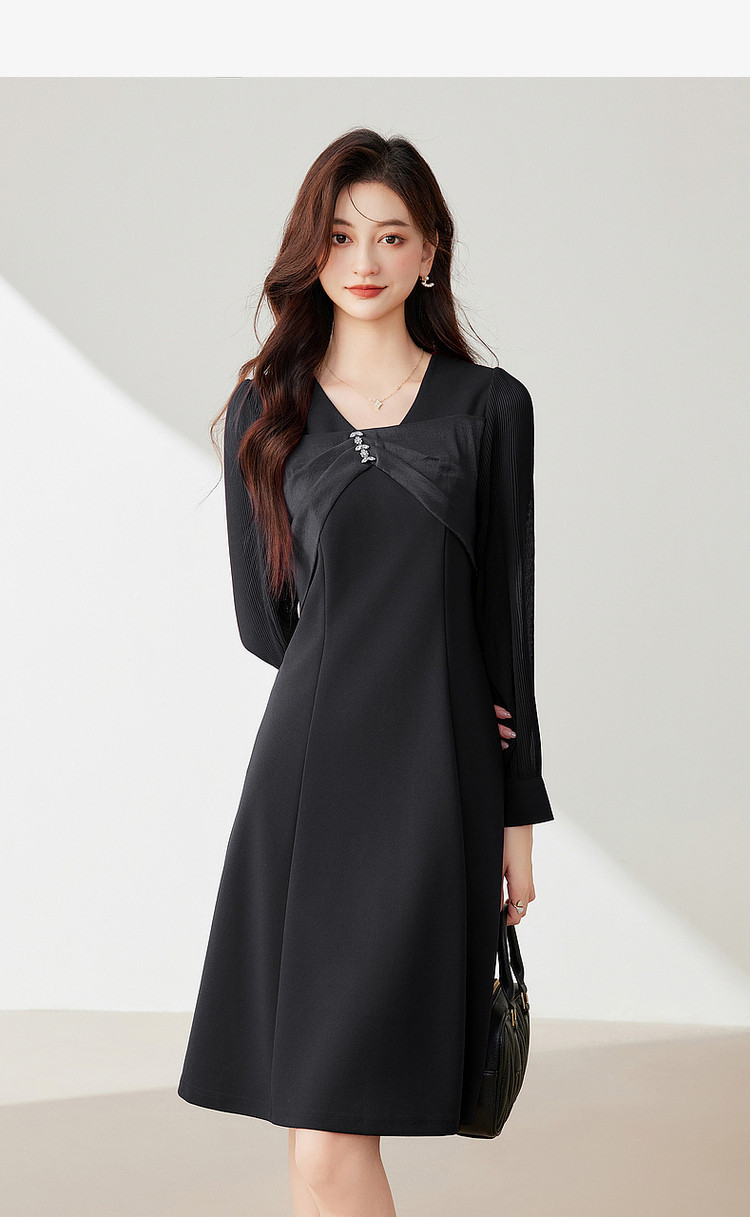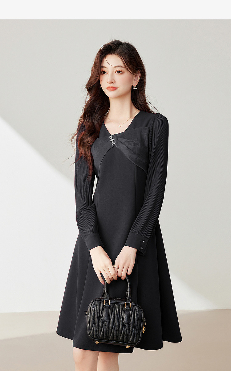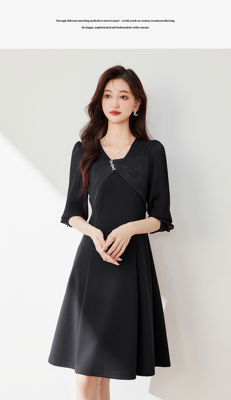 法式复古连衣裙气质名媛高级感修身显瘦蝴蝶结V领裙 071896