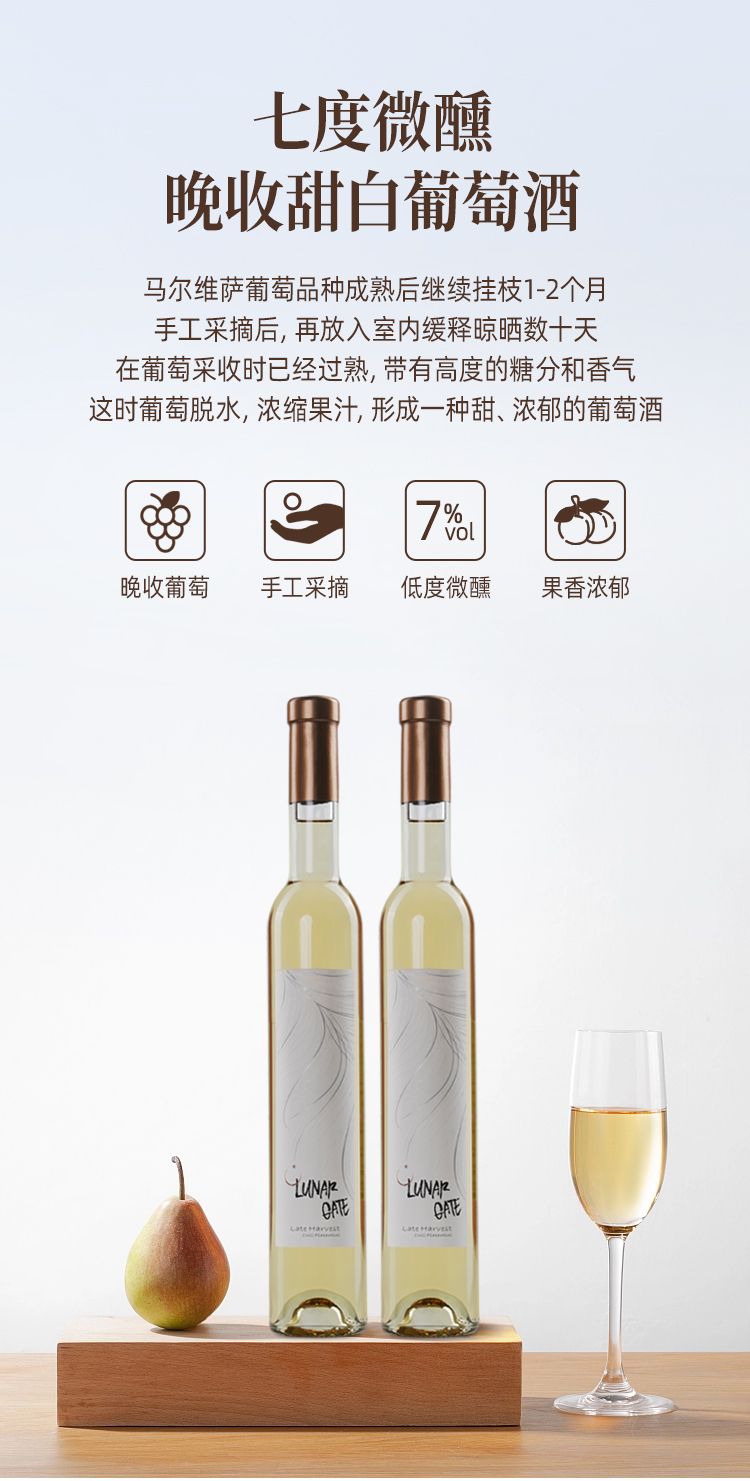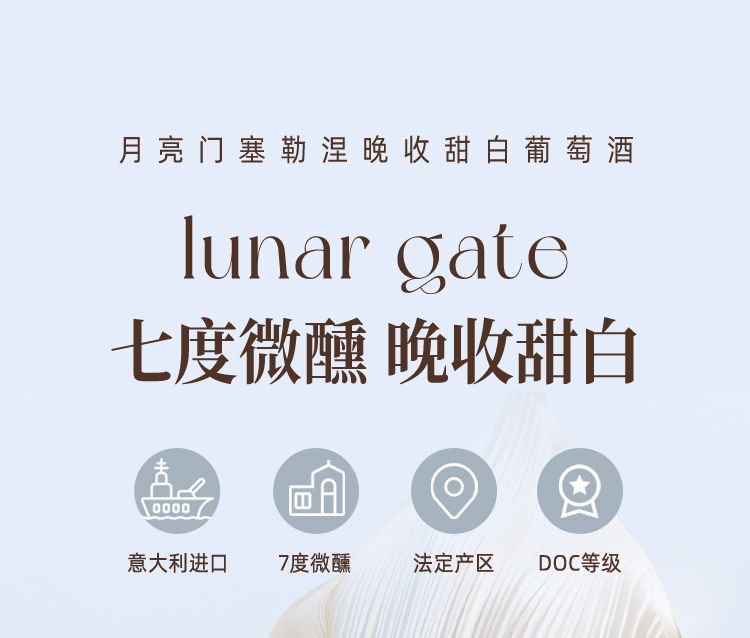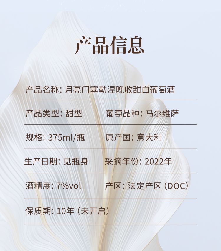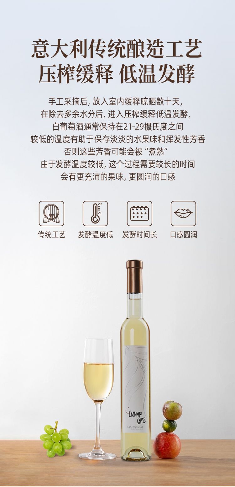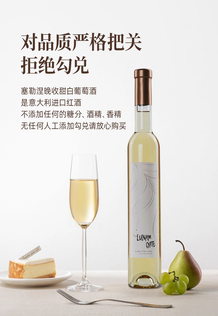 商品名称:意大利DOC级别月亮门塞勒涅晚收甜白葡萄酒375ml*2瓶 送香槟杯+开瓶器