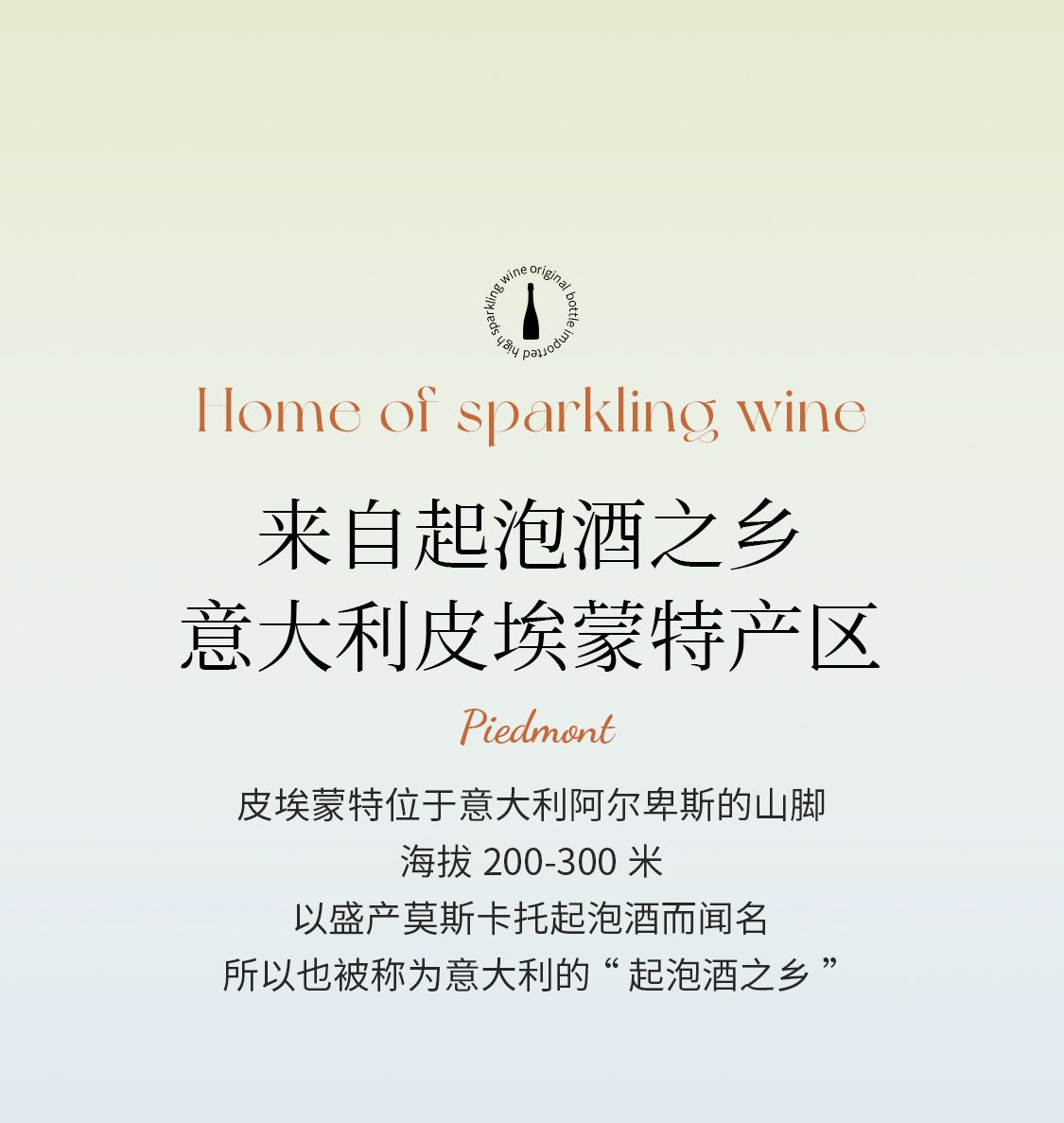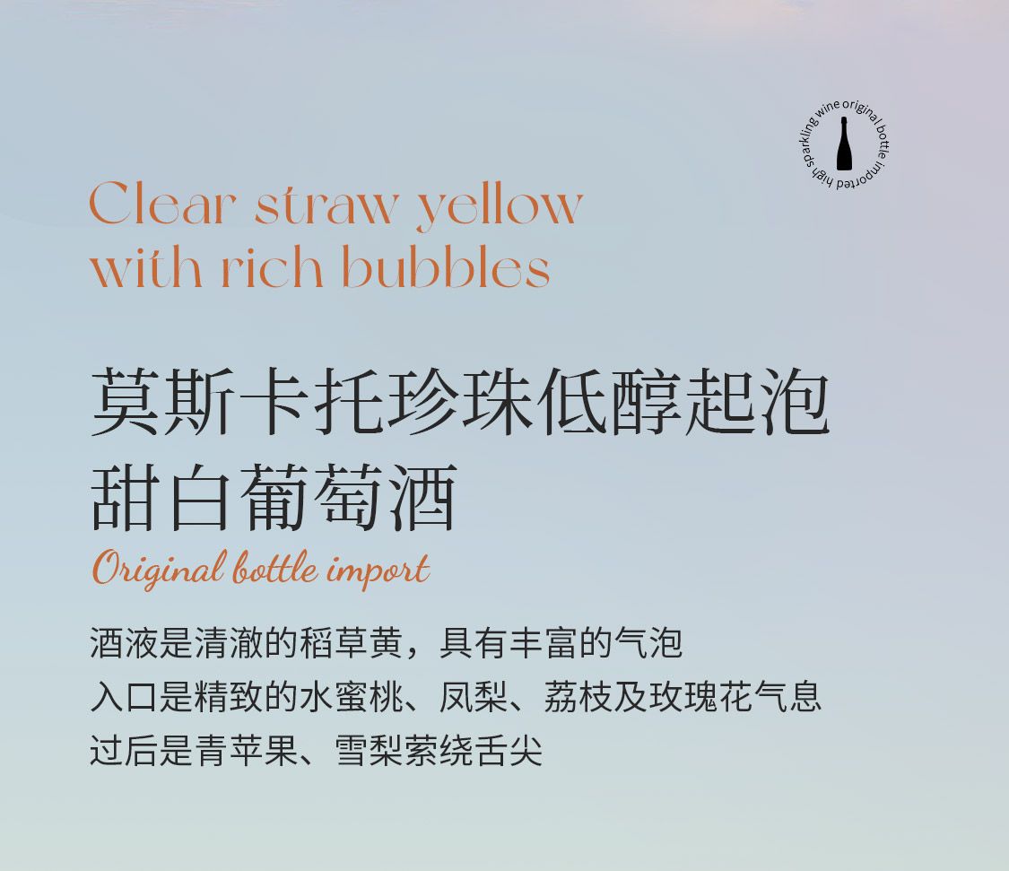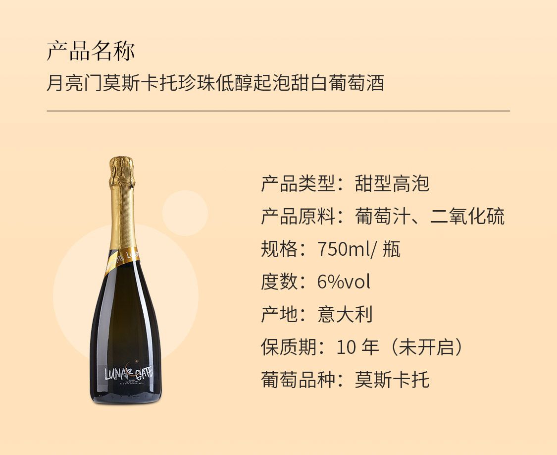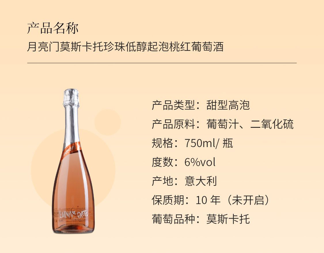 商品名称:意大利进口月亮门莫斯卡托珍珠低醇甜白桃红起泡酒750ml*2瓶 送香槟杯