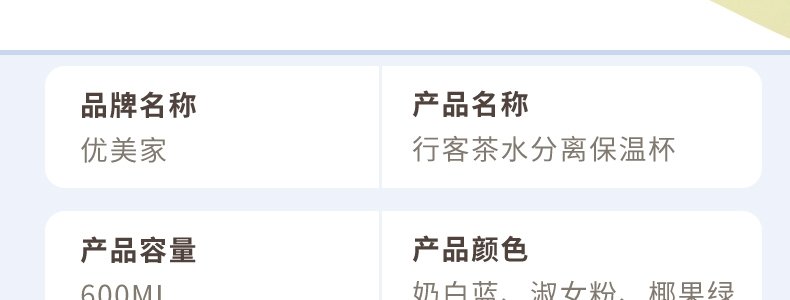 商品名称:优美家 行客茶水分离保温杯 560ml 奶白蓝