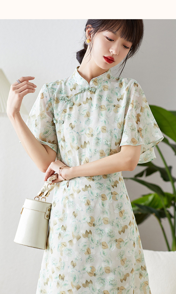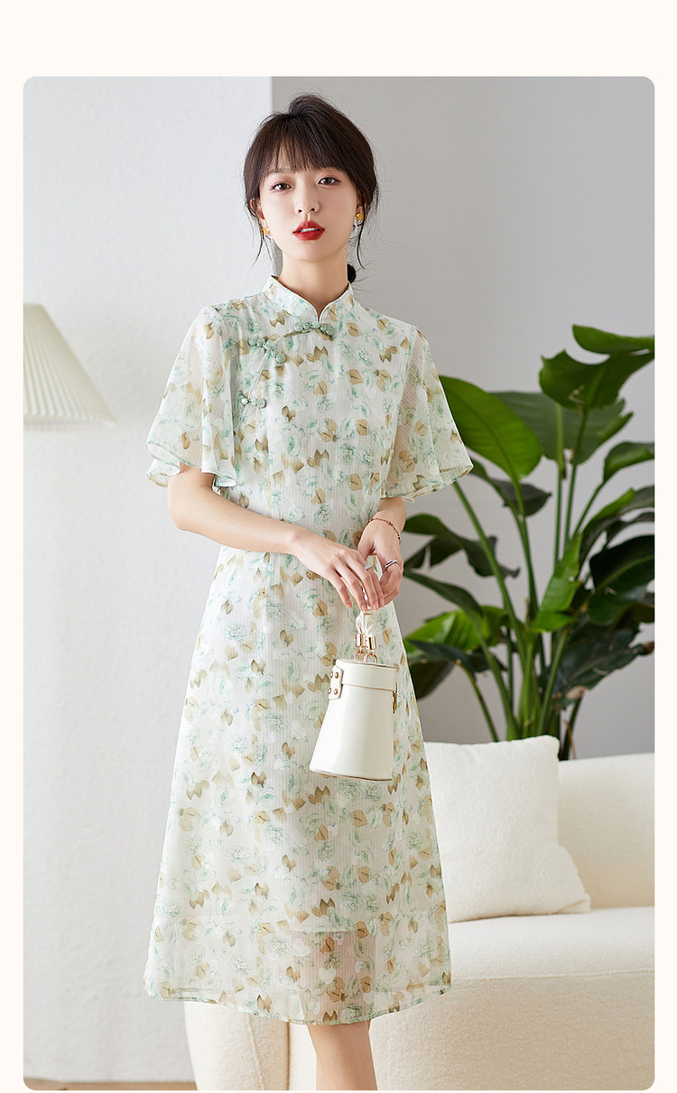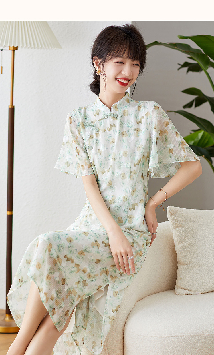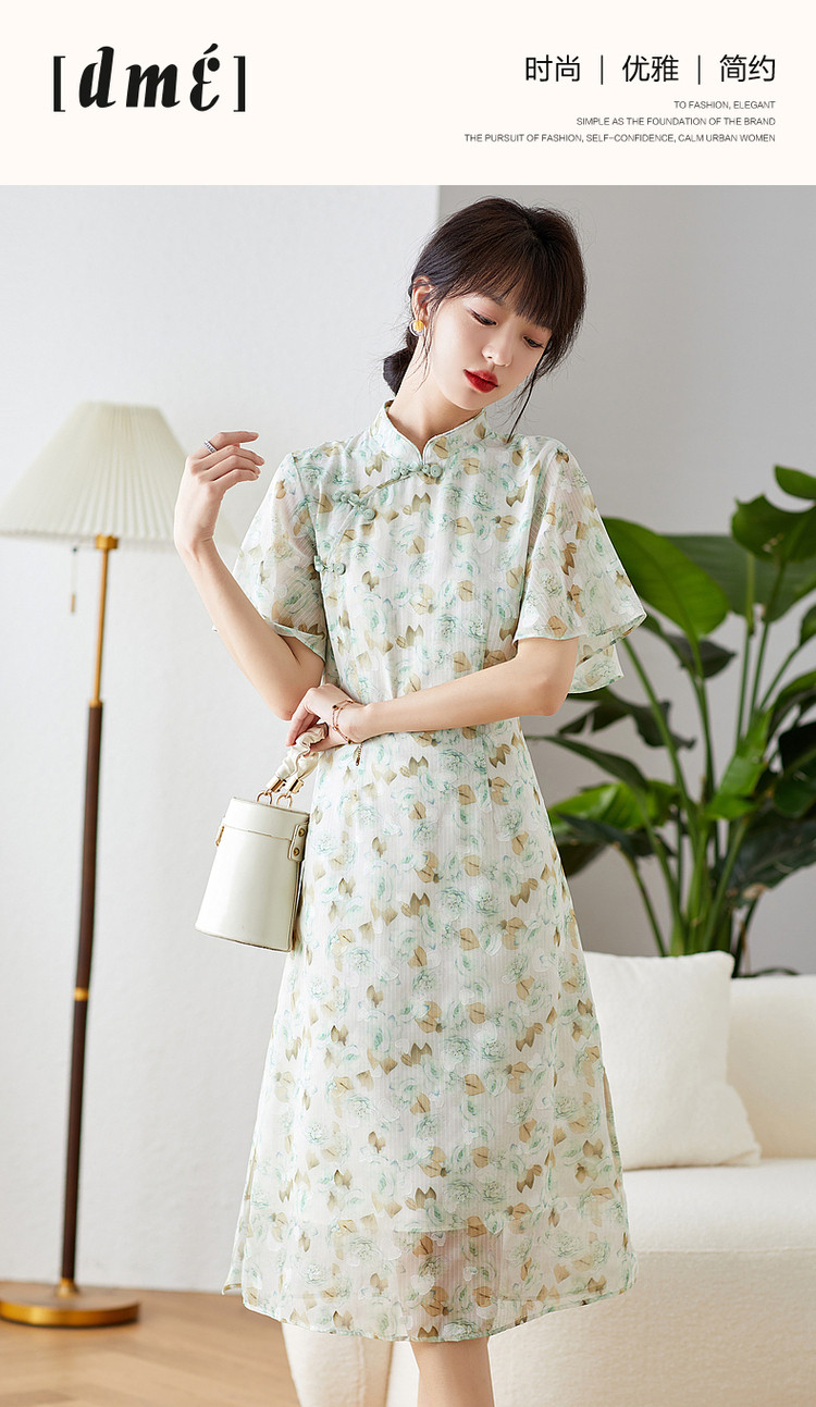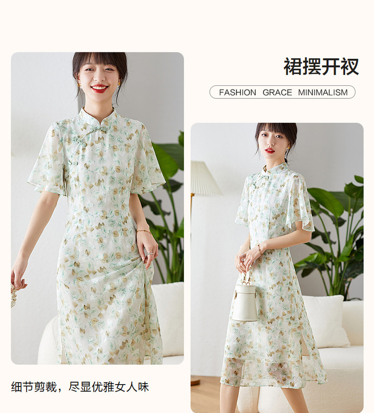商品名称:【中式水墨印花雪纺旗袍裙】春秋盘扣荷叶袖开衩连衣裙女 743617
