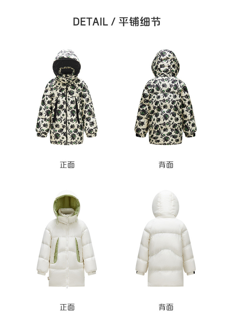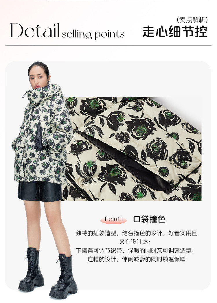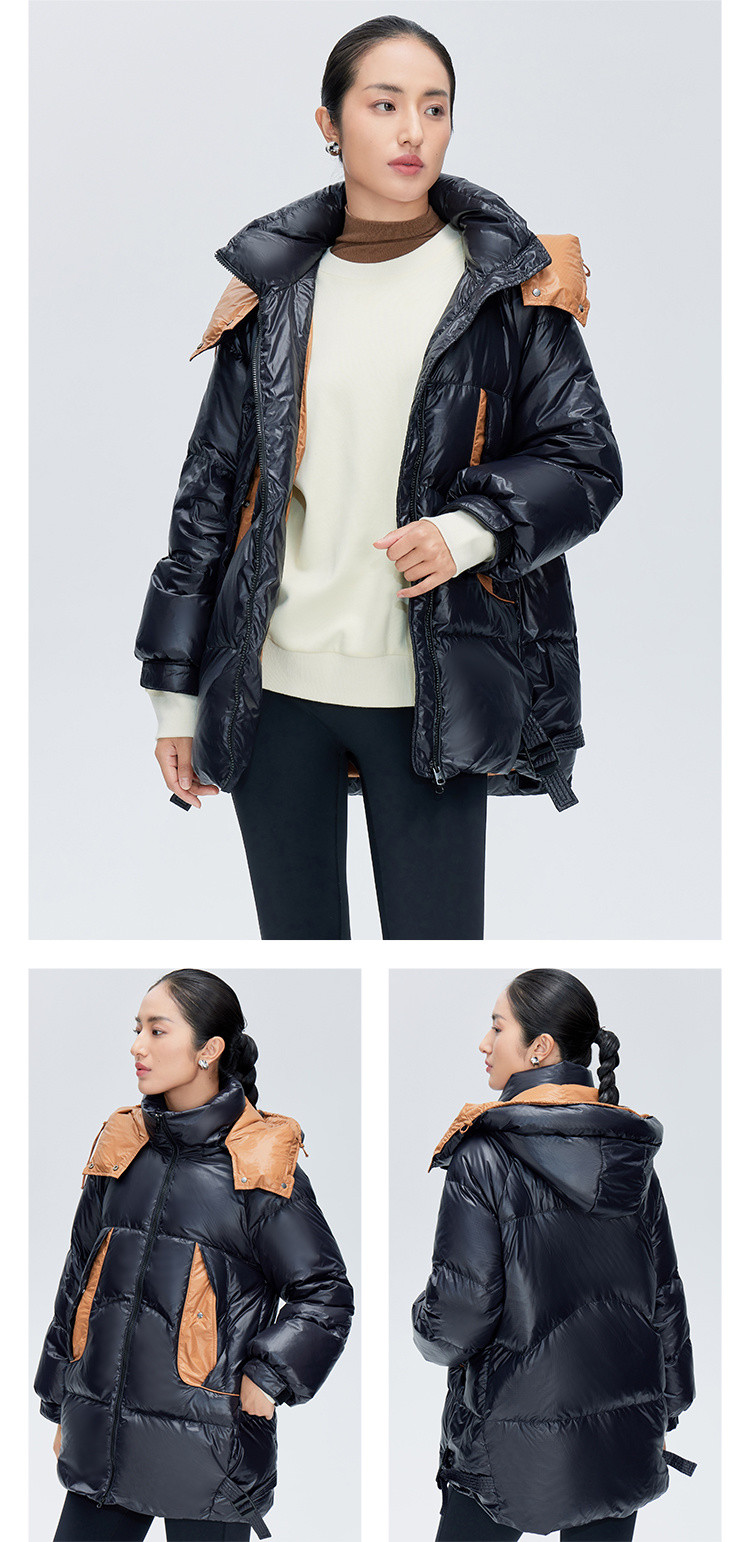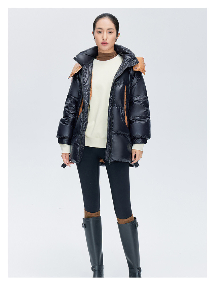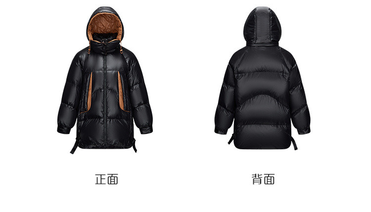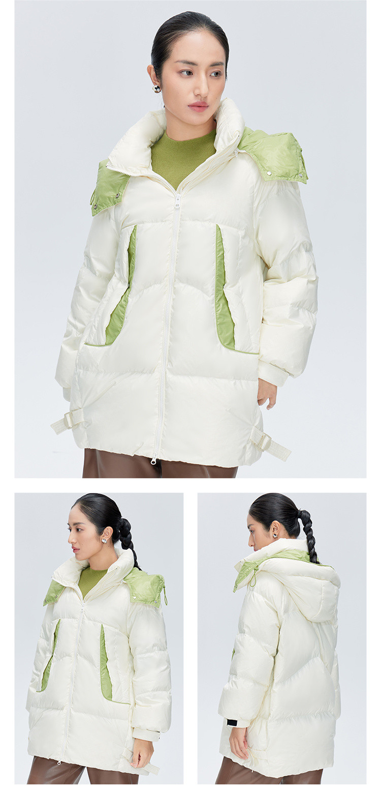 商品名称:商场同款秋冬时尚御寒连帽羽绒服女口袋撞色保暖鸭绒服女式外套 217430