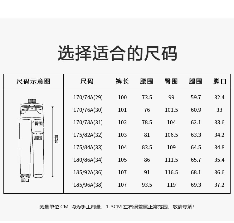 尺码 大腿围(cm) 裤脚围(cm) 前浪(cm) 后浪(cm) 腰围(cm) 裤长(cm) 膝围(cm) 臀围(cm) 号型