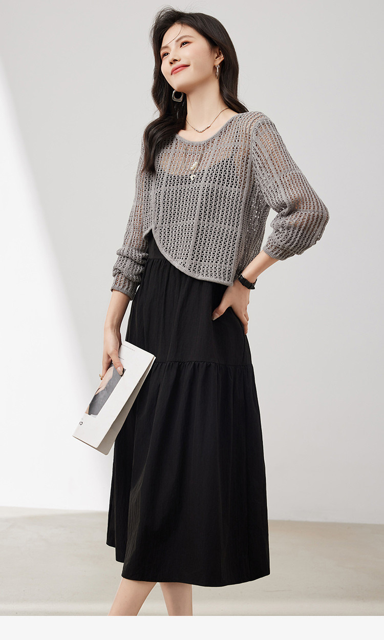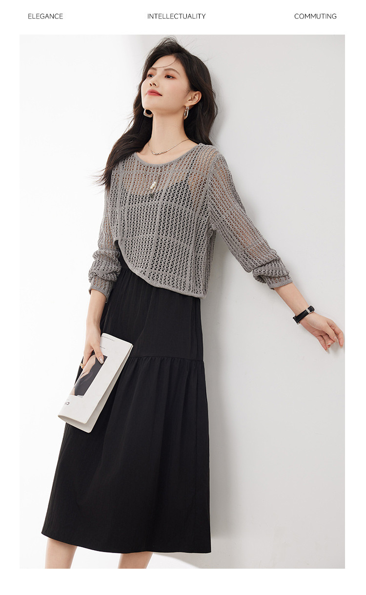 商品名称:气质套装女2025春季新款时尚针织镂空衫搭吊带连衣裙两件套女 648024