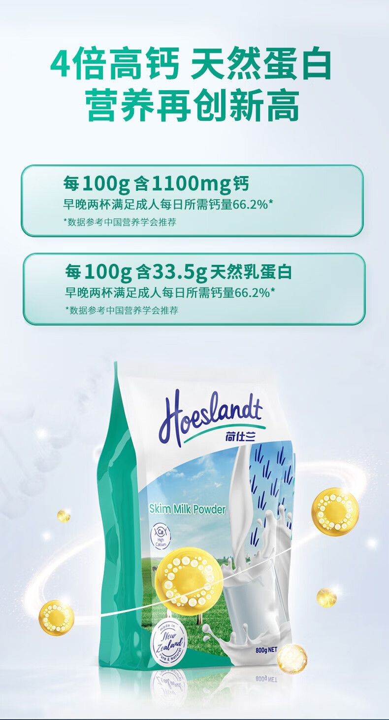 荷仕兰 新西兰原装进口高钙脱脂成人奶粉 800g袋装 女士