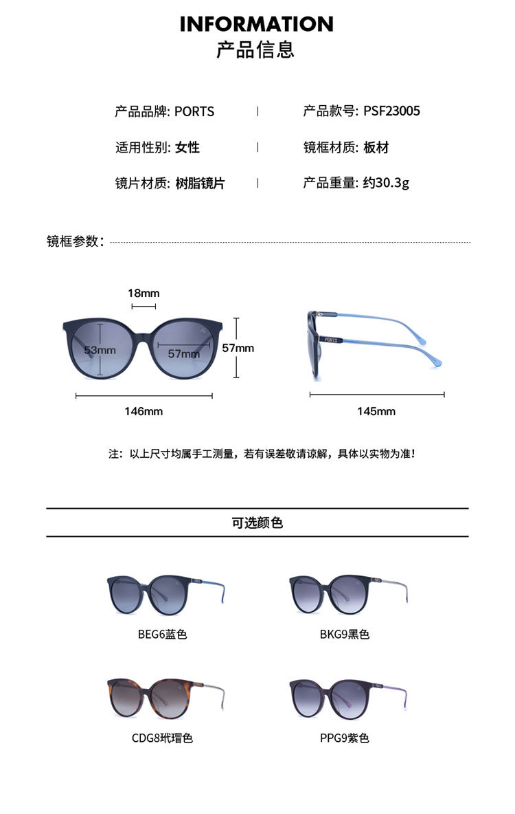 商品名称:PORTS女款休闲时尚百搭板材猫眼形太阳镜PSF23005 361354