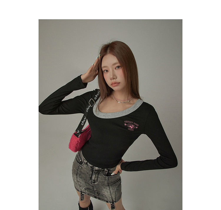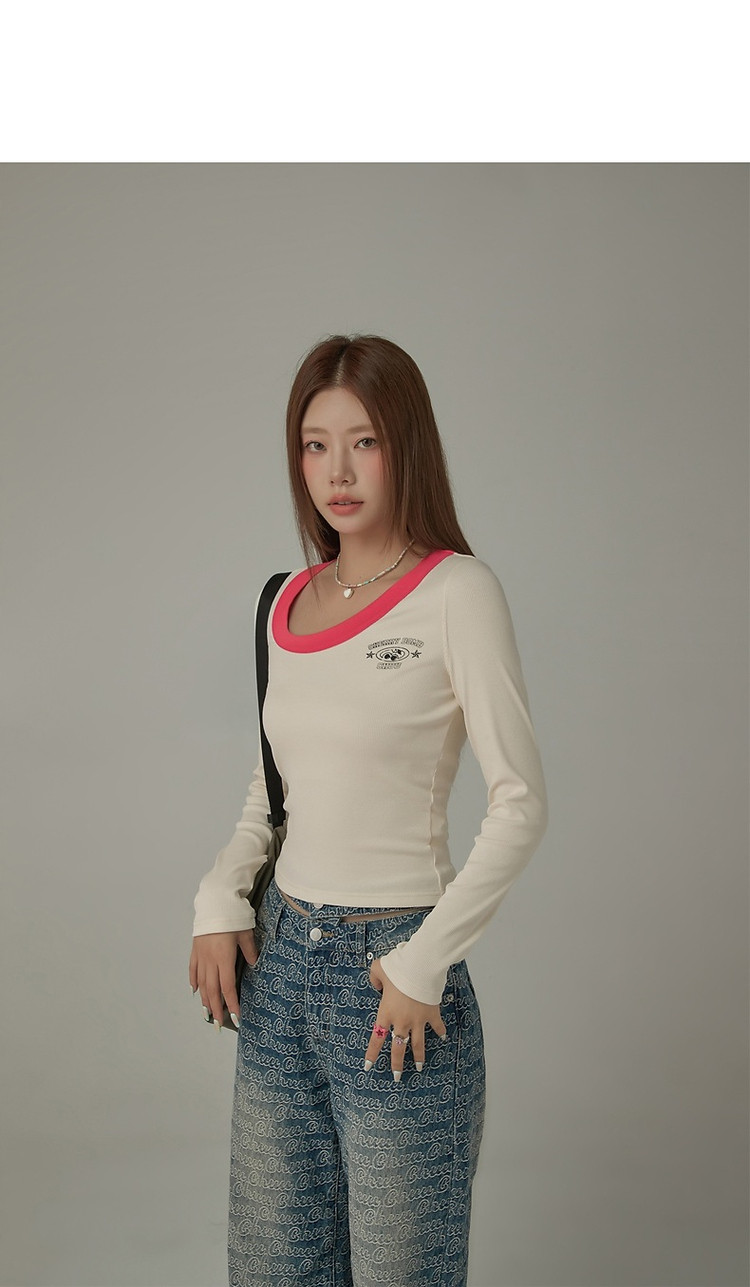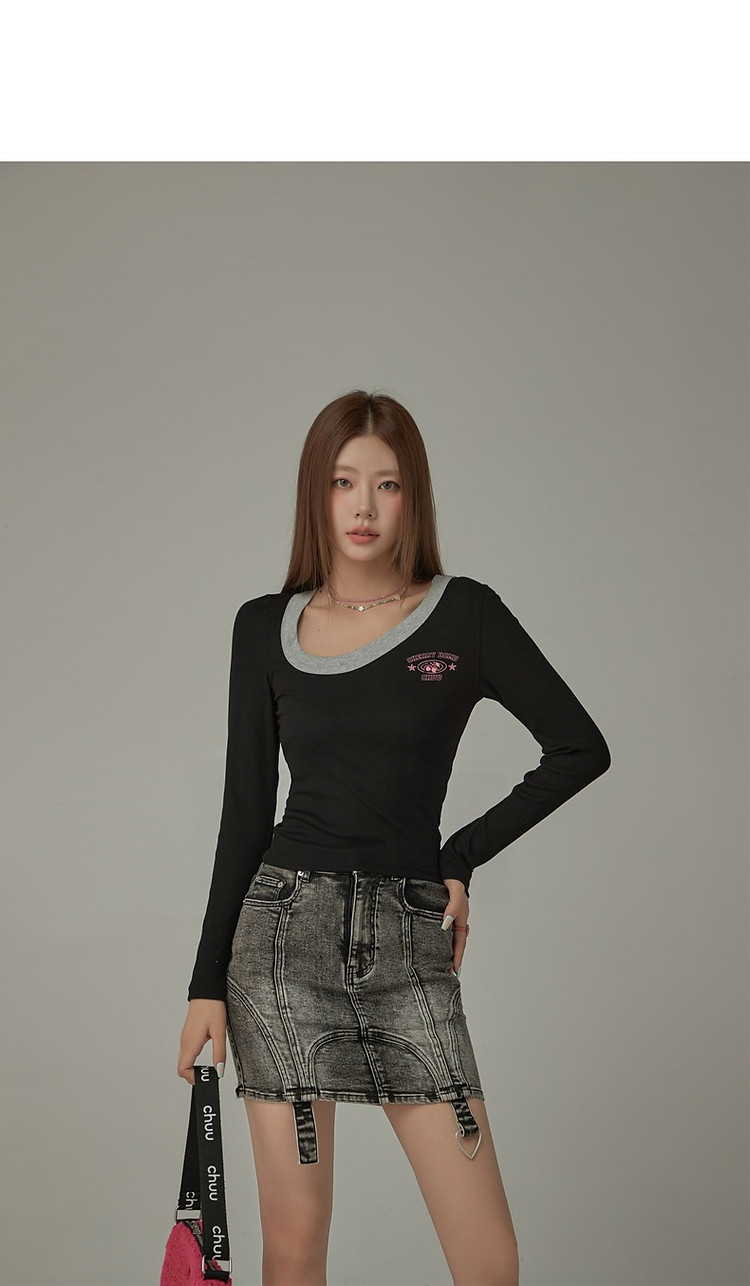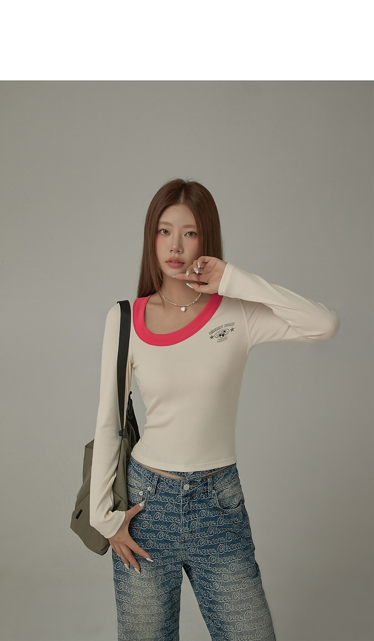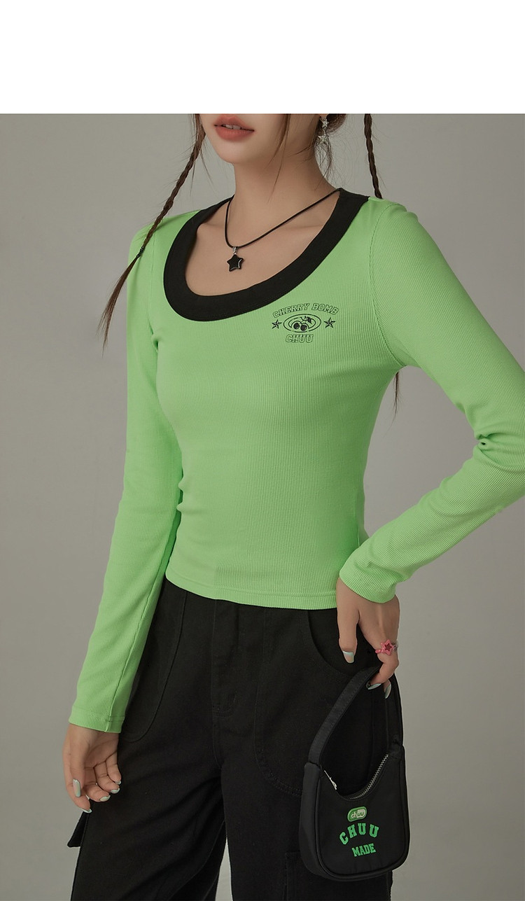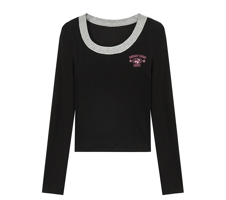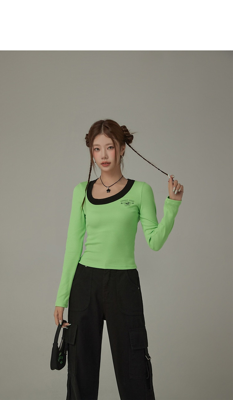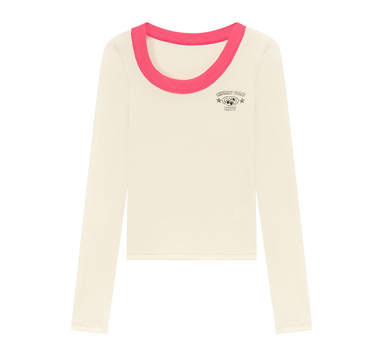 字母印花长袖T恤女春秋撞色拼接斜领修身打底上衣 342675
