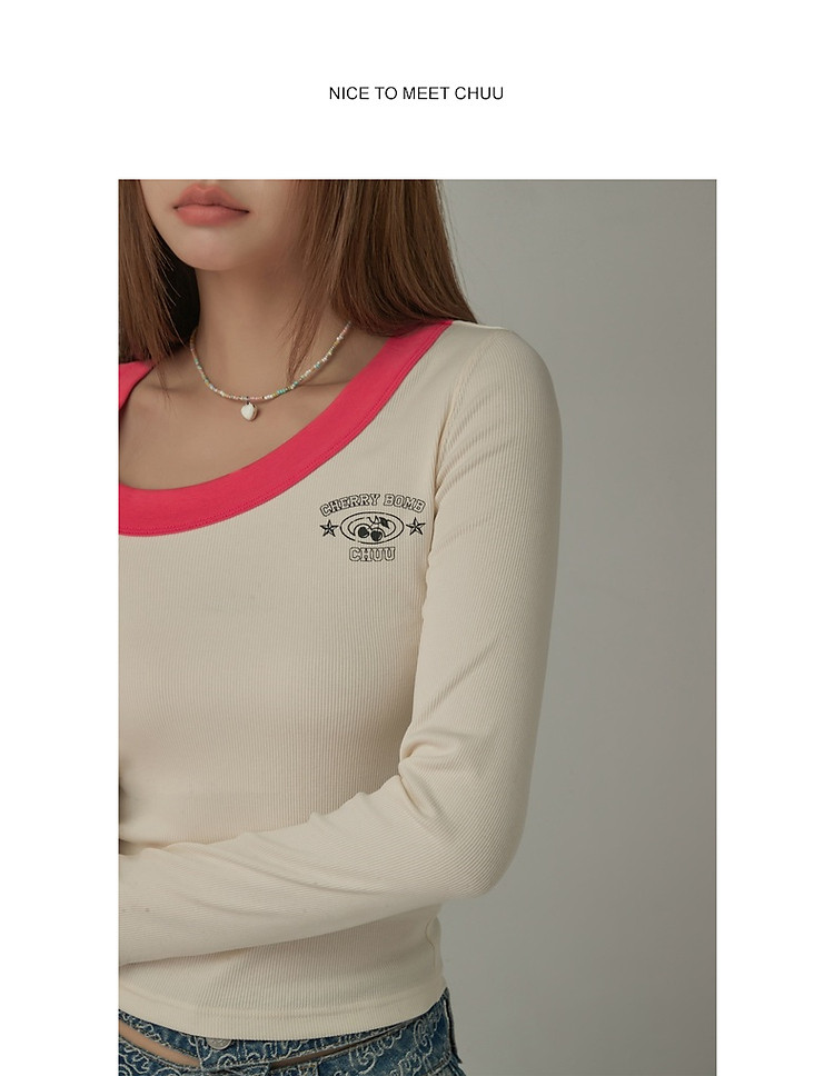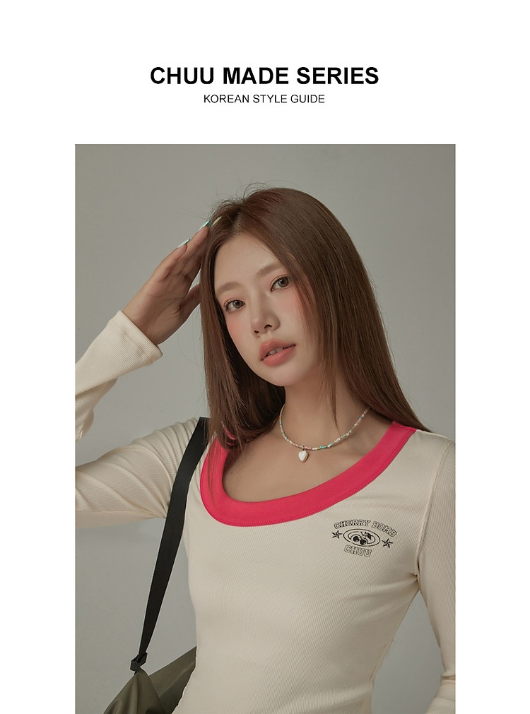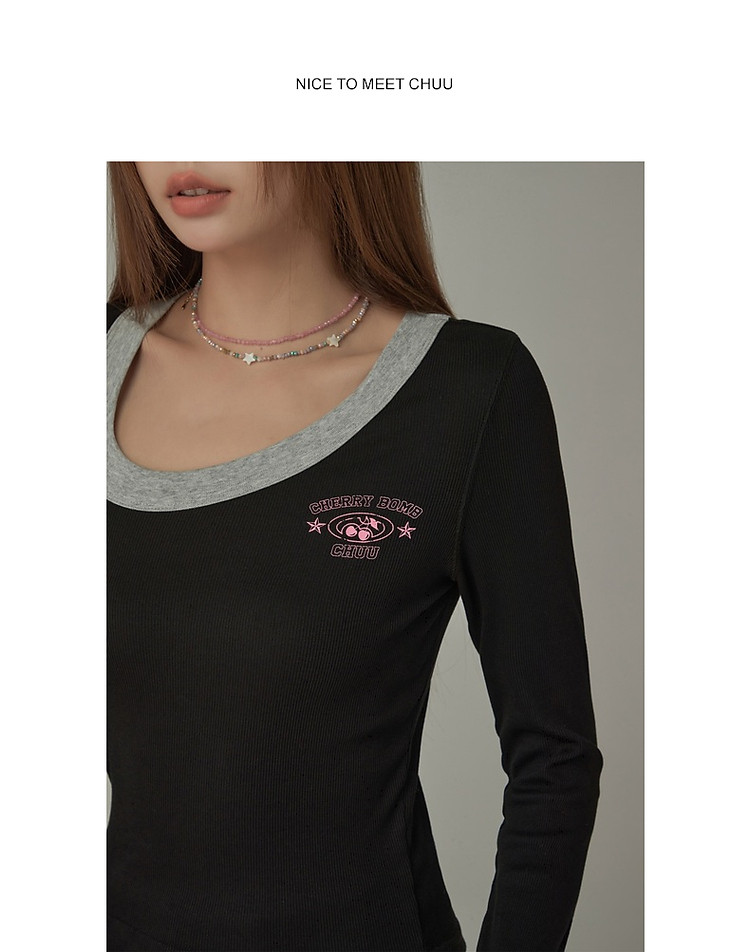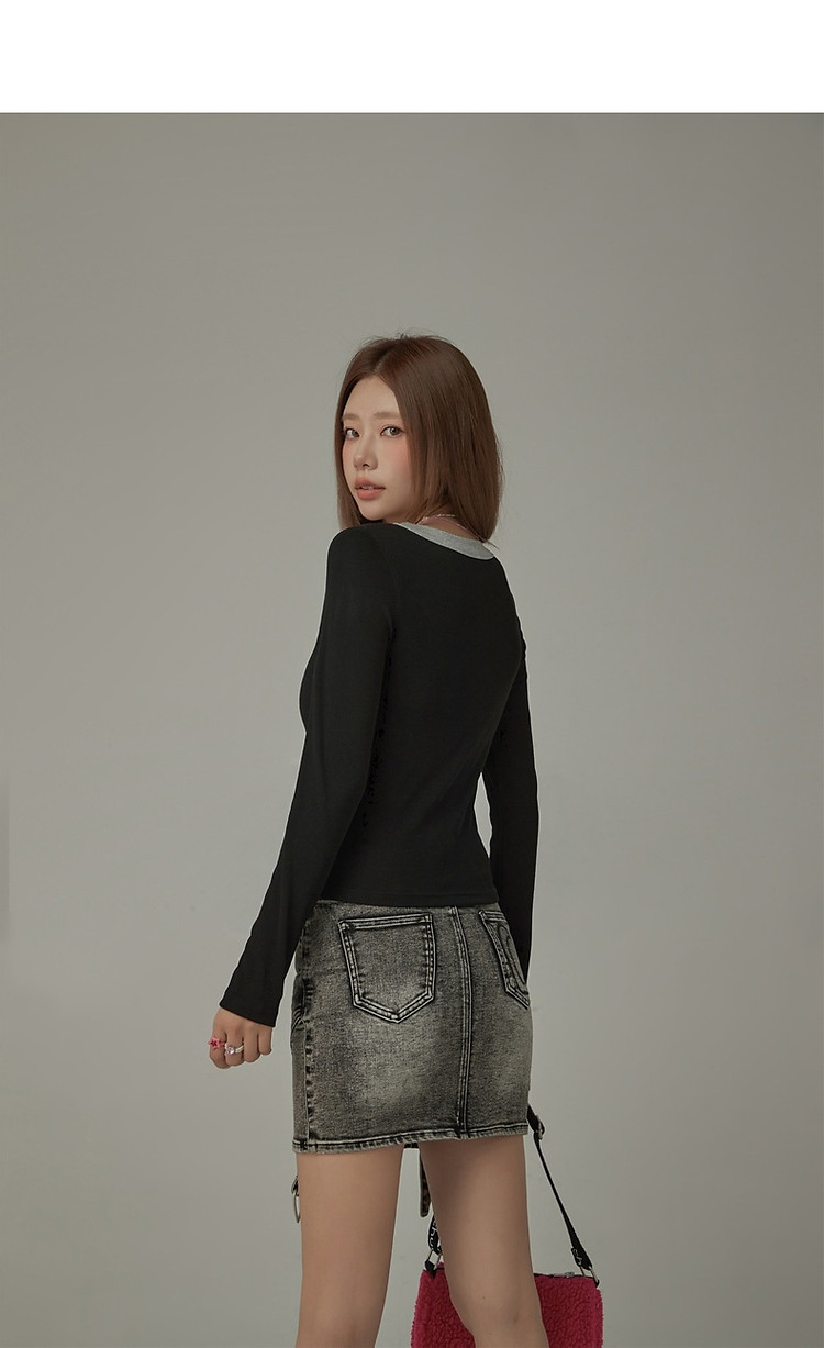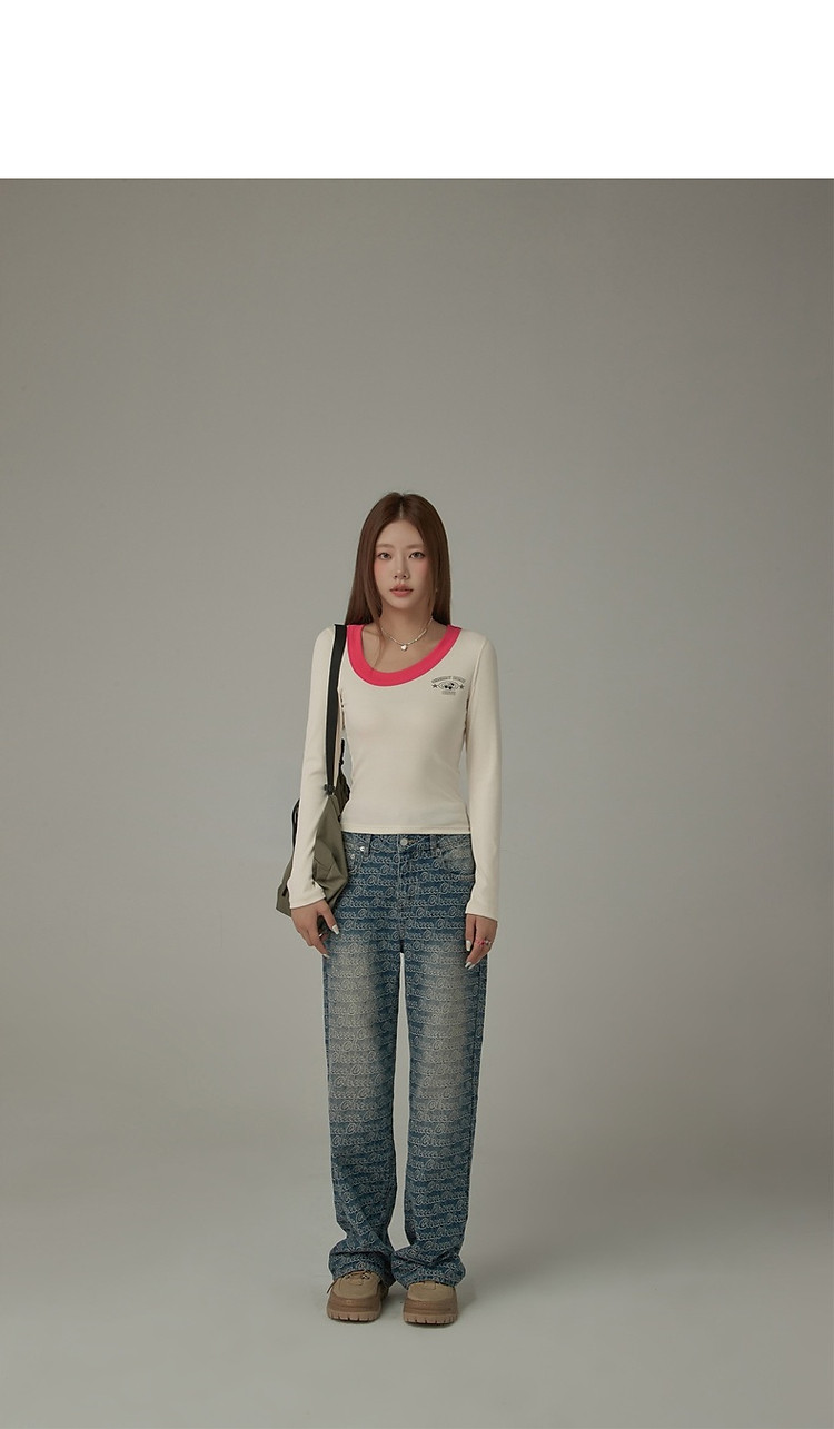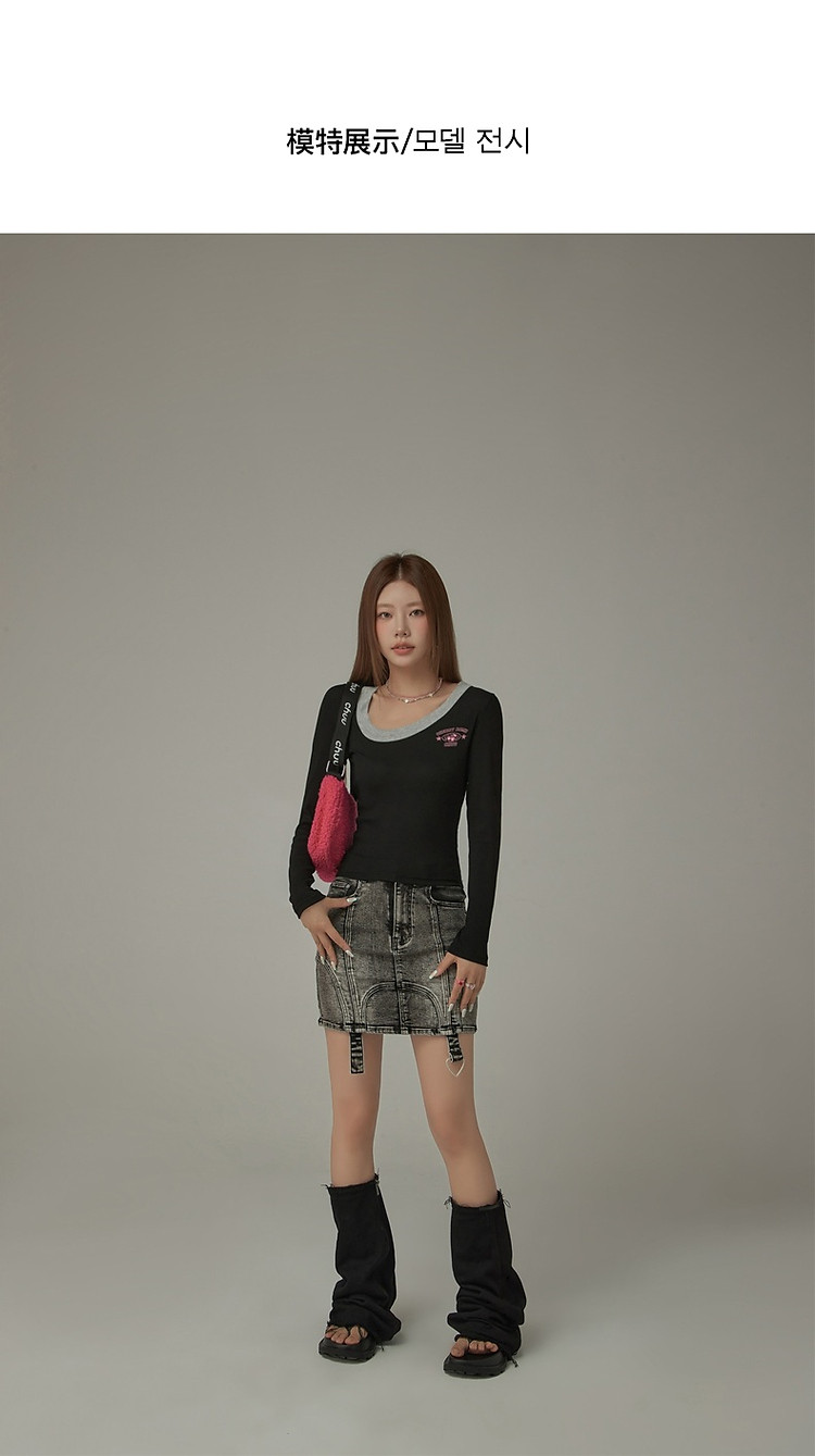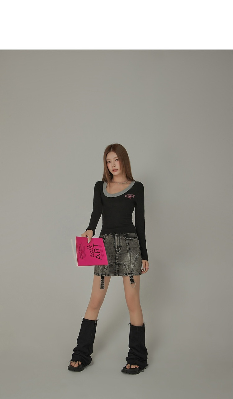 字母印花长袖T恤女春秋撞色拼接斜领修身打底上衣 342675