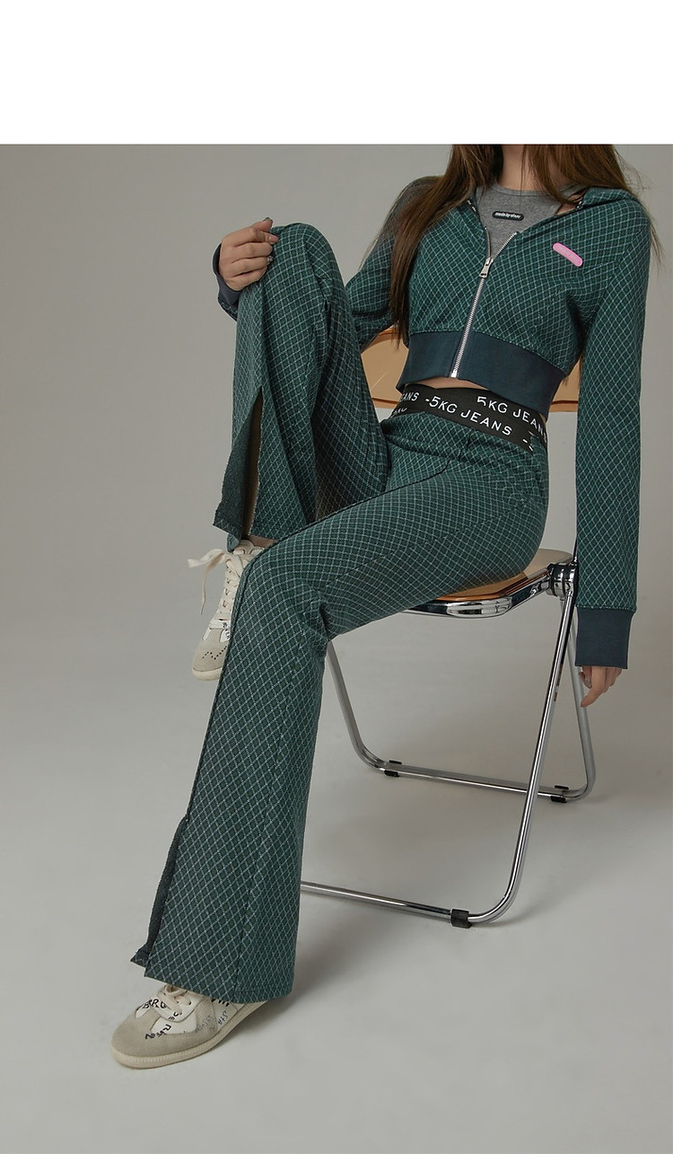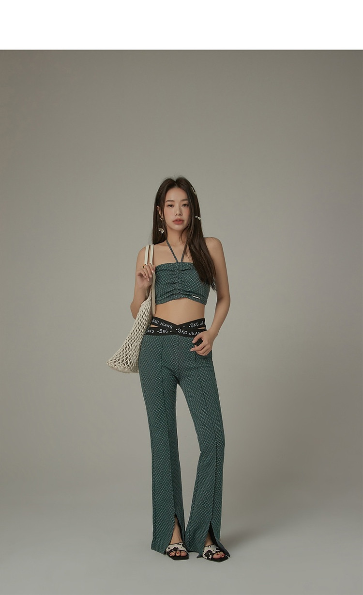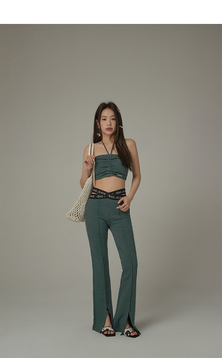 格子微喇休闲裤女春秋开叉修身交叉字母设计感长裤 094291