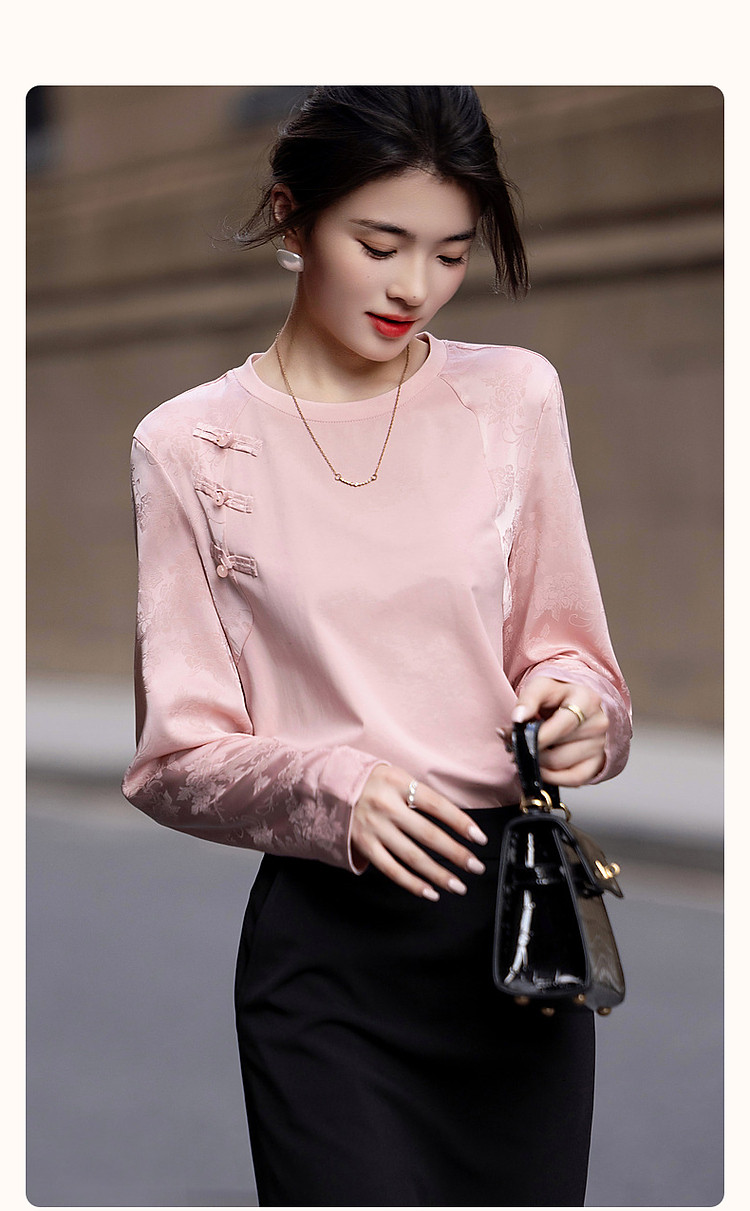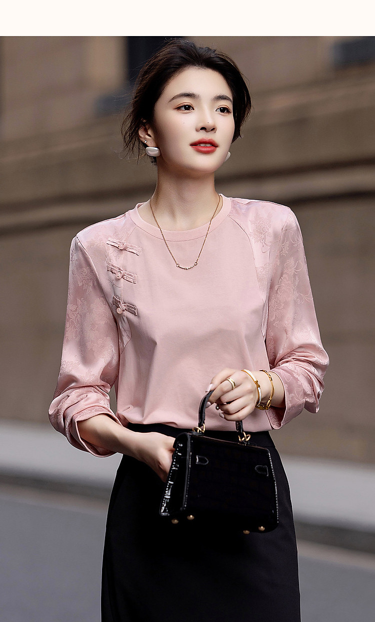 【粉妆玉人】秋温婉新中式国风圆领拼接长袖宽松藏肉女式卫衣 393089