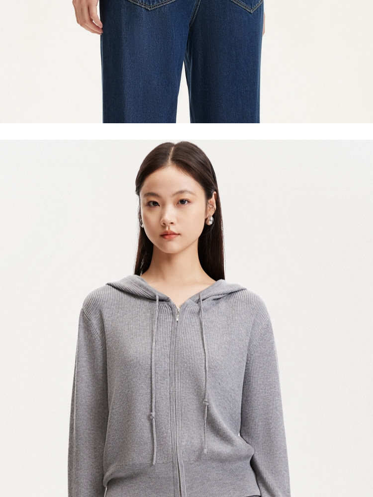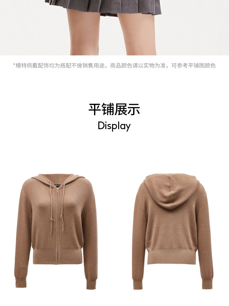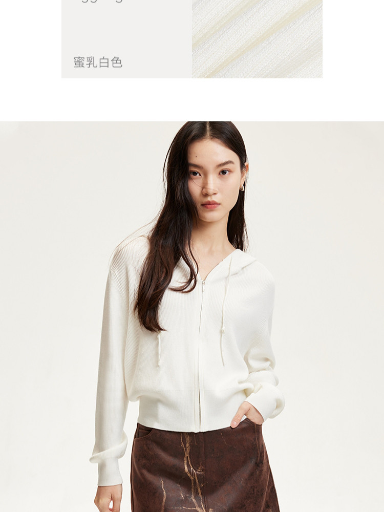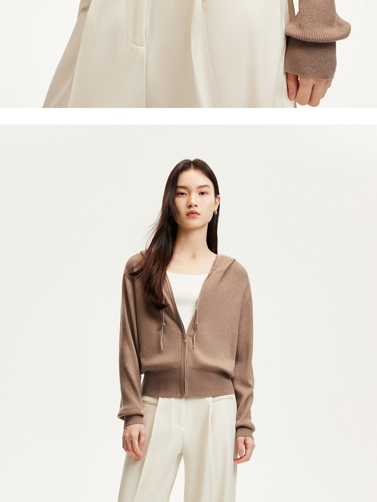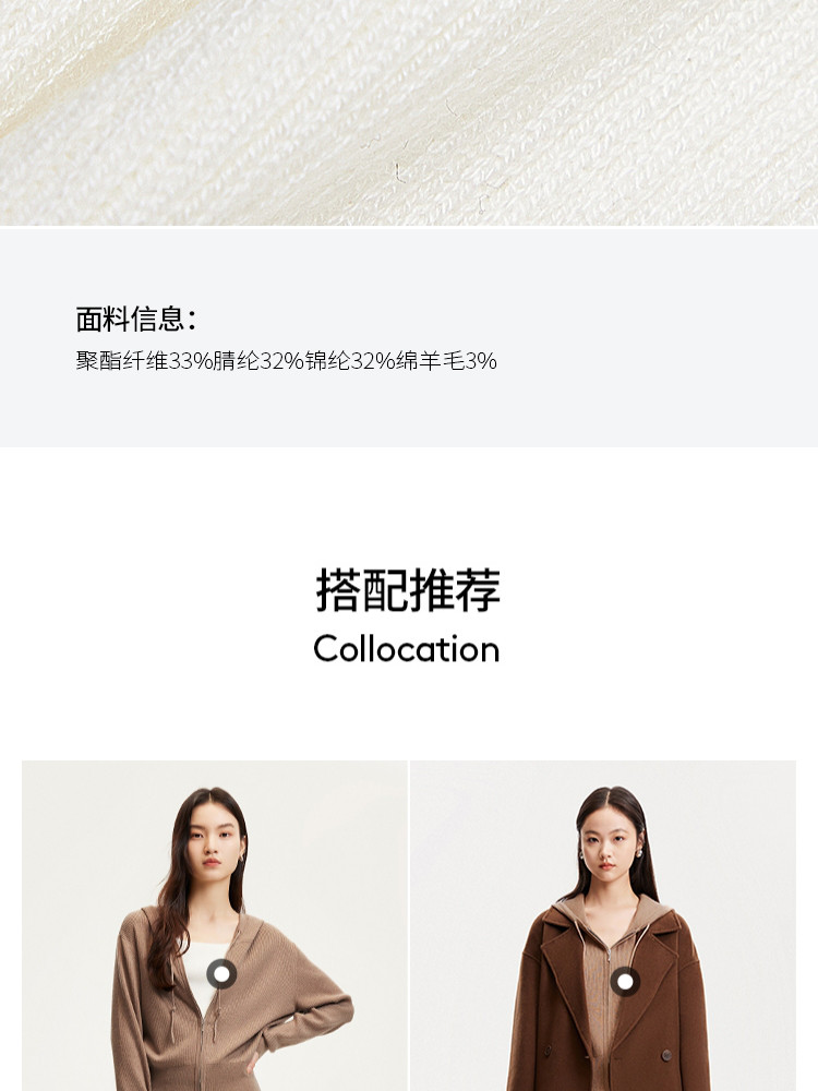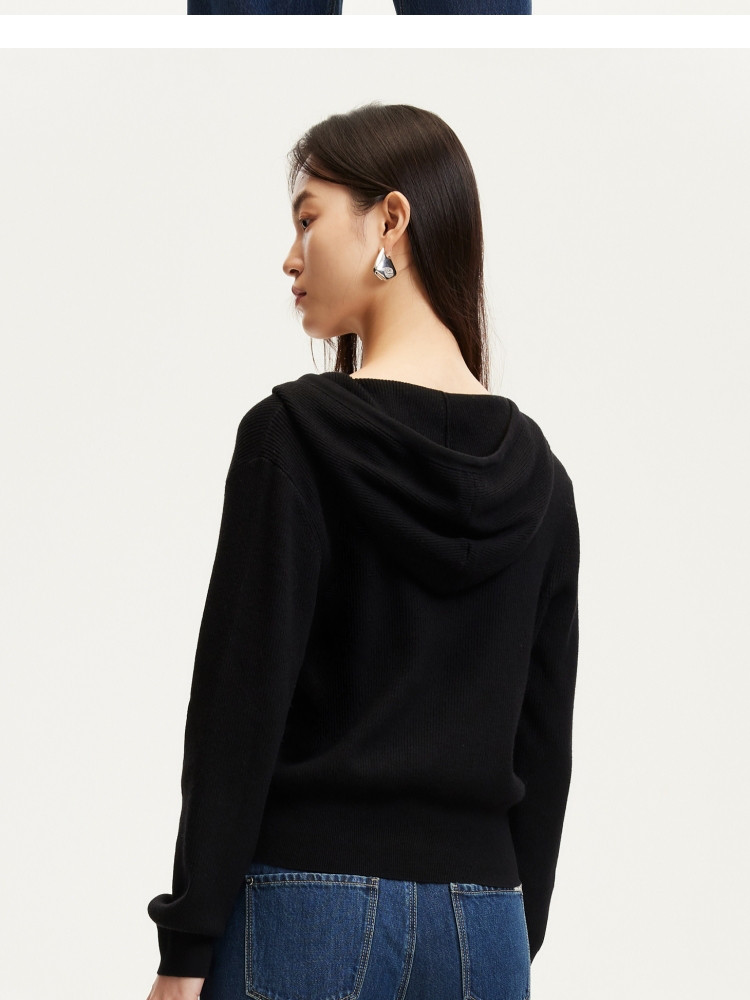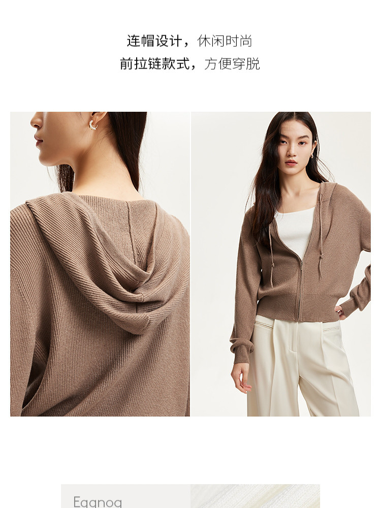 商品名称:针织衫女早含羊毛竖坑条连帽针织开衫简约休闲 179665