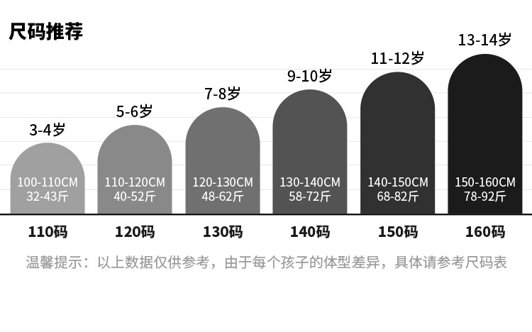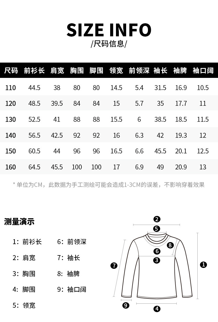 | 尺码 | 衣长(cm) | 肩宽(cm) | 身高(cm) | 袖长(cm) | 适合年龄 | 胸围(cm) | 号型 |