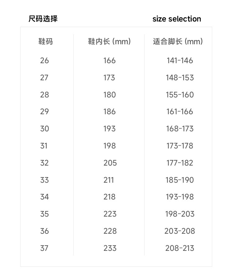| 尺码 | 鞋内长(mm) | 脚长(mm) |