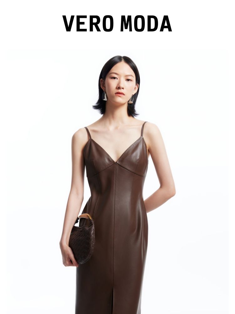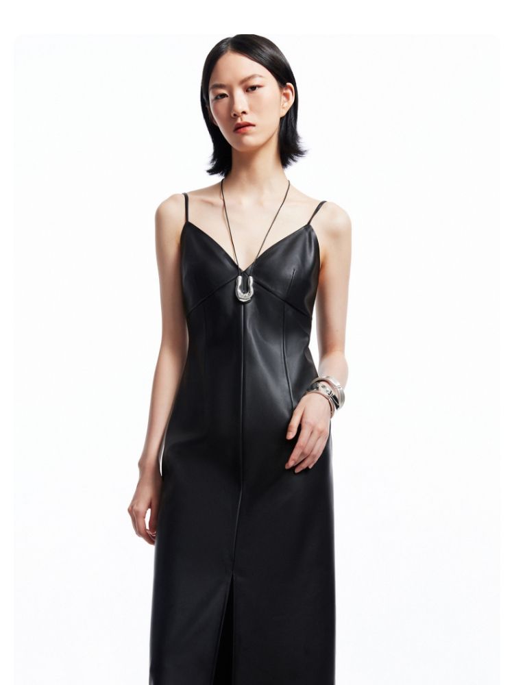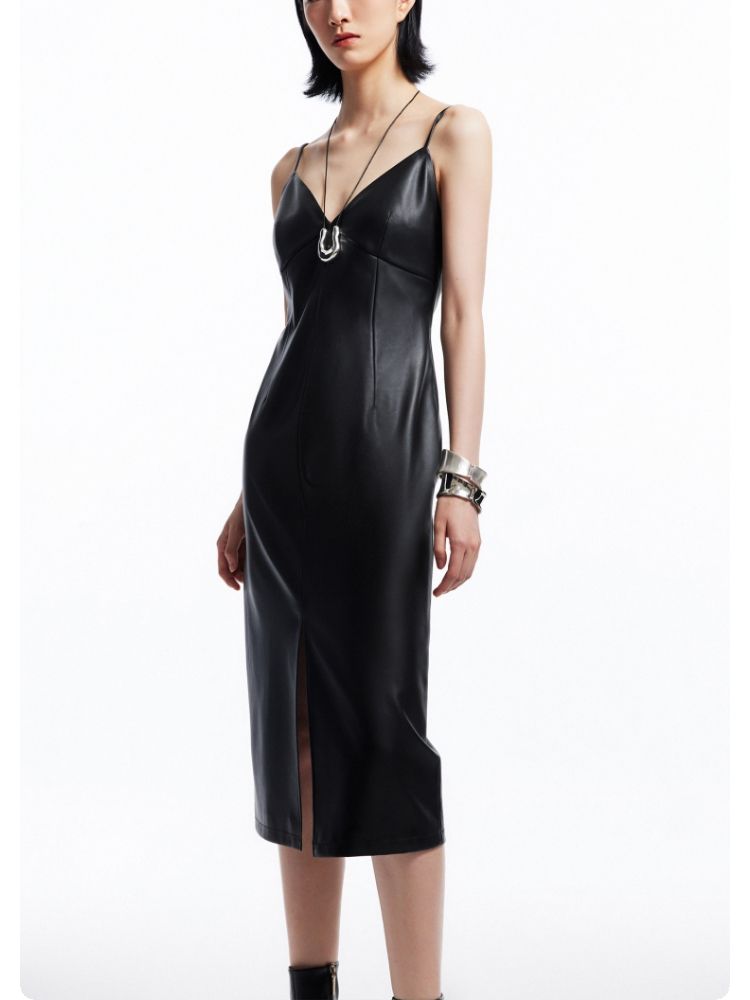 【直筒版型】连衣裙v领露背美拉德PU吊带开叉中长裙复古 893393