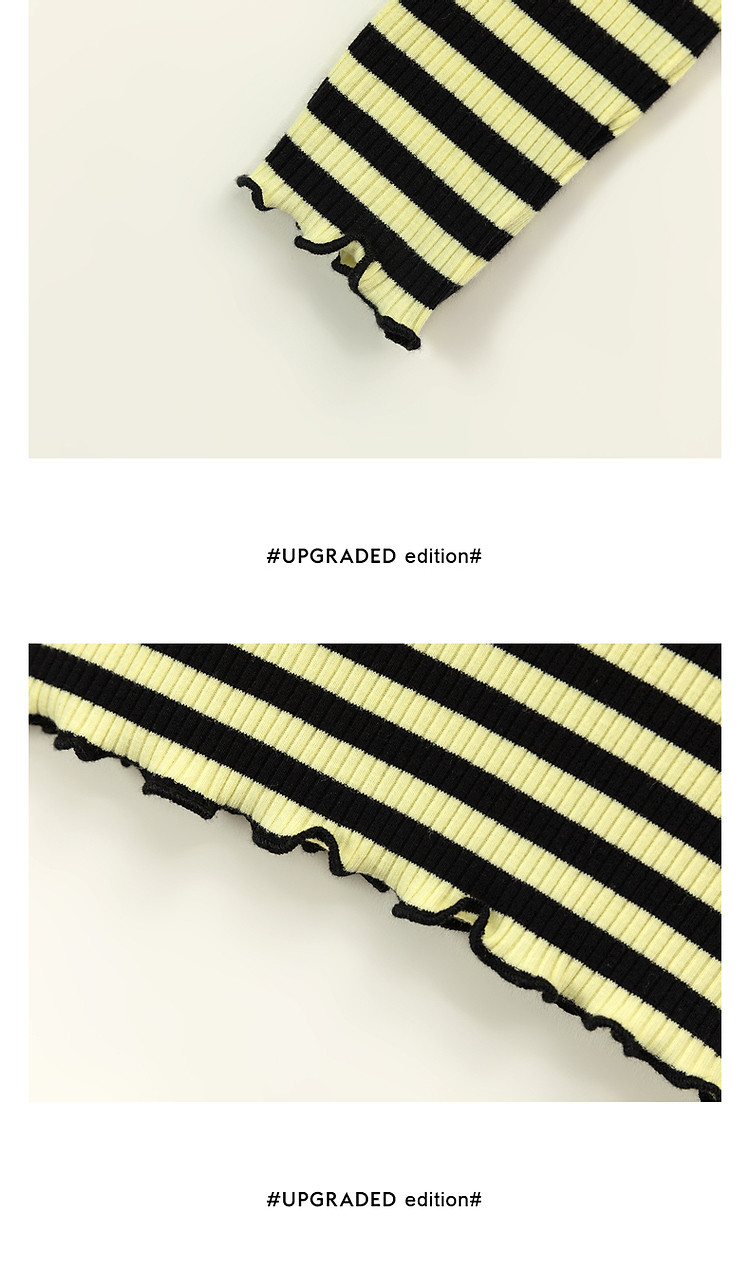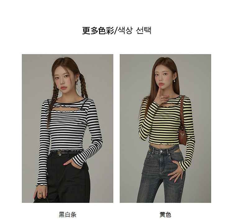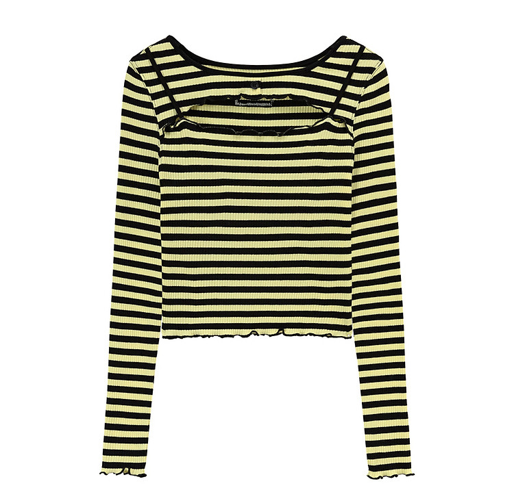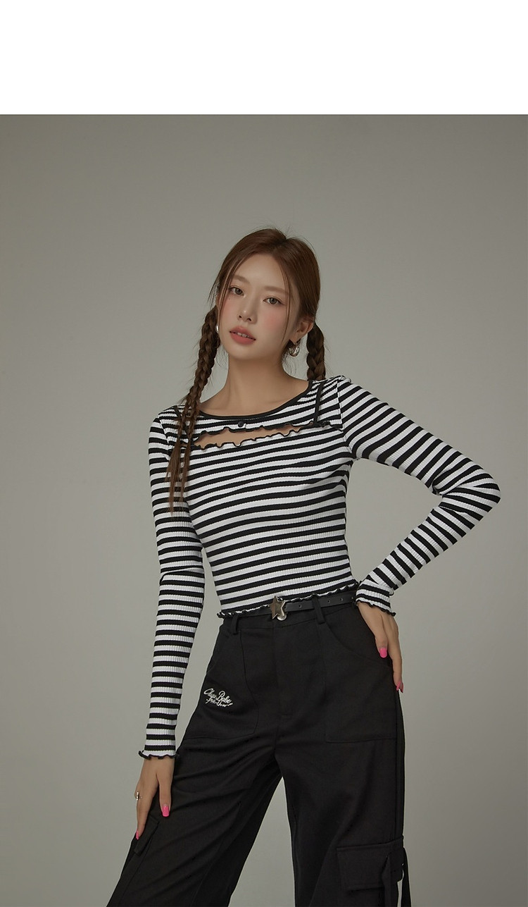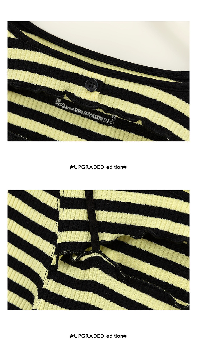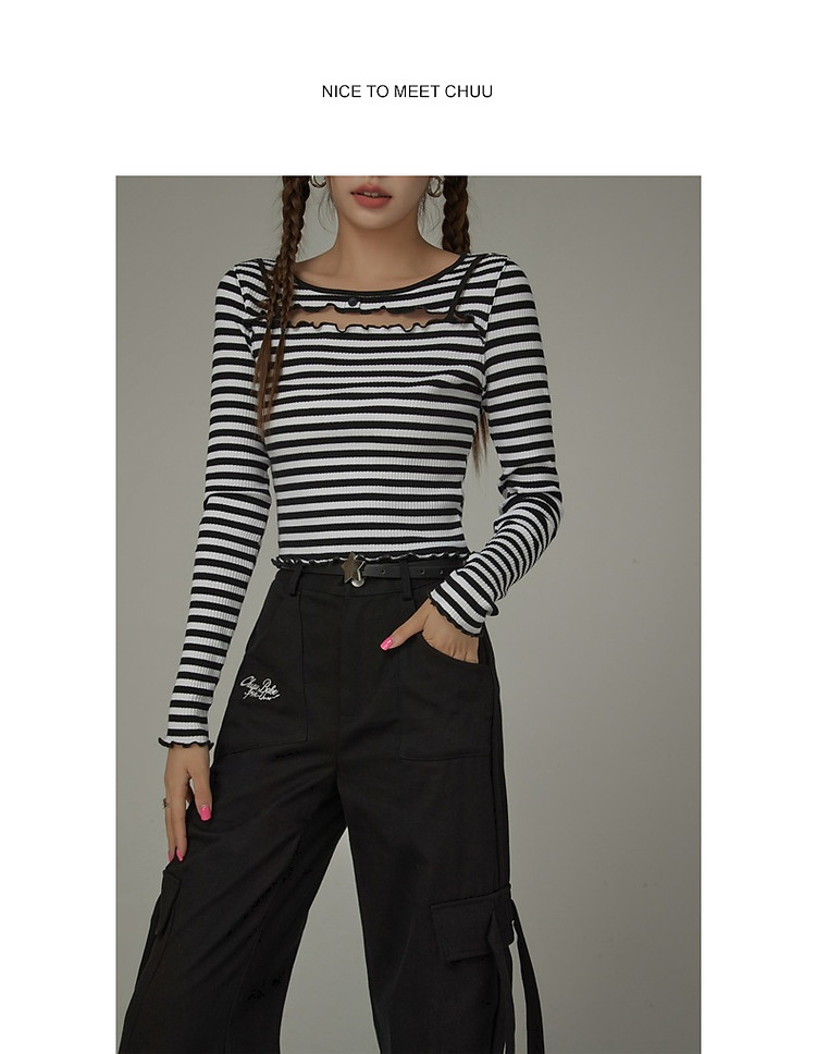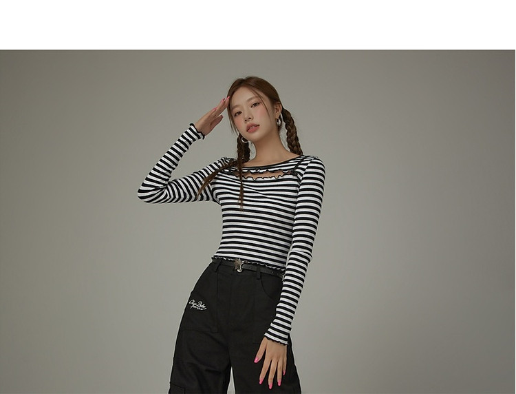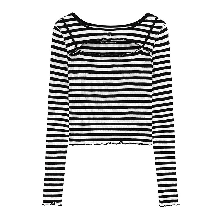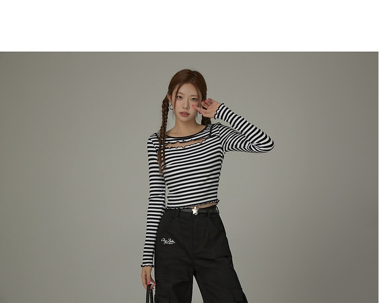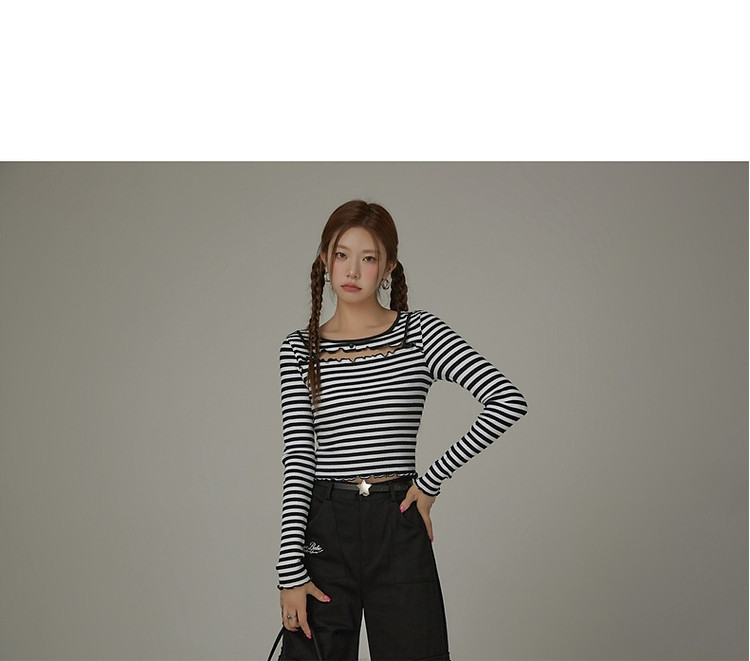 商品名称:条纹镂空T恤女春撞色木耳边长袖时尚短上衣 098259